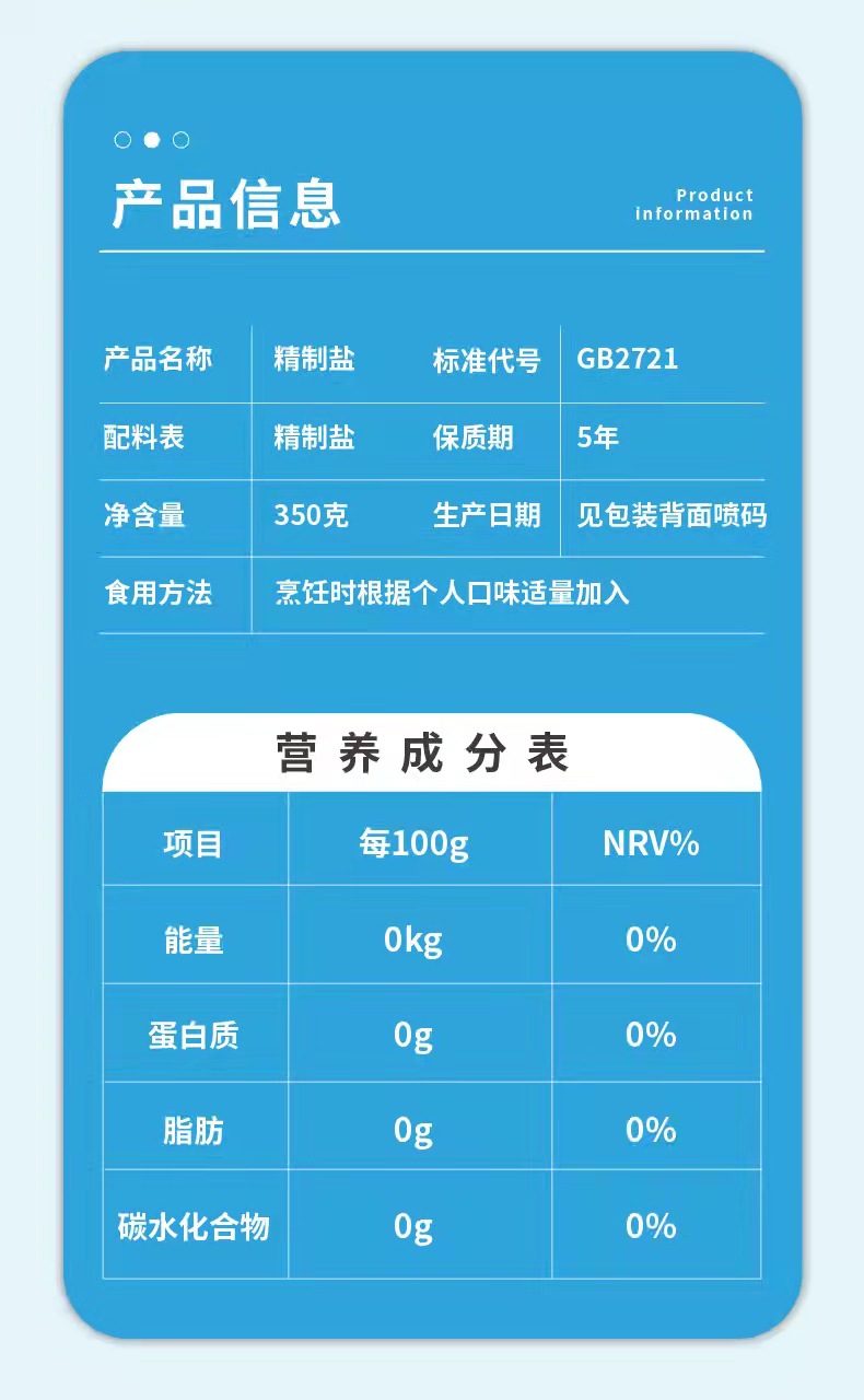 | 原料与配料 | 精制盐 | 净重(规格) | 350g |