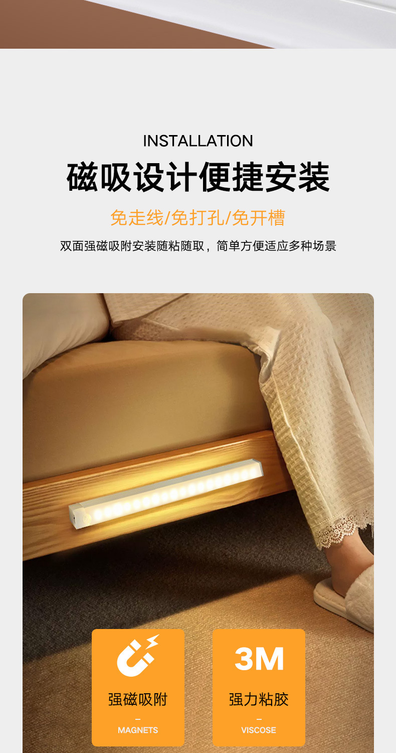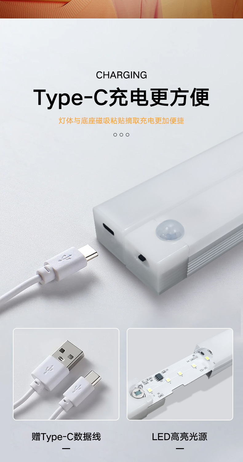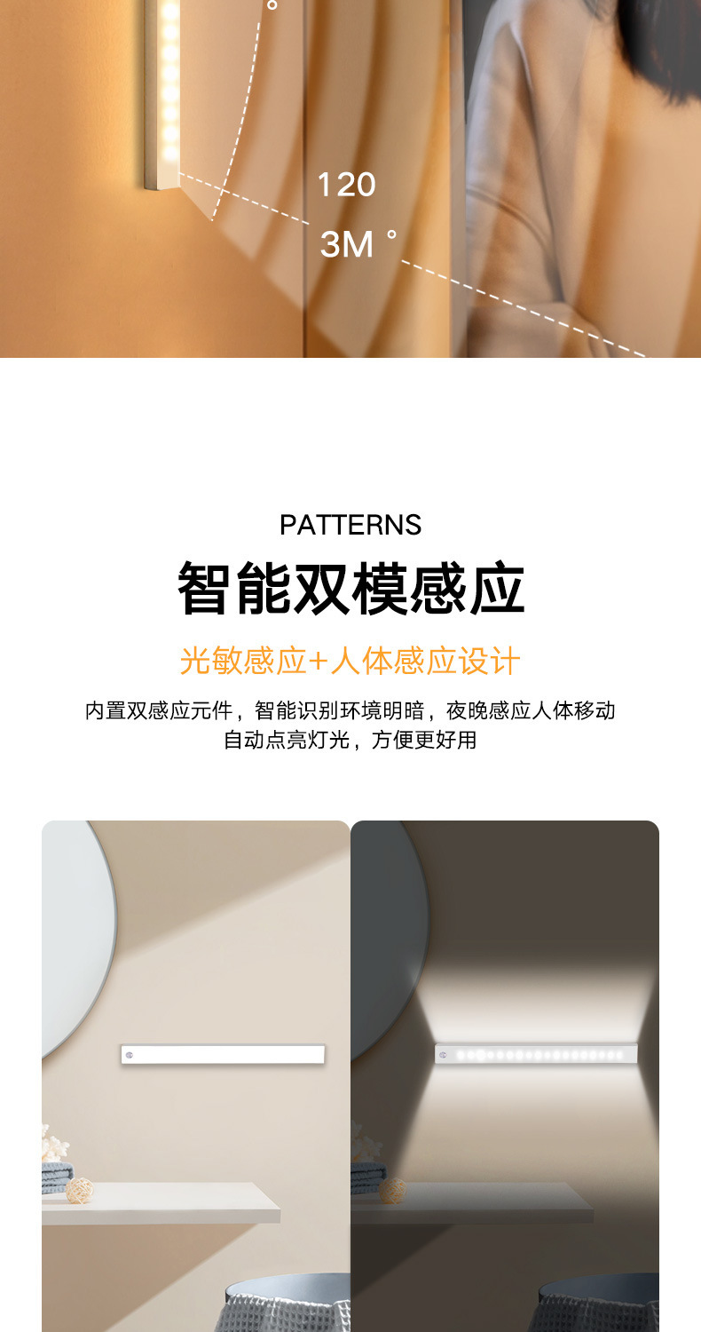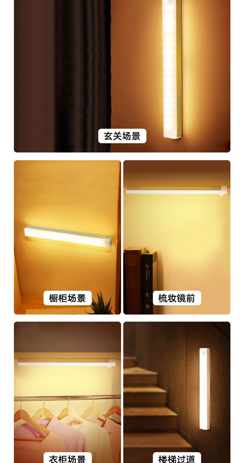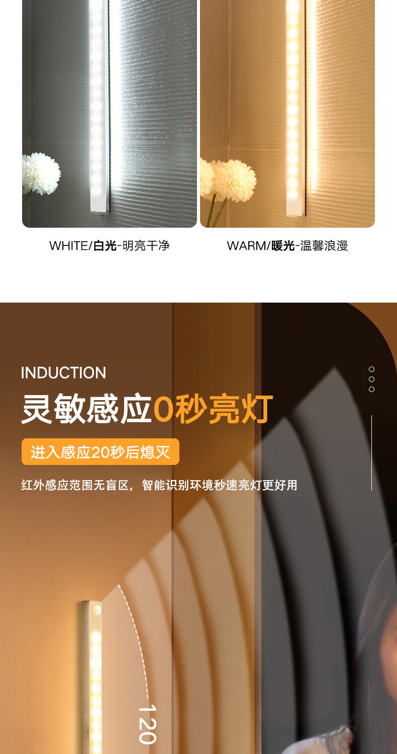 따뜻하고 차가운 빛 지능형 인간 LED 센서 빛 자기 접착 통로 와인 캐비닛 옷장 캐비닛 충전식 야간 조명