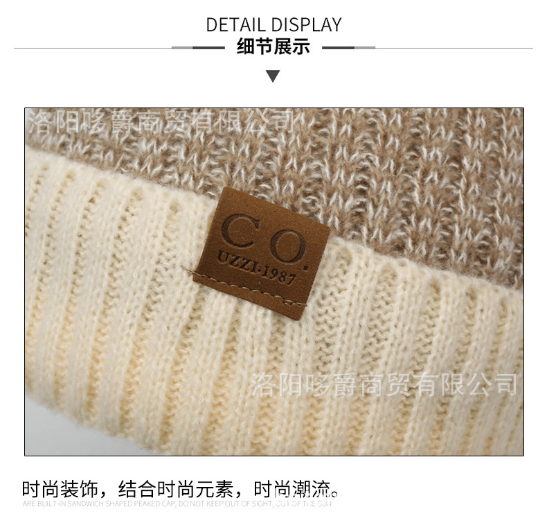 | 场景 | 冬天户外滑雪跑步保暖套头帽 | 款式细节 | 双色CO字母标加绒针织帽 |