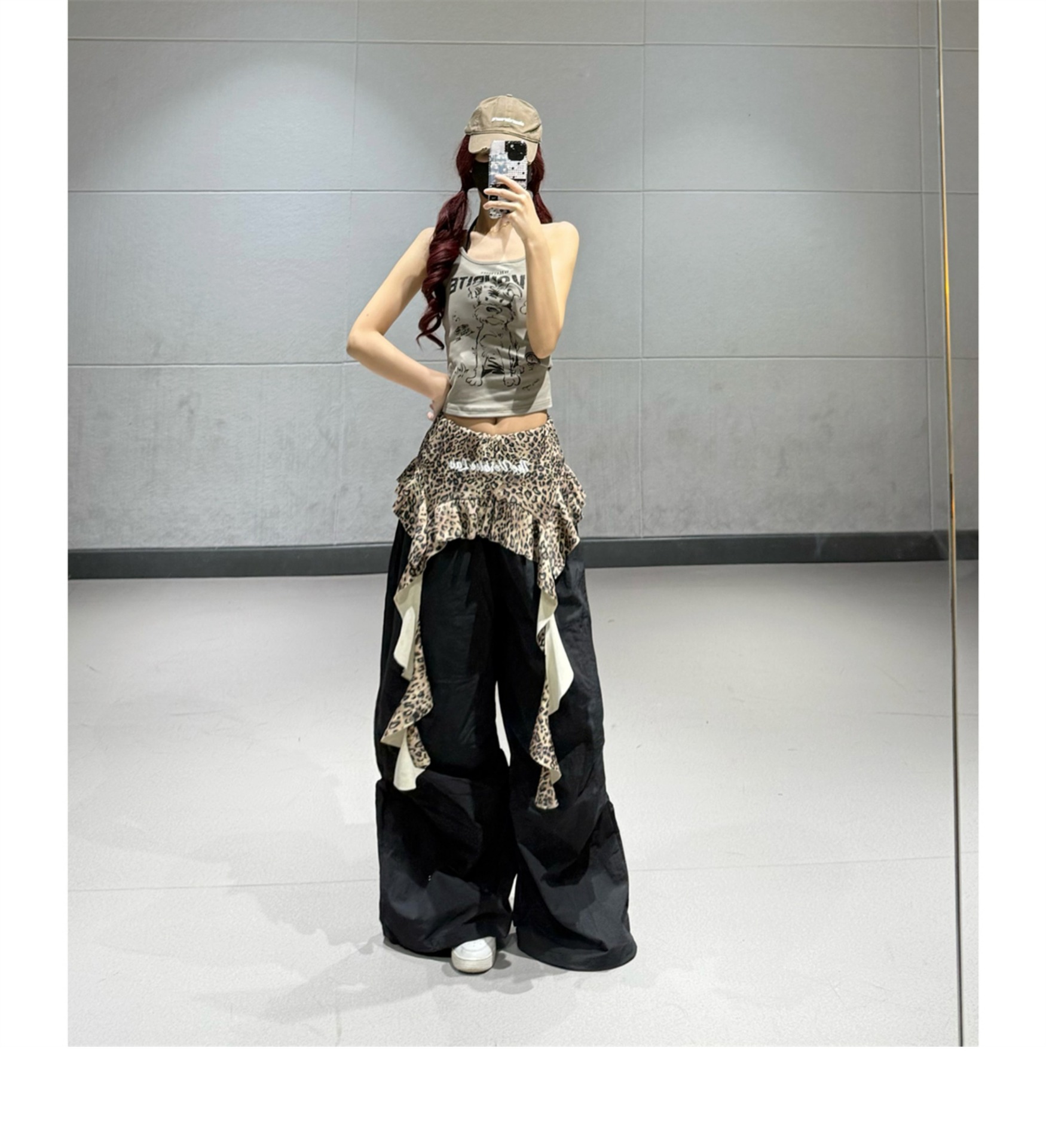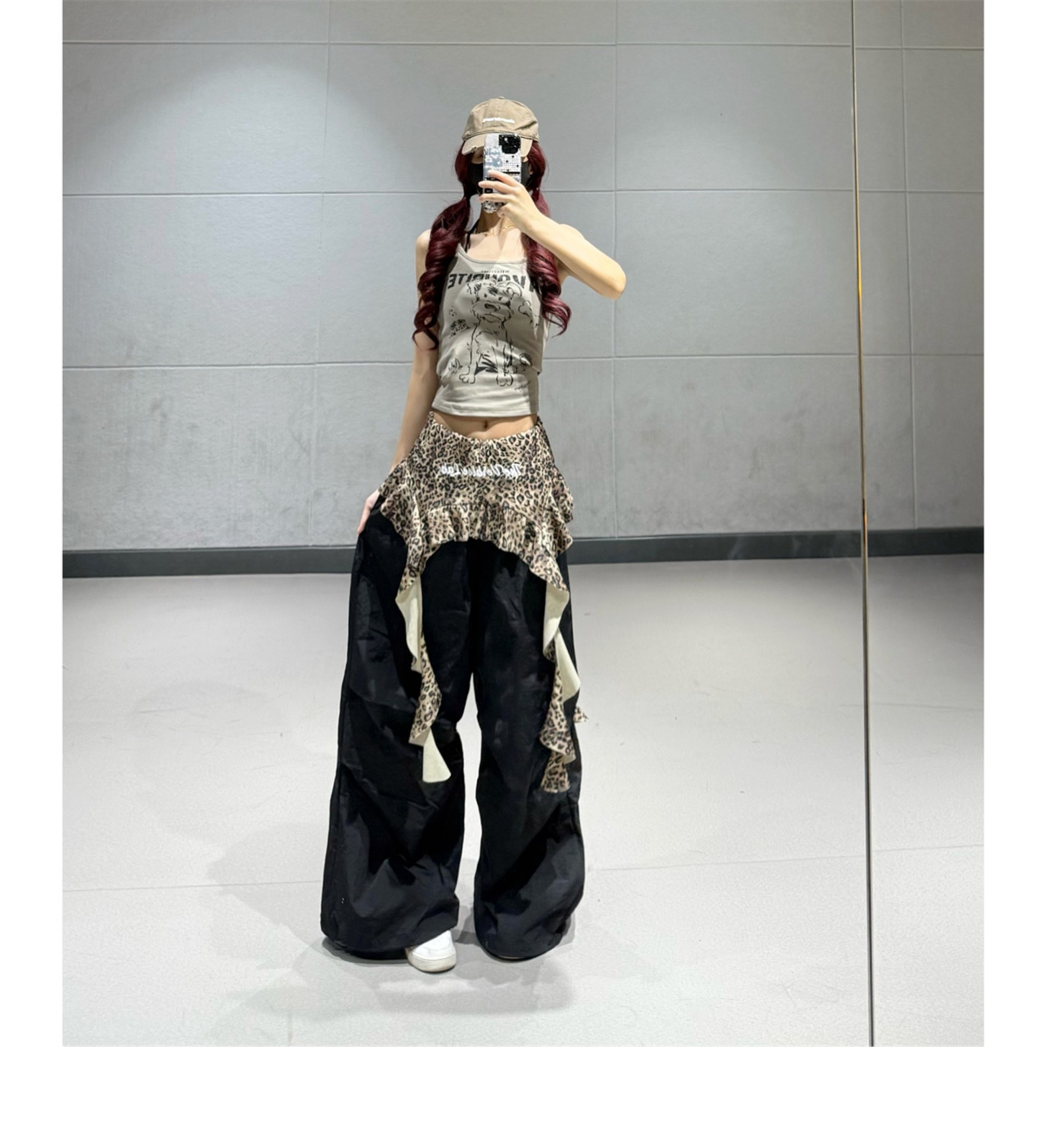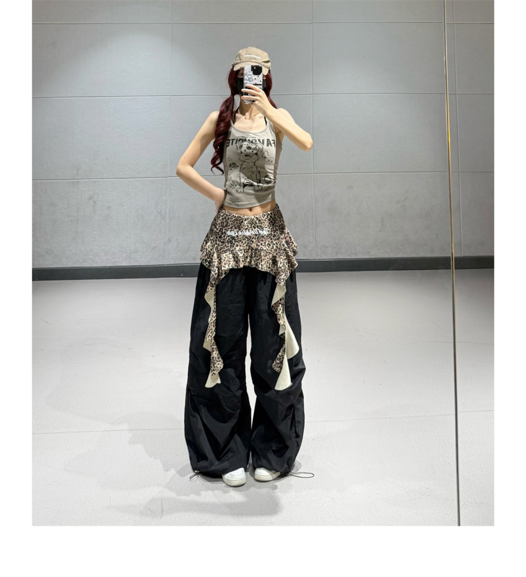 아메리칸 레트로 레오파드 프린트 힙 커튼 디자인 플리츠 작업복 낙하산 바지 여성 여름 트렌디 와이드 레그 스트리트 댄스 재즈 바지