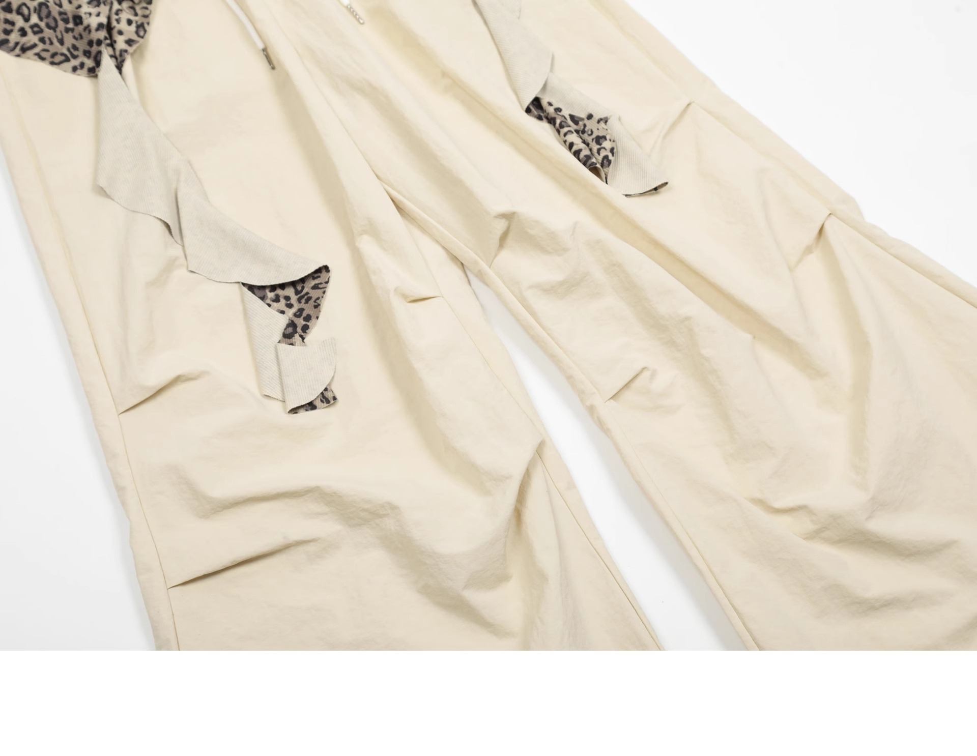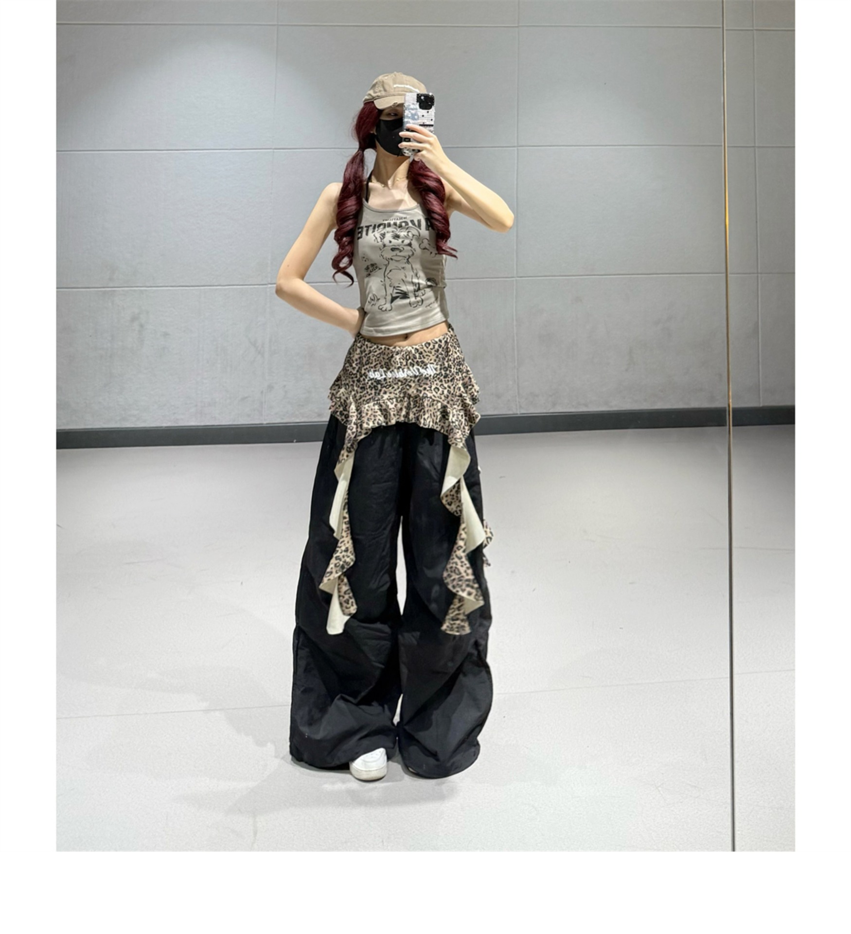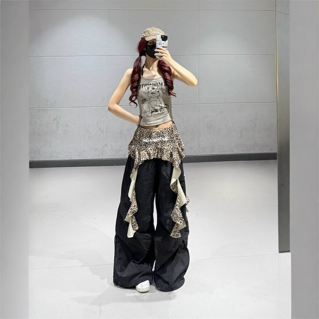아메리칸 레트로 레오파드 프린트 힙 커튼 디자인 플리츠 작업복 낙하산 바지 여성 여름 트렌디 와이드 레그 스트리트 댄스 재즈 바지