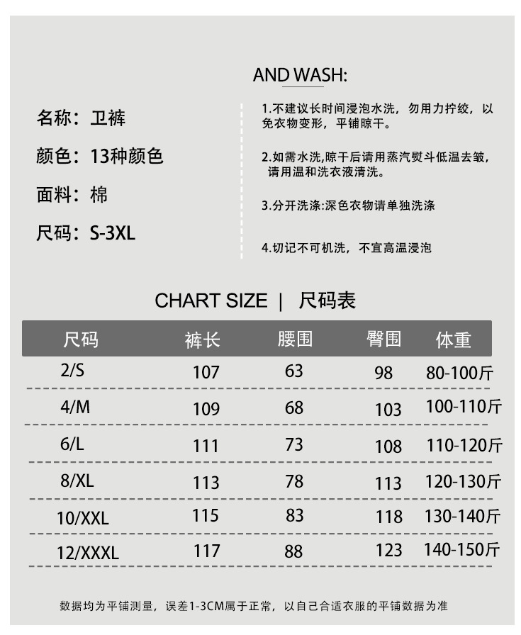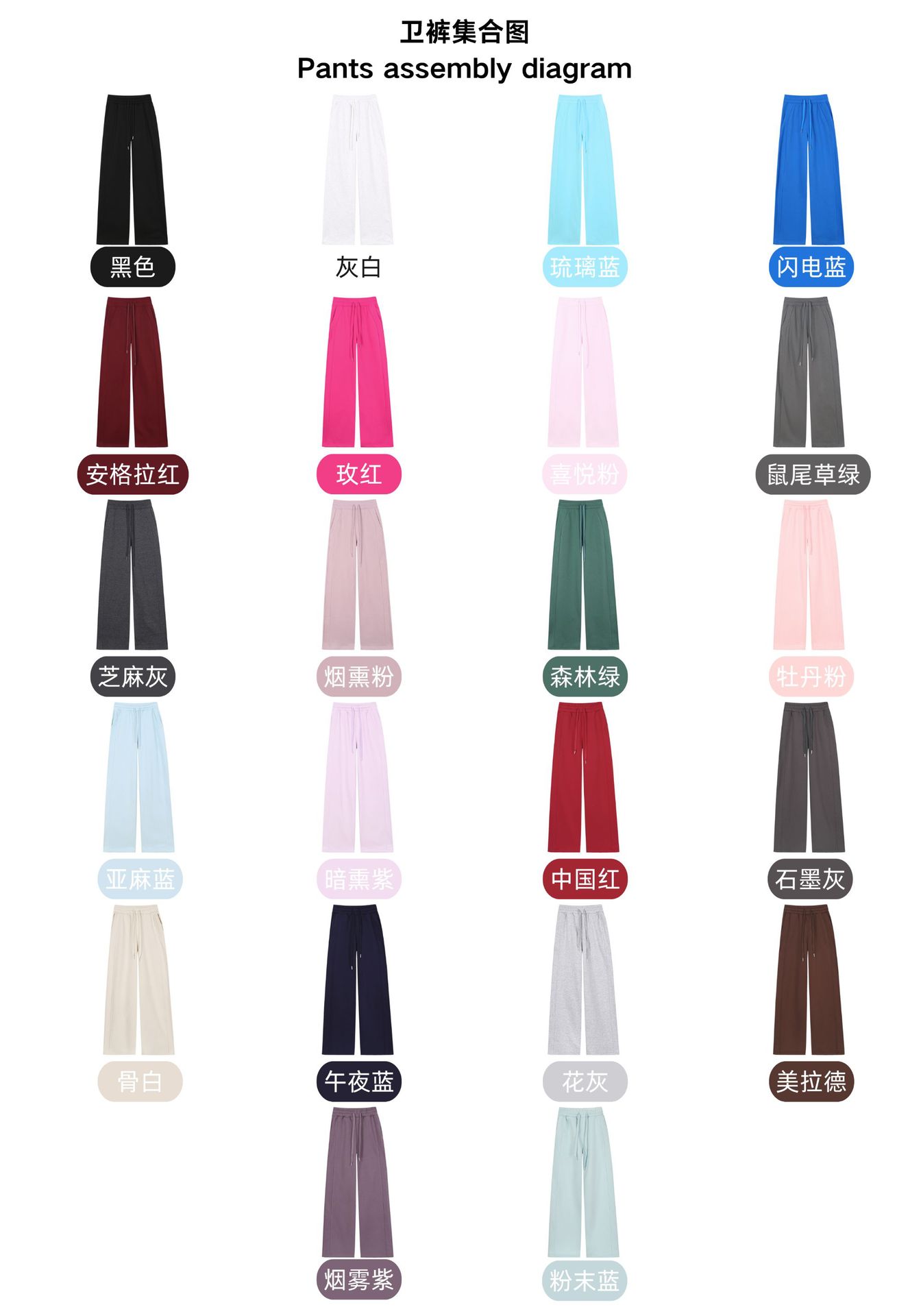 | 颜色 | 黑色款卫裤, 灰白款卫裤, 骨白款卫裤, 亚麻蓝卫裤, 暗薰紫卫裤, 中国红卫裤, 粉末蓝卫裤, 烟雾紫卫裤, 美拉德卫裤, 花灰款卫裤, 牡丹粉卫裤, 石墨灰卫裤, 午夜蓝卫裤, 烟熏紫卫裤, 森林绿卫裤, 芝麻灰卫裤, 鼠尾草绿卫裤, 喜悦粉卫裤, 玫红色卫裤, 闪电蓝卫裤, 安格拉红卫裤, 琉璃蓝卫裤 | 功能 | 宽松 |