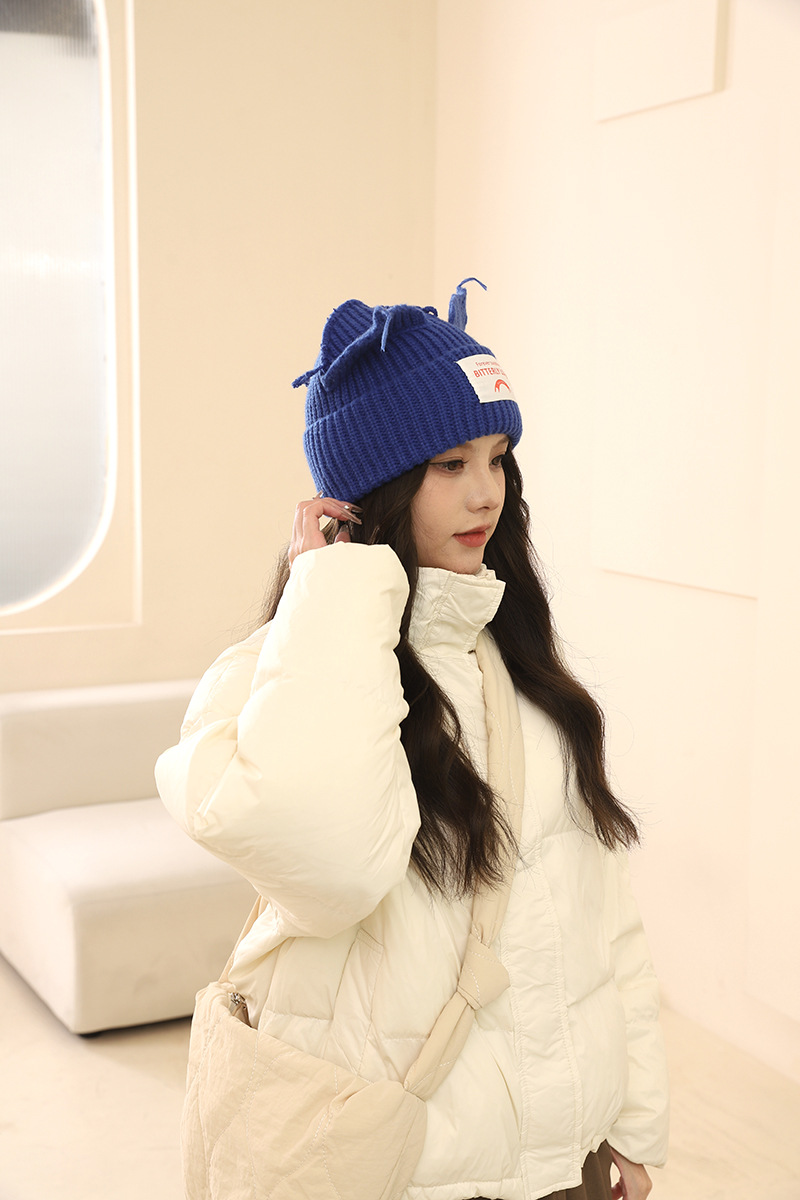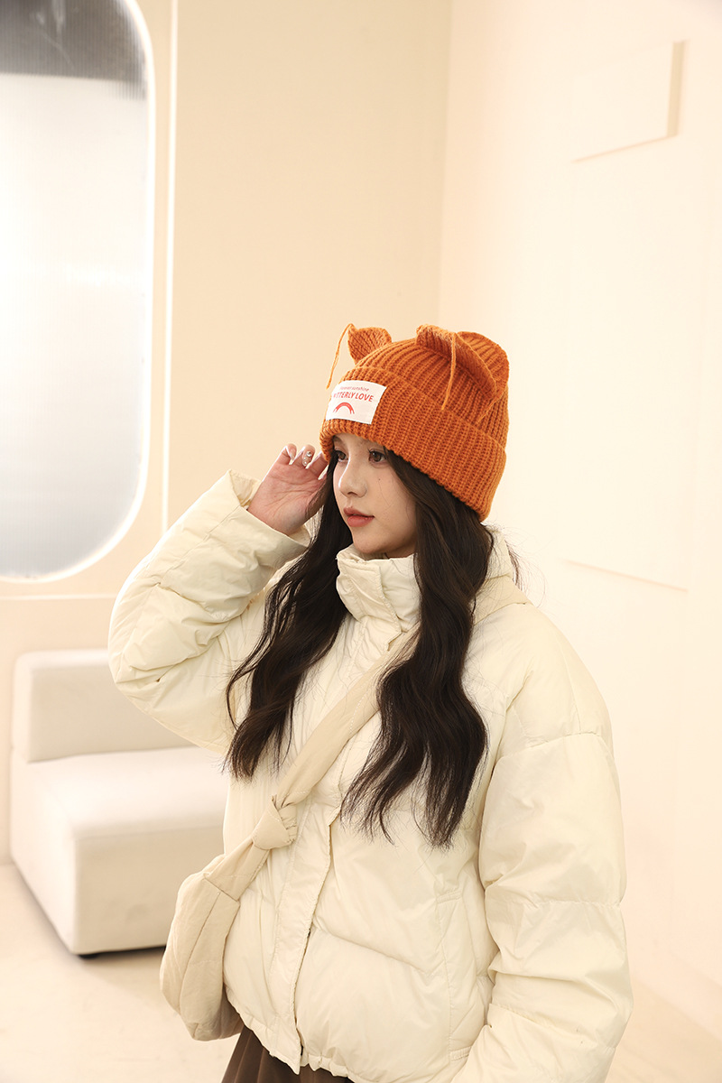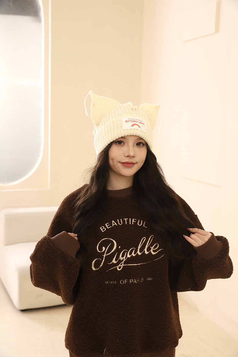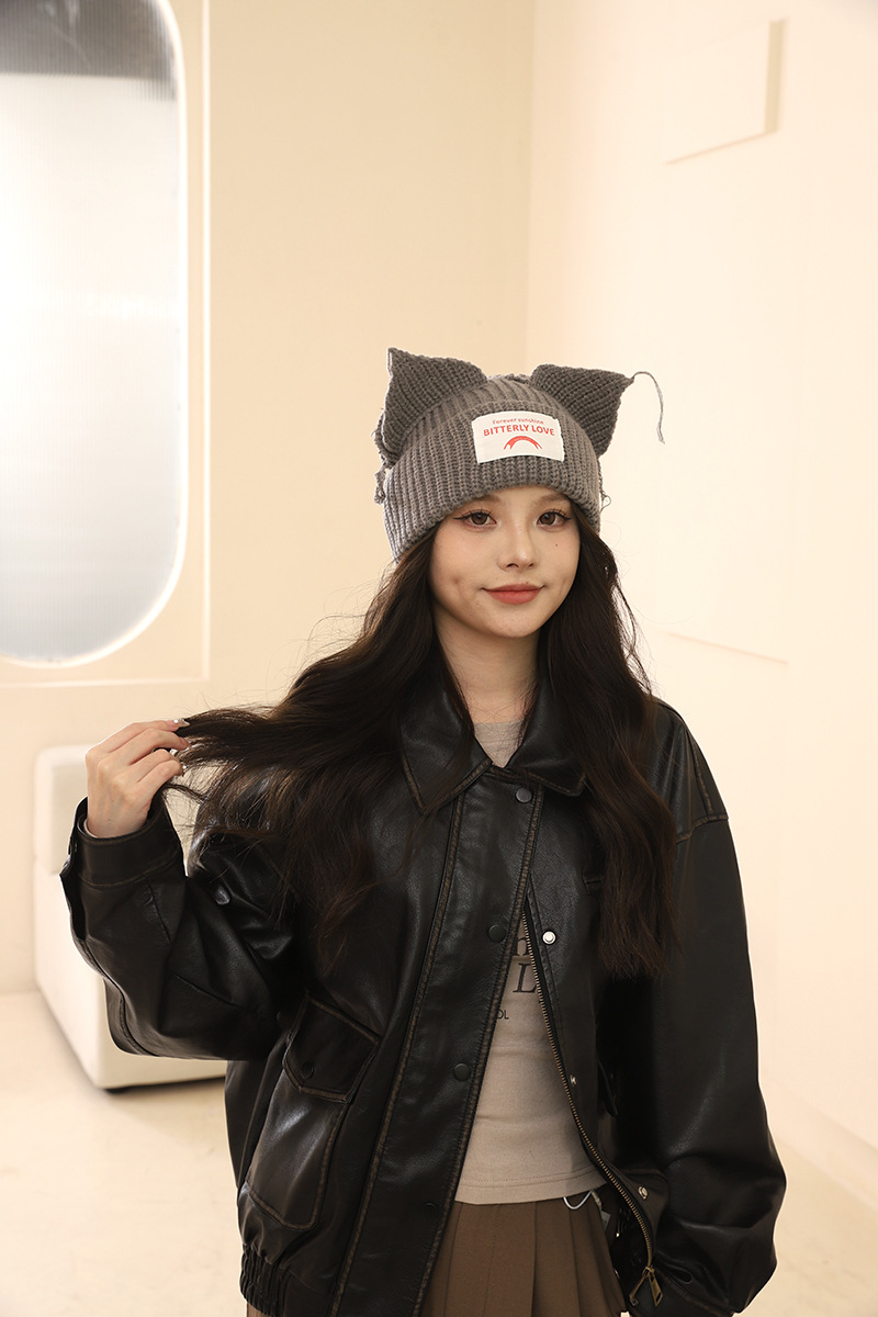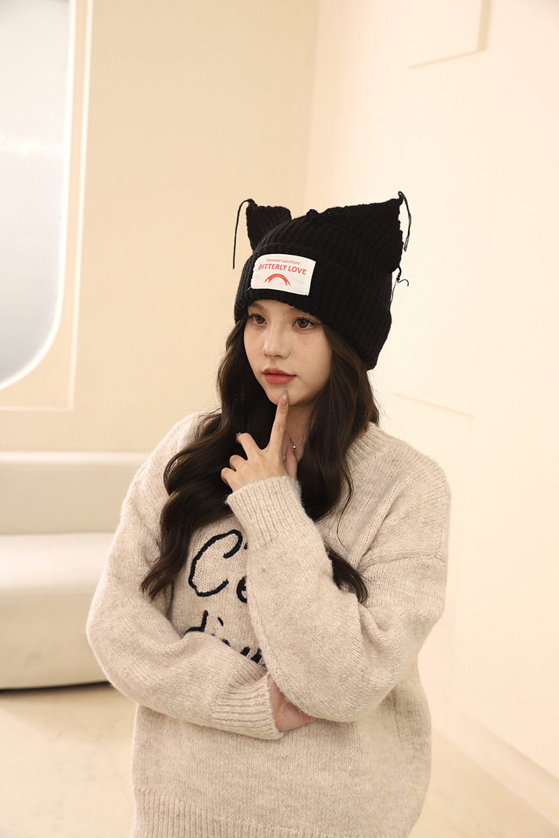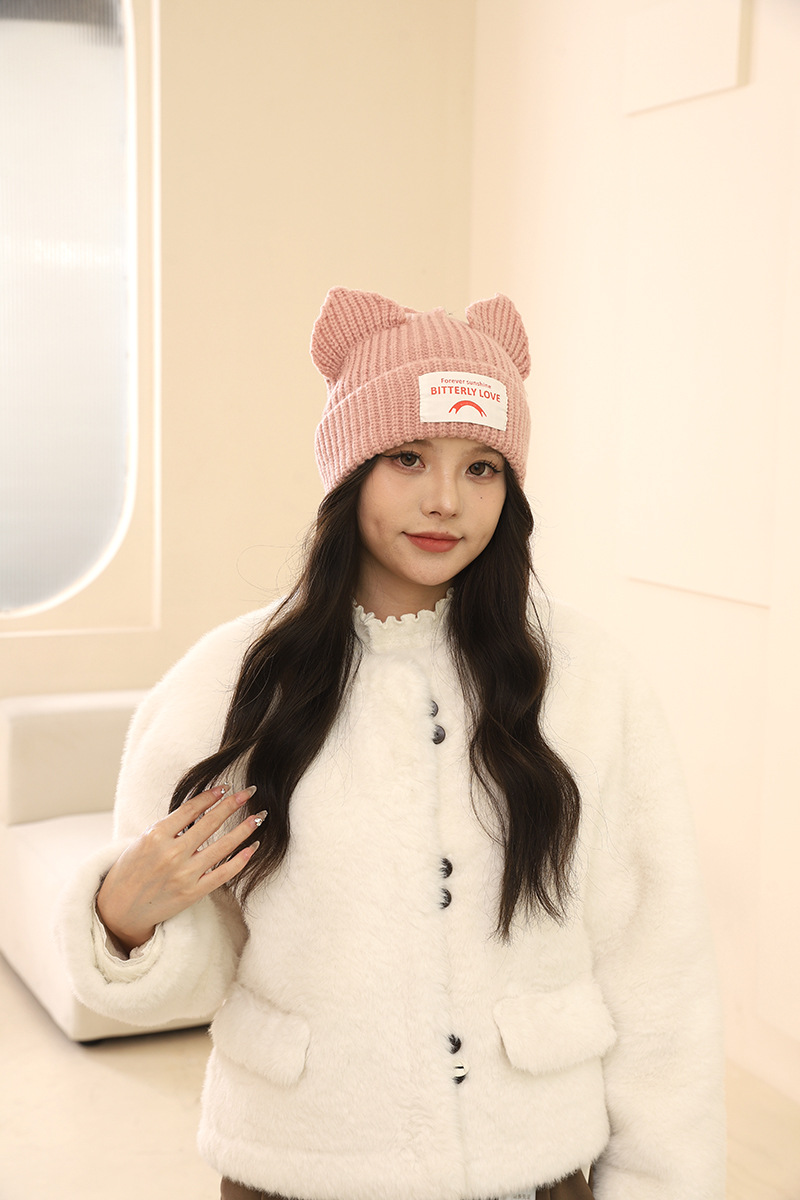여성을위한 한국 스타일 달콤하고 귀여운 고양이 귀 모직 모자 가을, 겨울 따뜻한 귀 보호 편지 패치 니트 모자 다목적