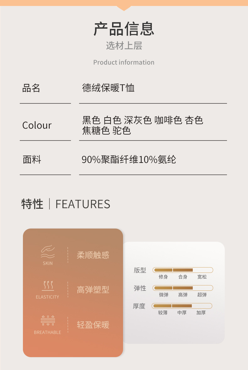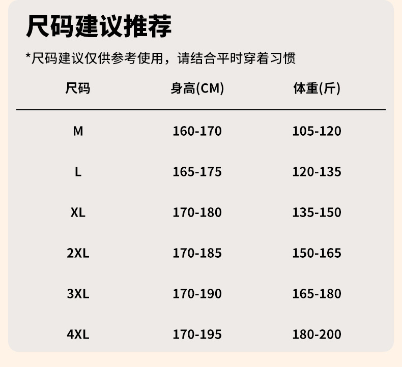 | 颜色 | 黑色, 白色, 深灰, 咖啡, 杏色, 焦糖色, 驼色 | 尺码 | M(105-120斤), L(120-135斤), XL(135-150斤), 2XL(150-165斤), 3XL(165-180斤), 4XL(180-200斤) |