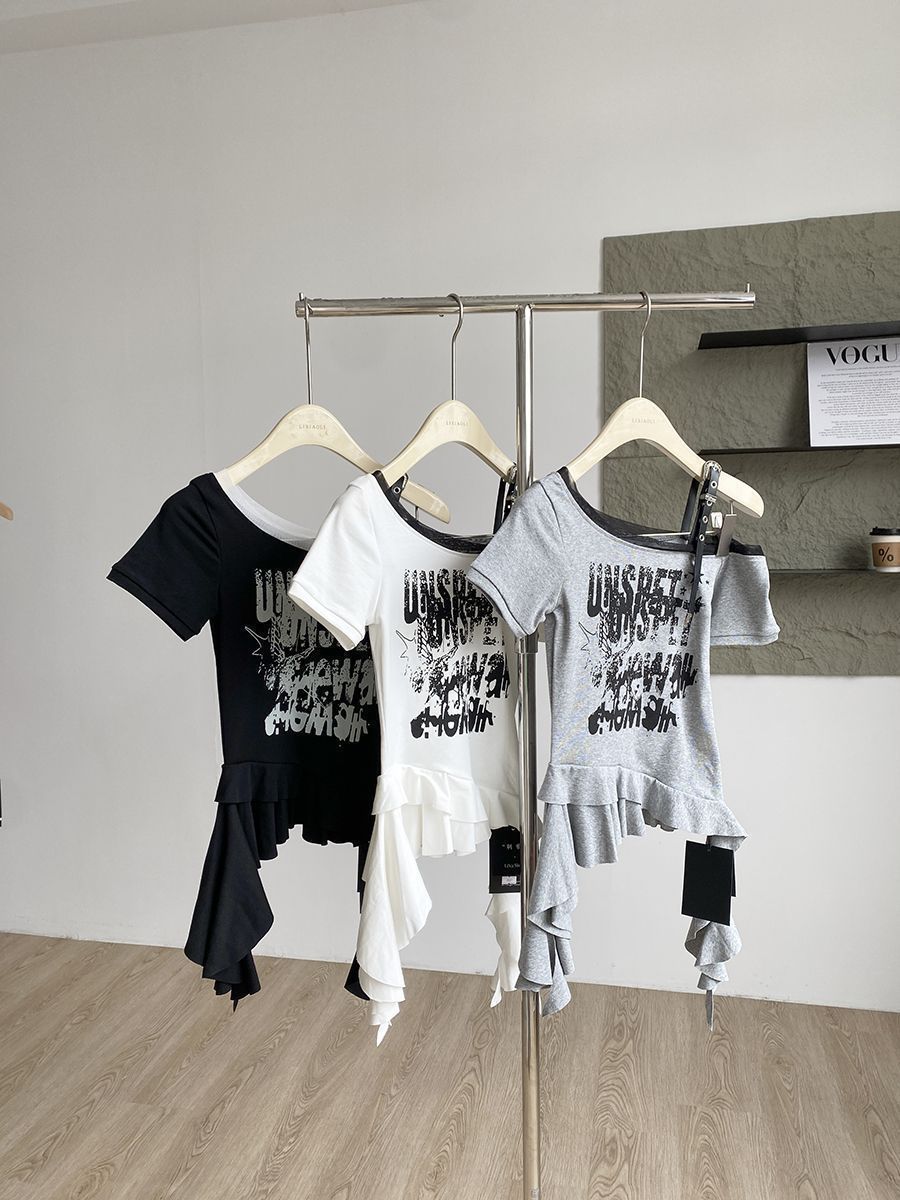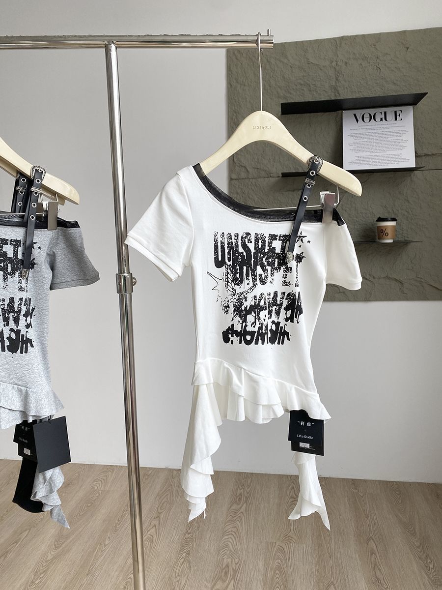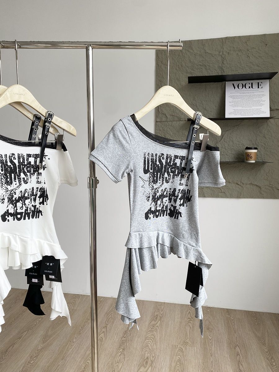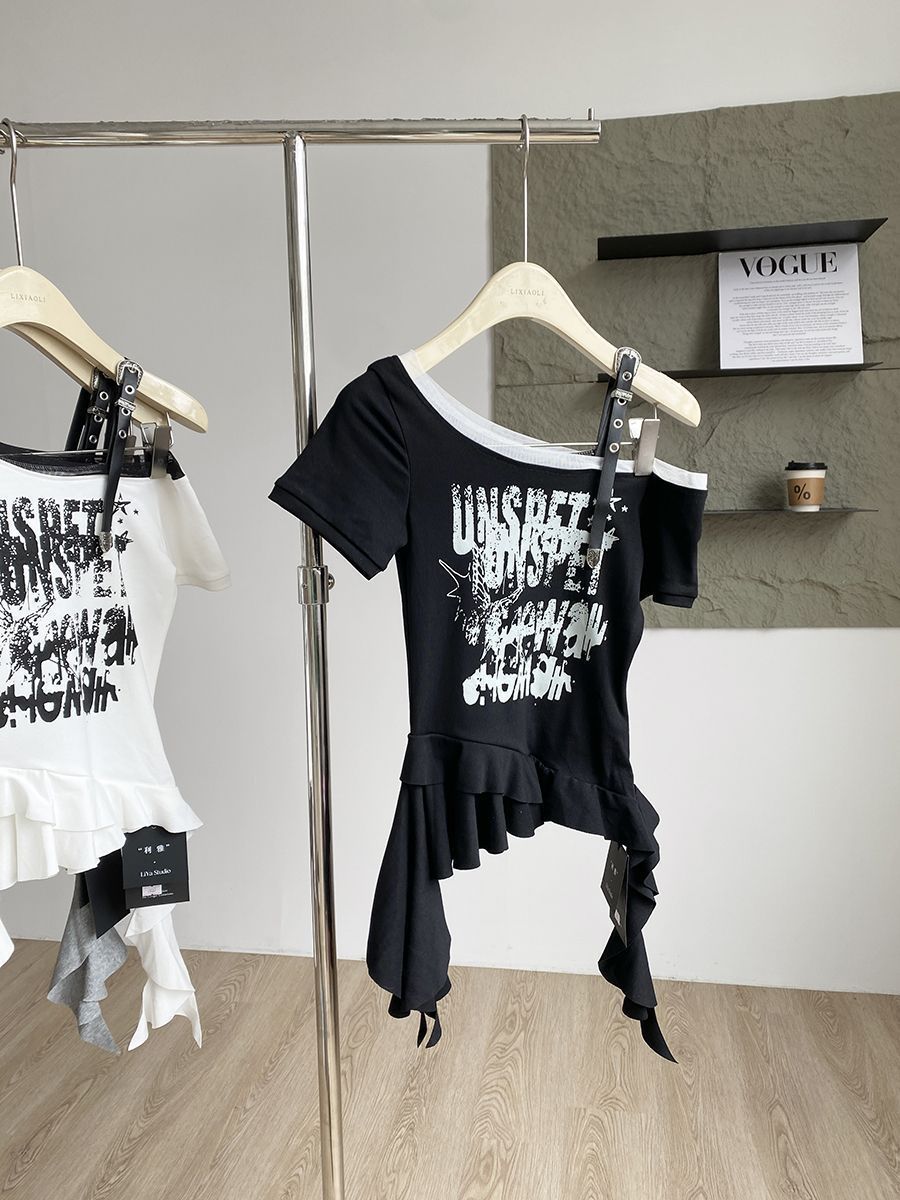 辣妹字母印花斜领露肩短袖T恤女夏季新款修身不规则飘带上衣chic
