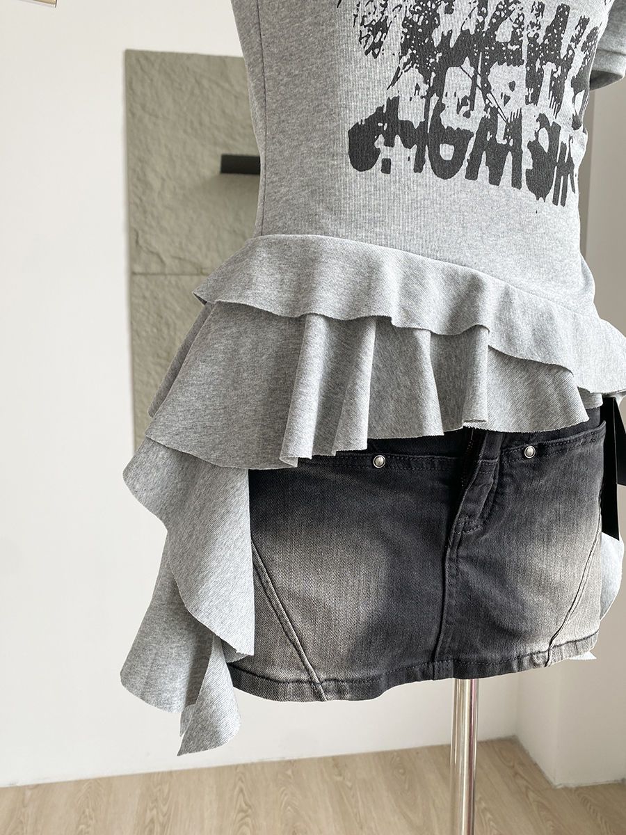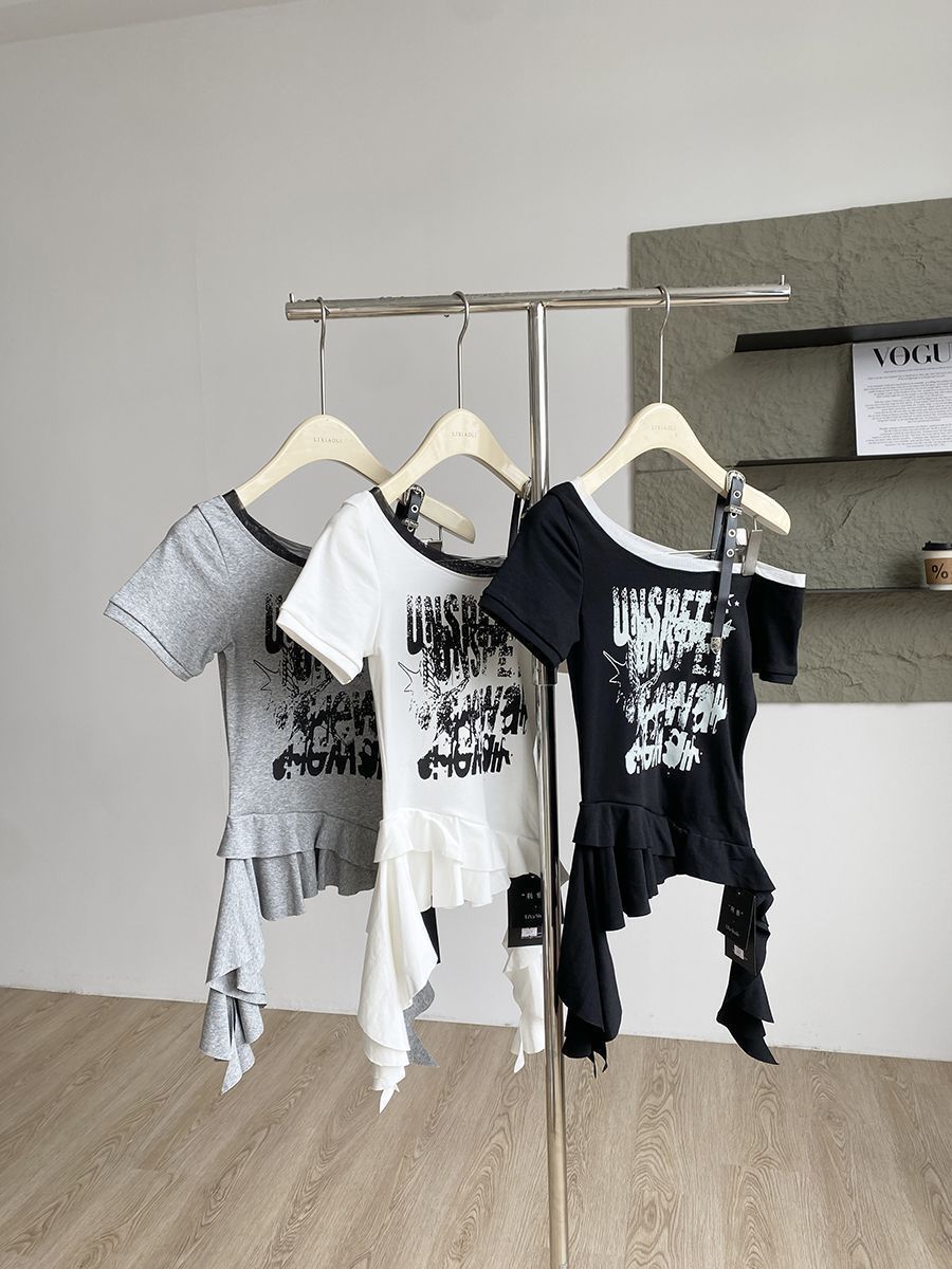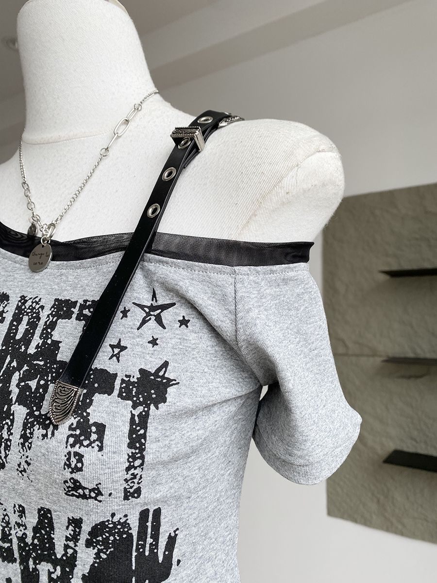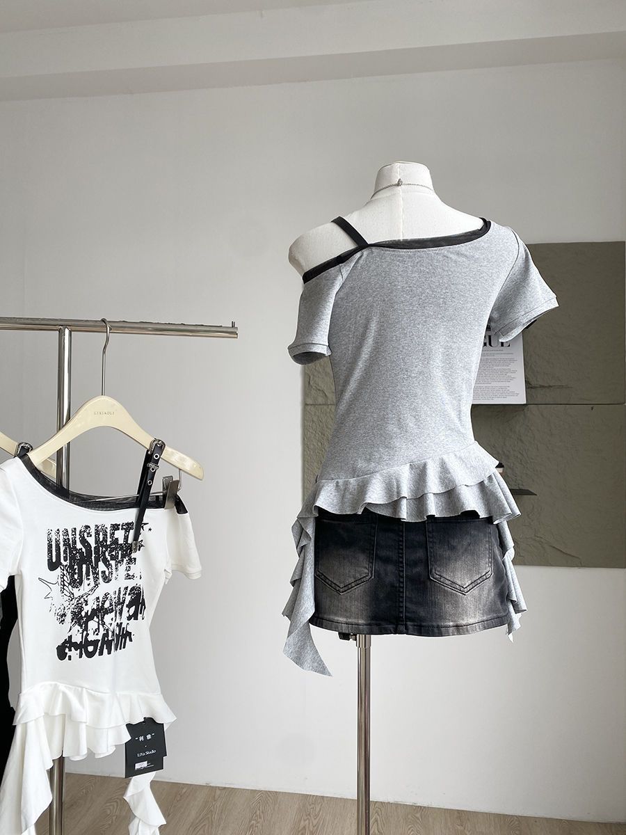 辣妹字母印花斜领露肩短袖T恤女夏季新款修身不规则飘带上衣chic