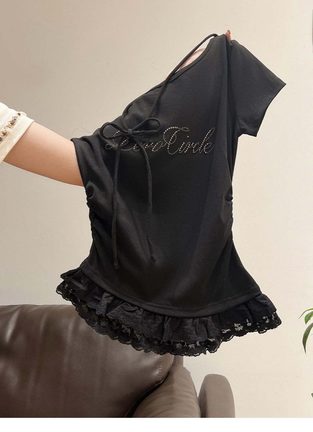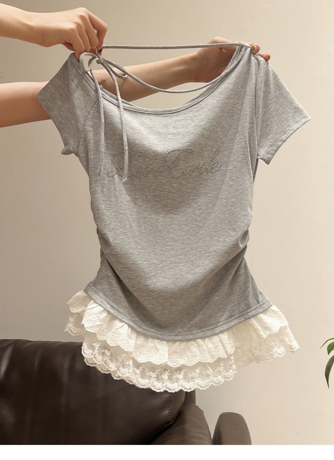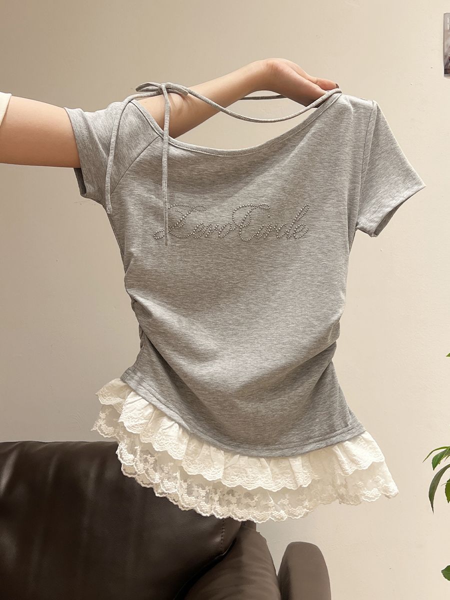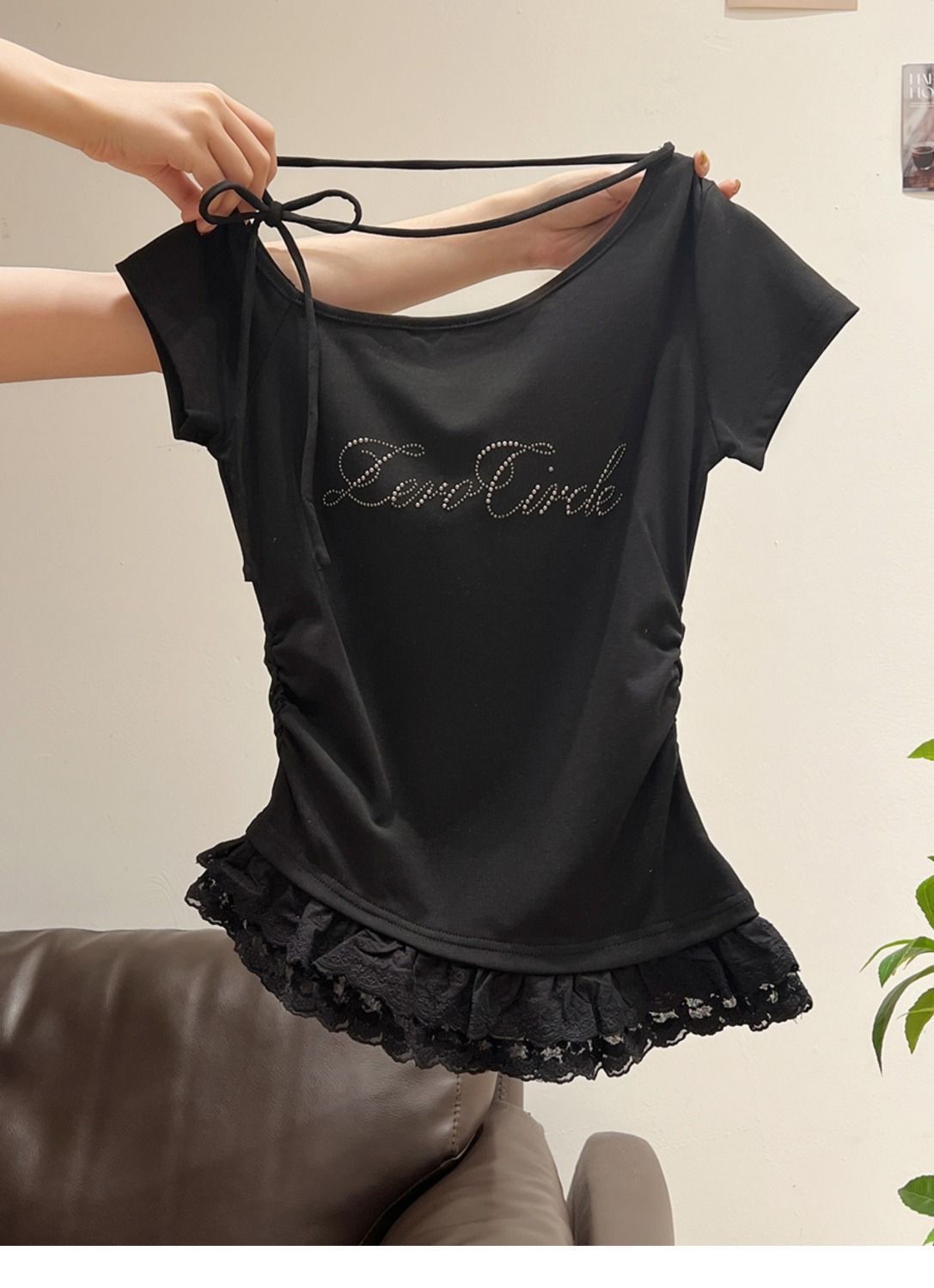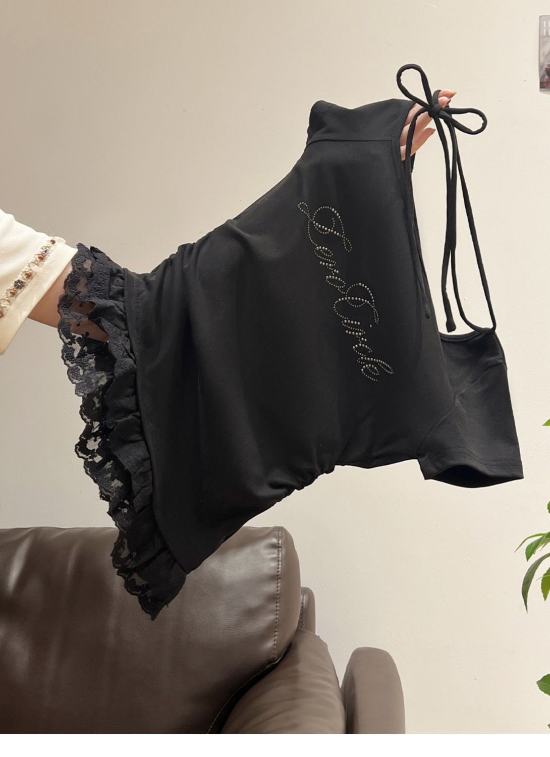 2025夏季新款纯欲甜辣短款蕾丝荷叶边字母钉珠斜领挂脖小个子上衣