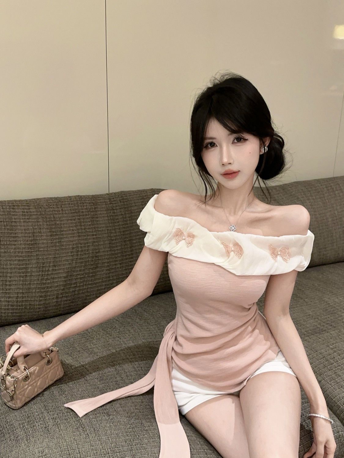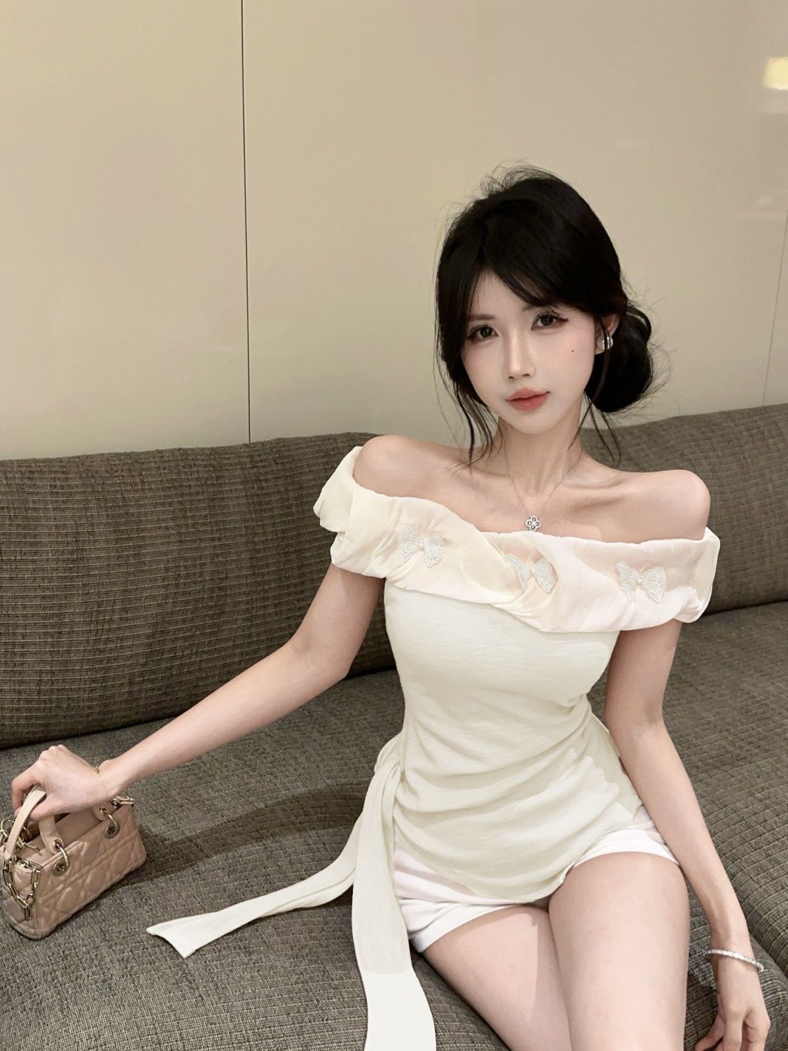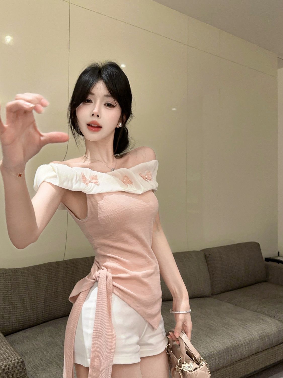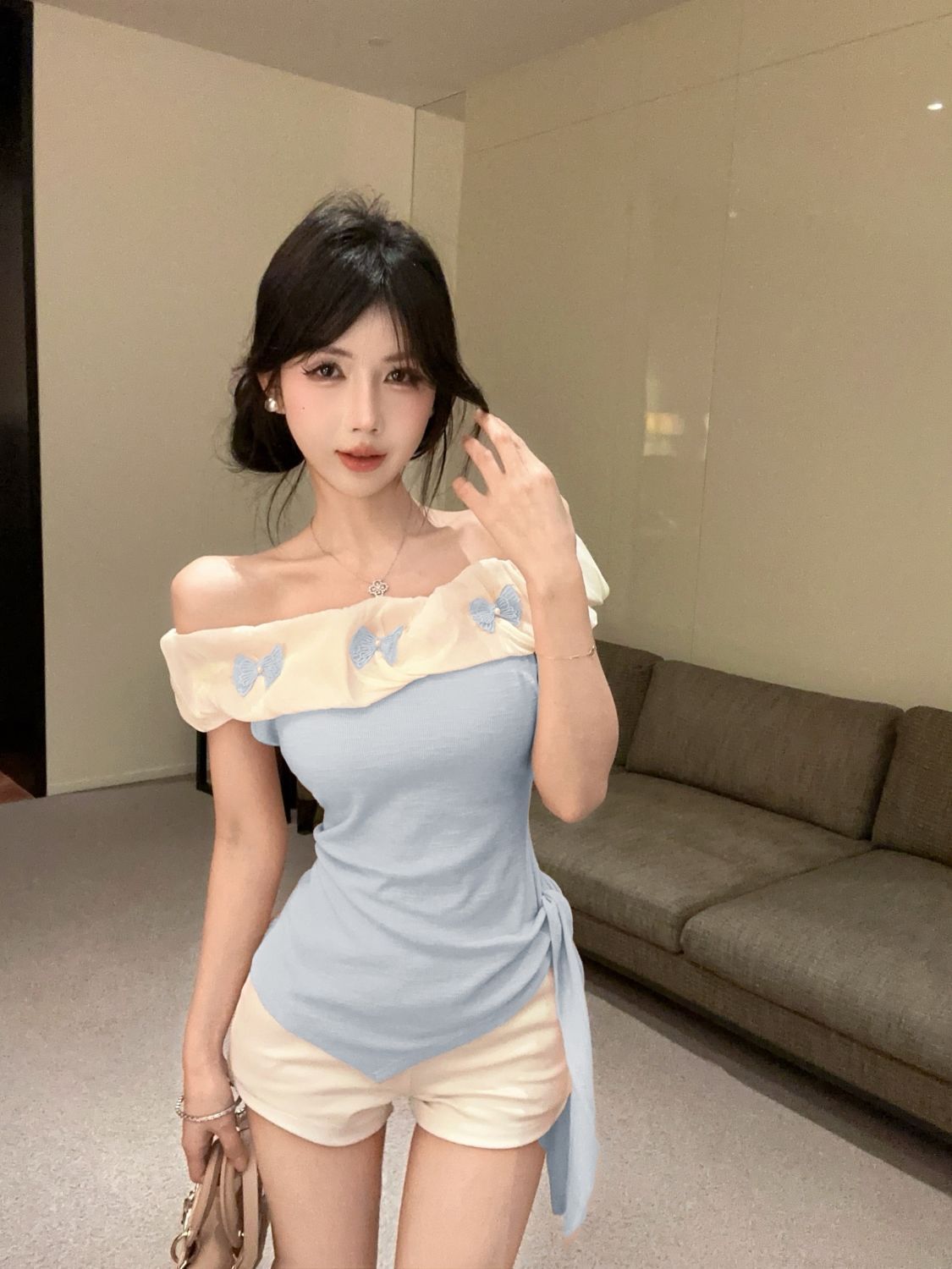 도파민 불규칙한 오프 숄더 반팔 티셔츠 2025 여름 신작 여성스럽고 달콤한 연령 감소 원 숄더 탑