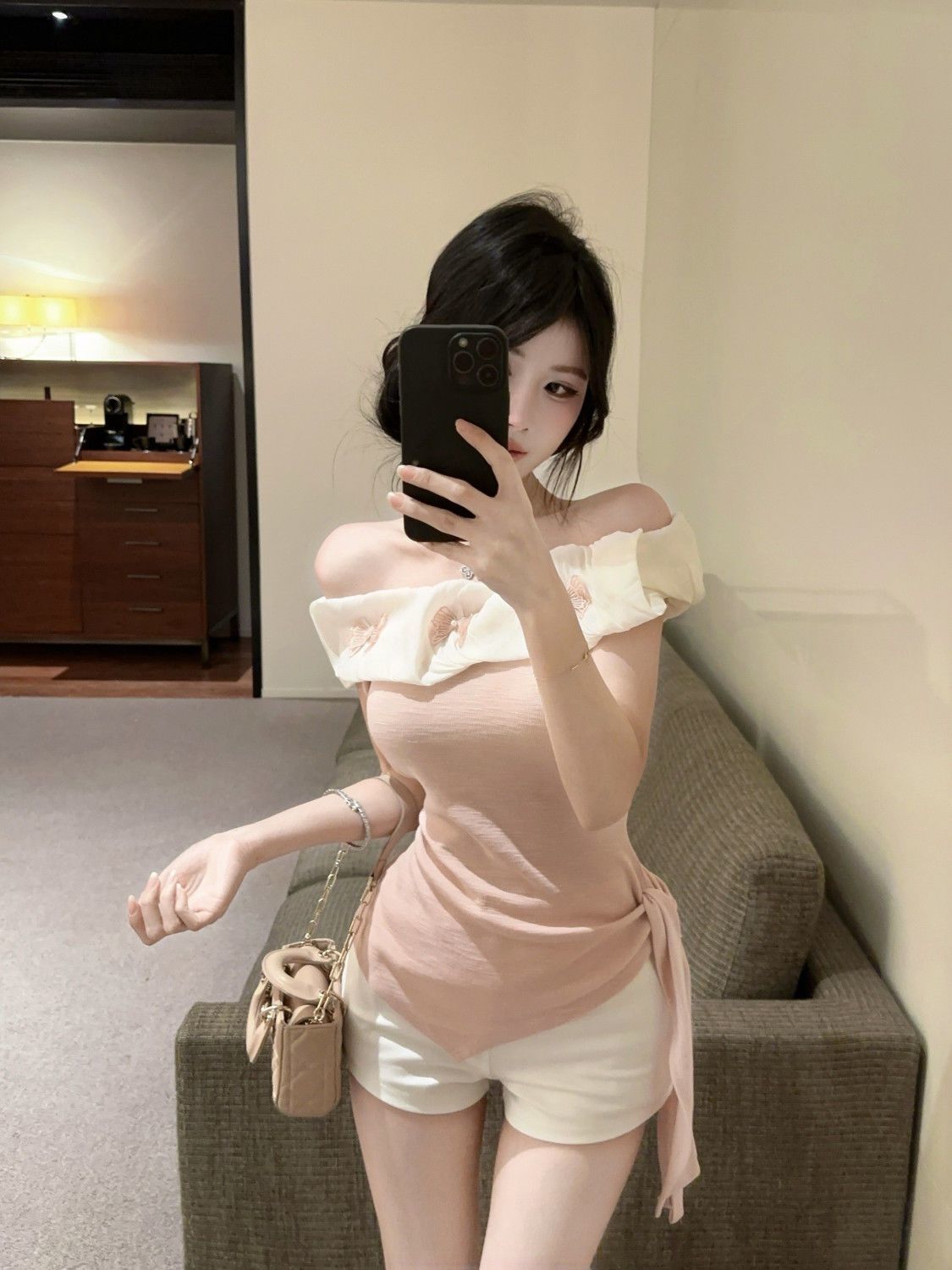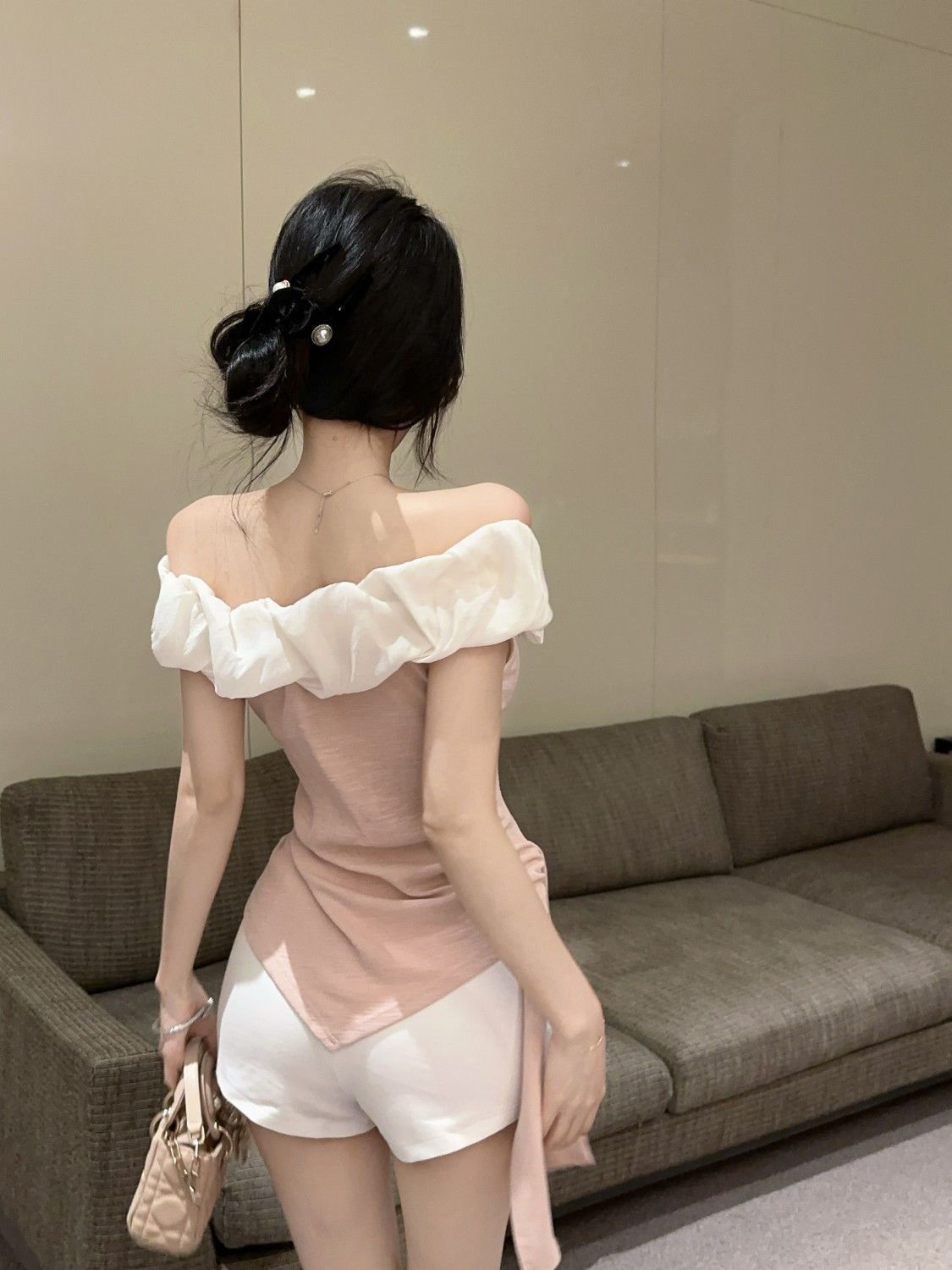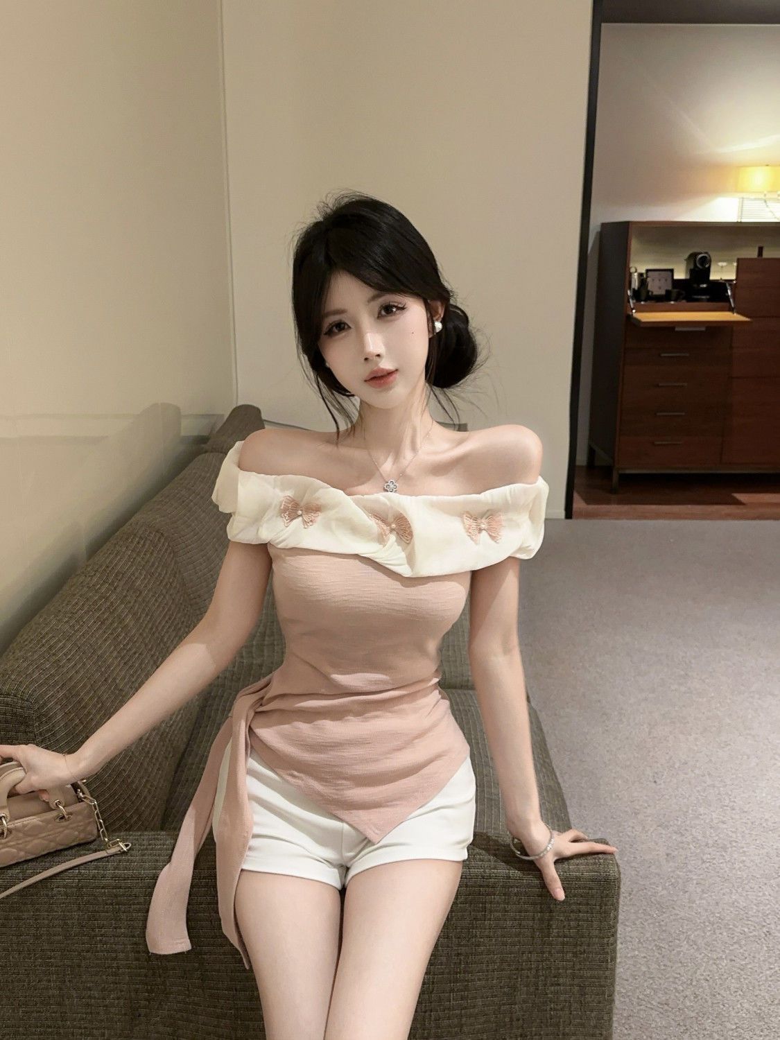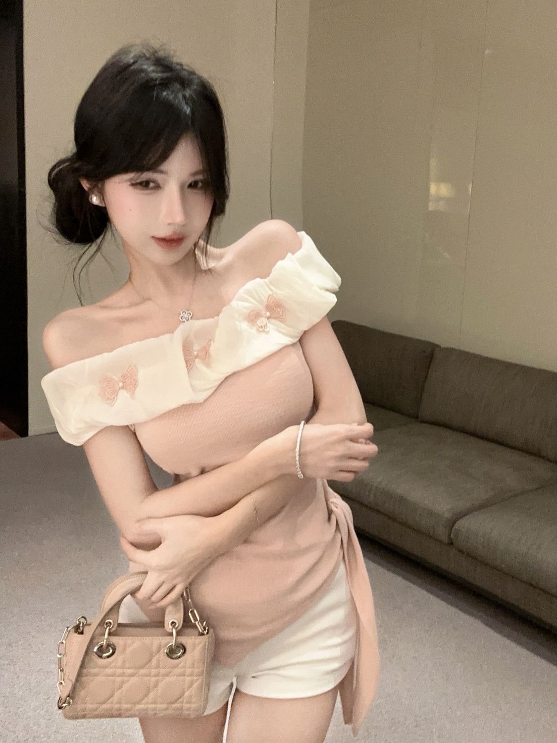 도파민 불규칙한 오프 숄더 반팔 티셔츠 2025 여름 신작 여성스럽고 달콤한 연령 감소 원 숄더 탑