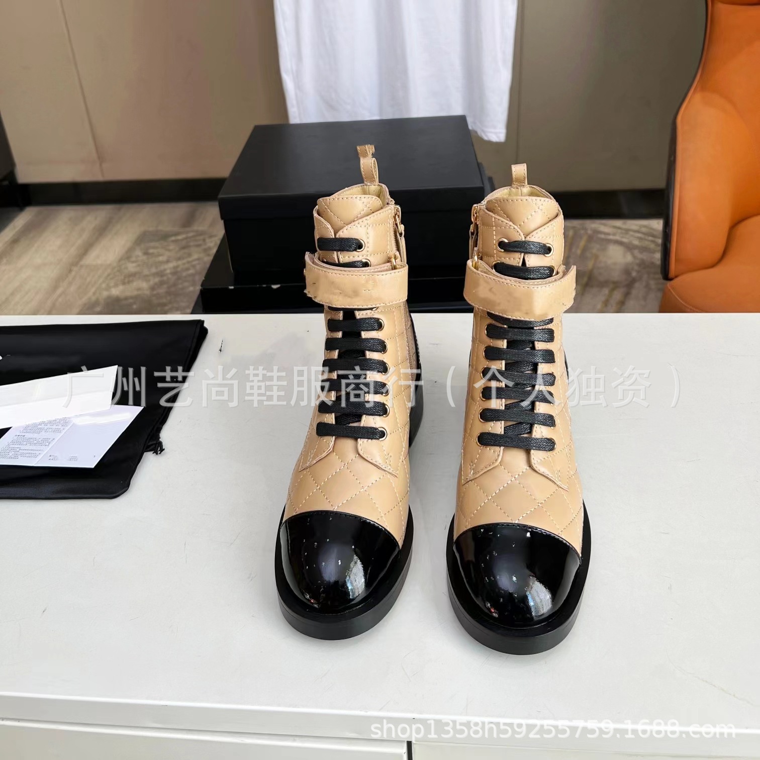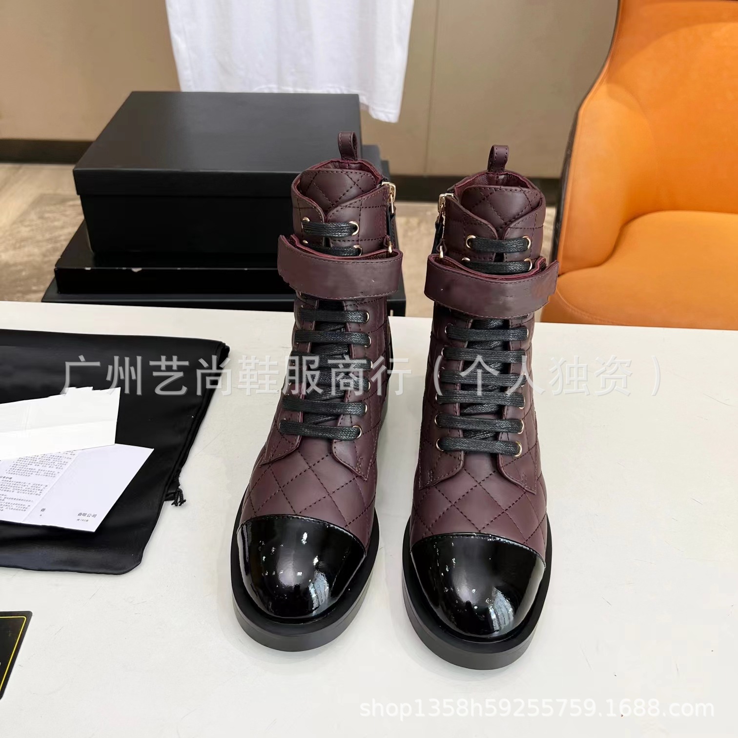 2025 가을 겨울 신상 스타일의 고급 가죽 라운드 토 컬러 블록 마름모 로우힐 레이스업 마틴 부츠 여성용 미드카프 부츠