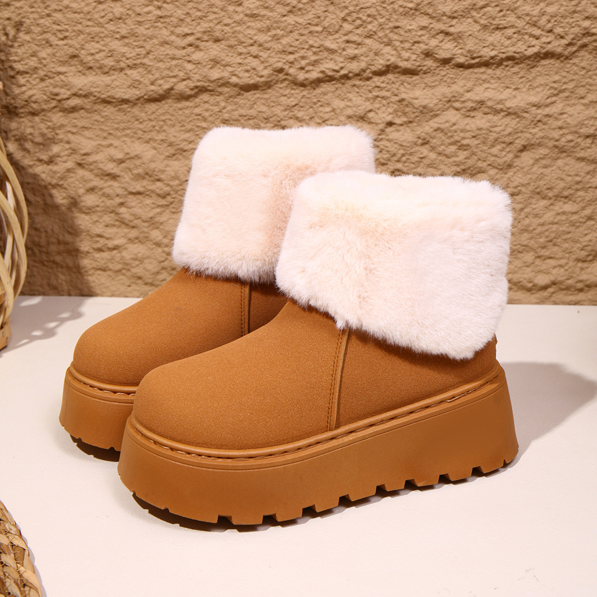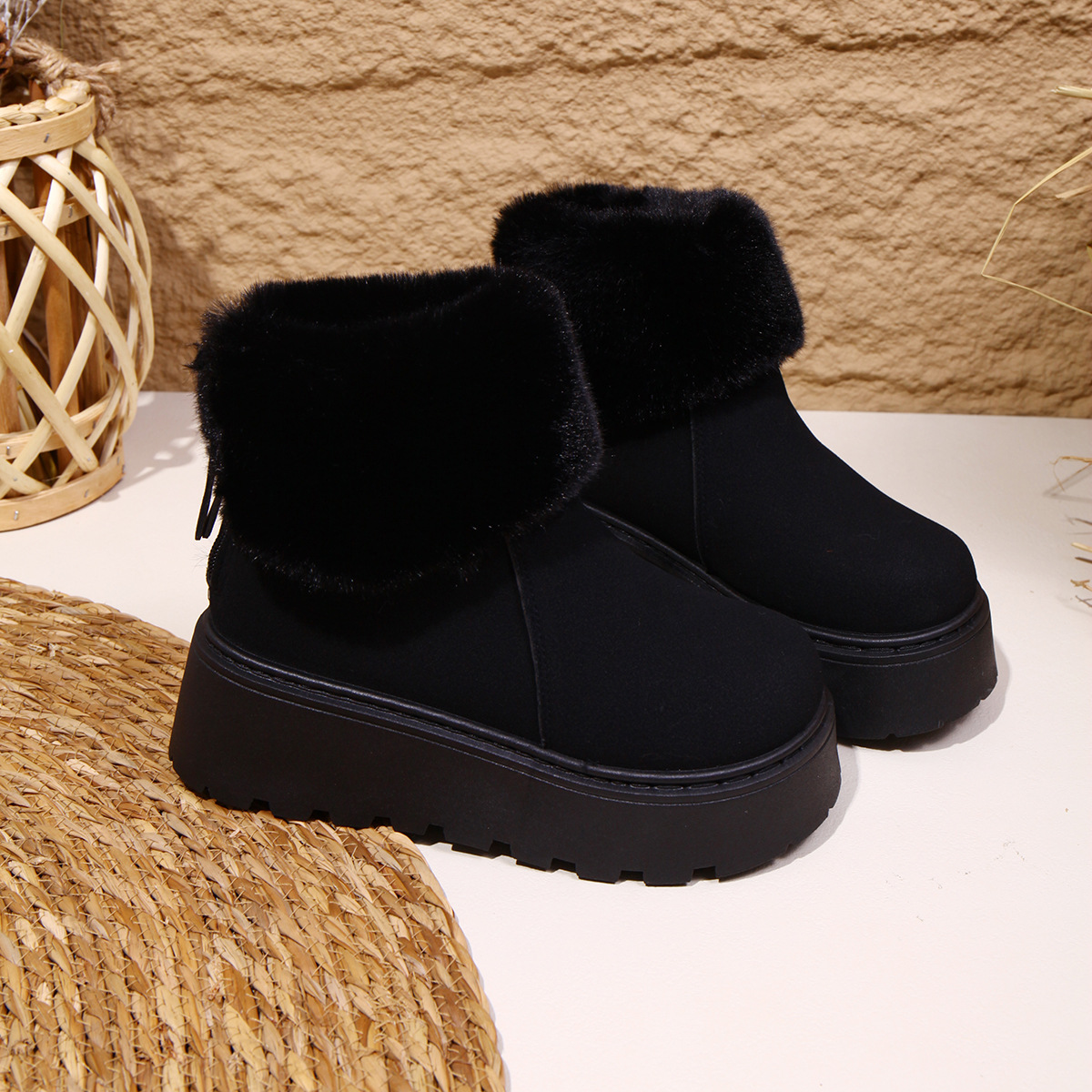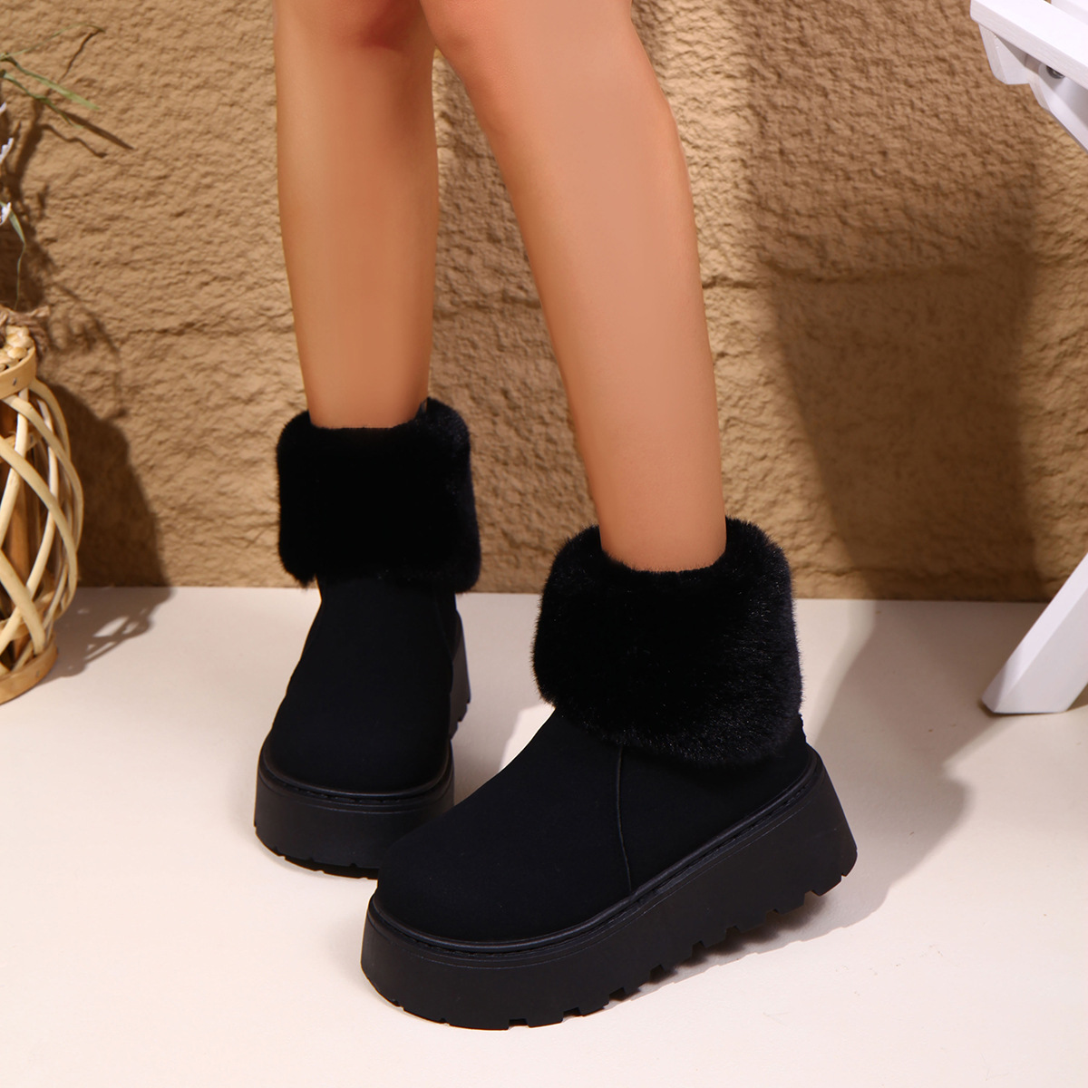 2025 새로운 가을 스타일 플러시 모피 입 플랫폼 두꺼운 밑창 스노우 부츠 여성 한국어 버전 라운드 발가락 따뜻한 대외 무역 대형 여성 부츠