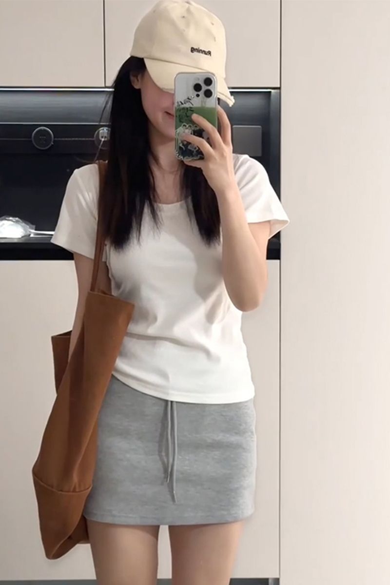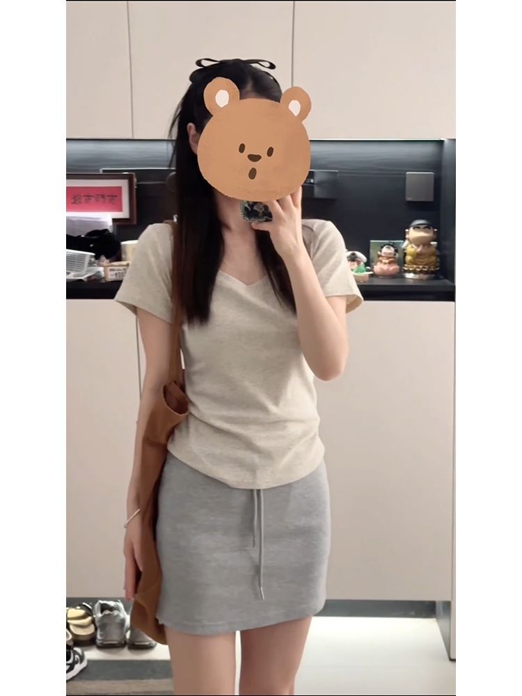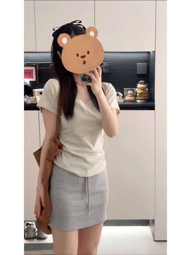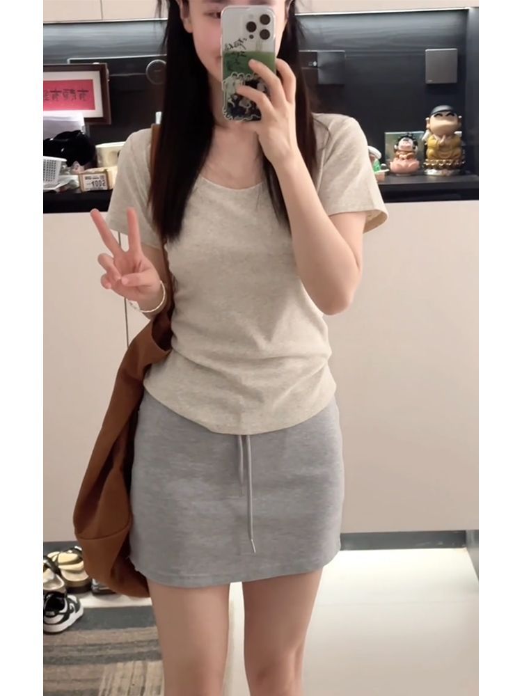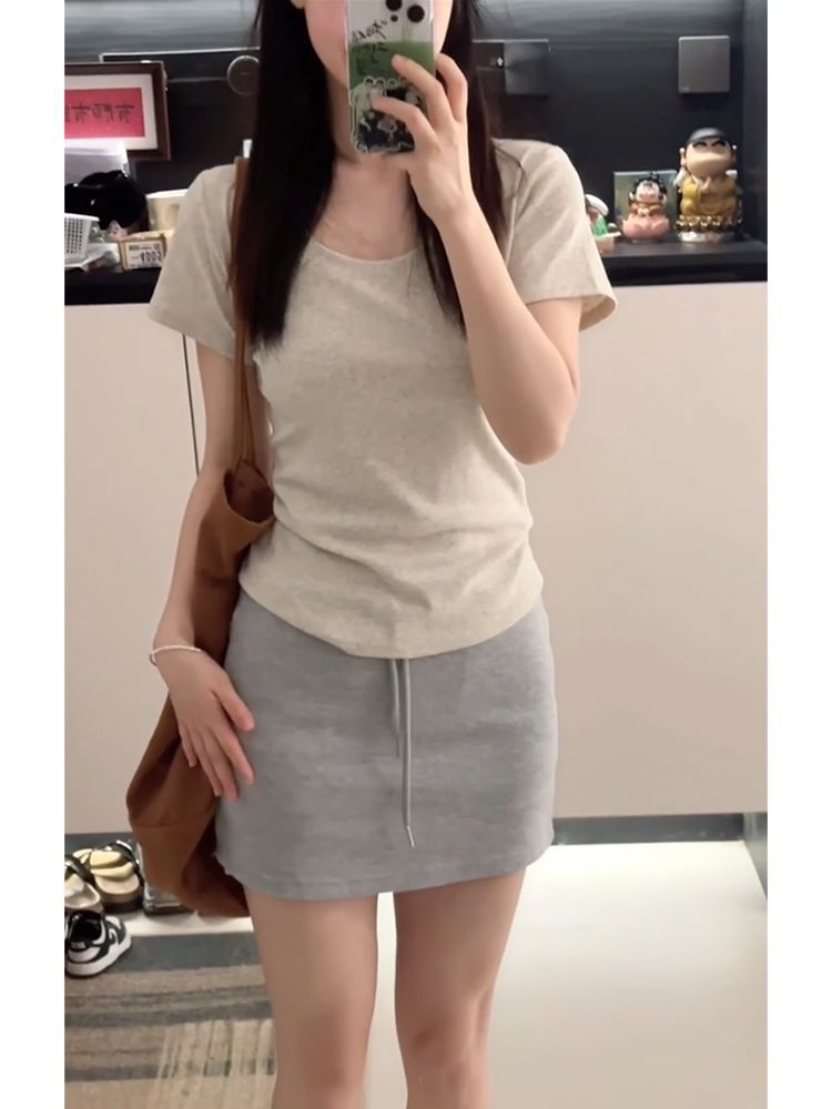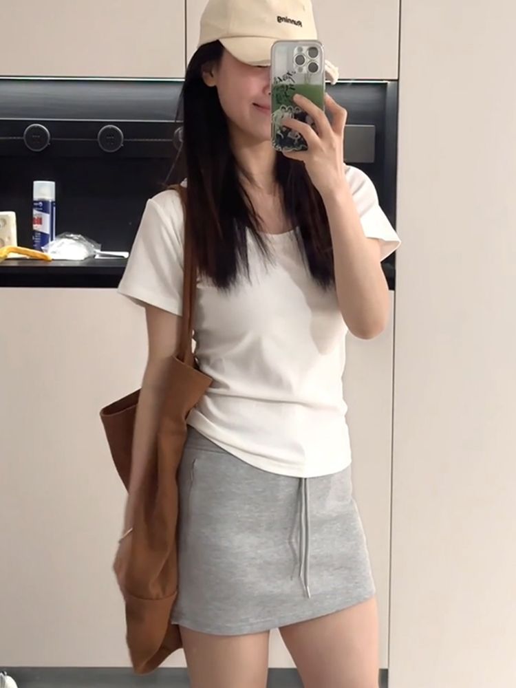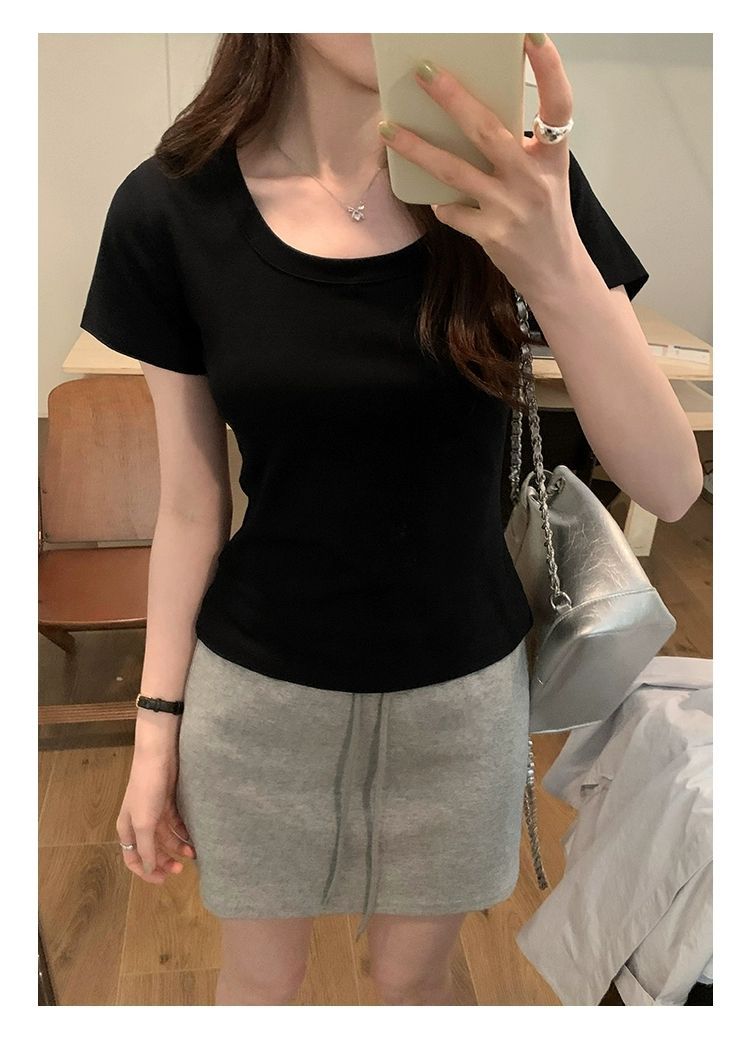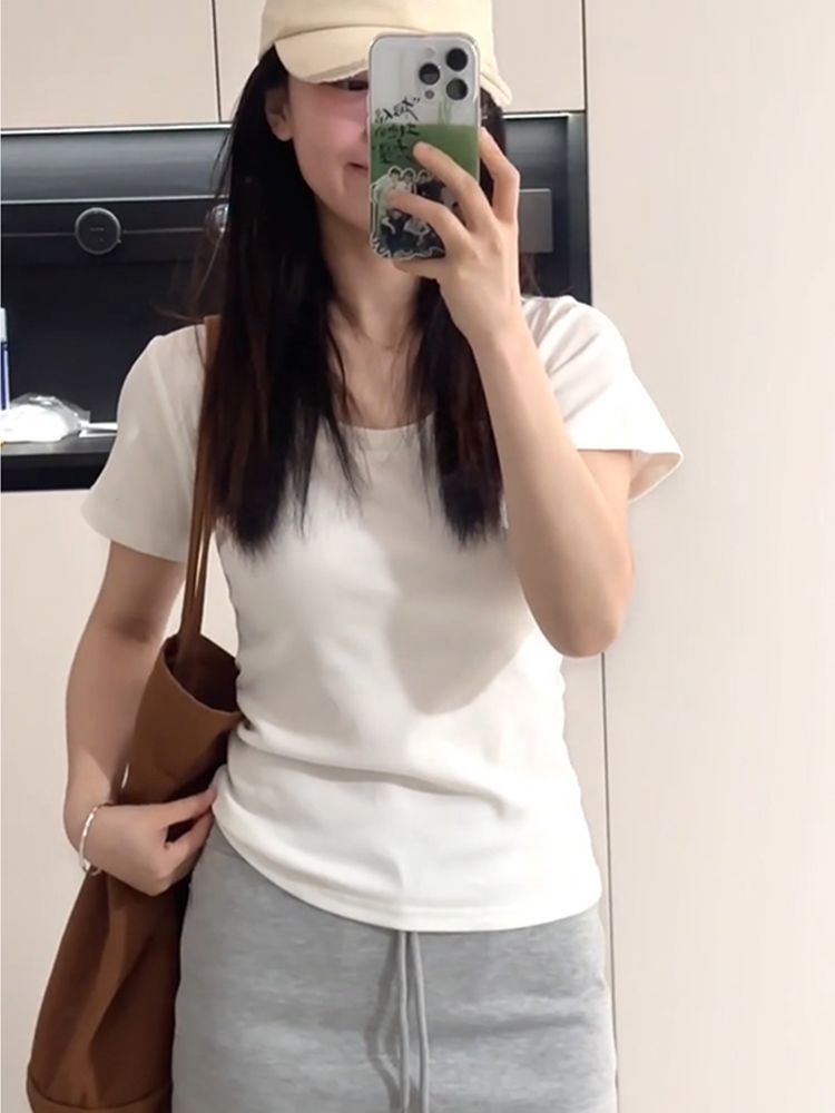 여름 여성용 한국 화이트 U 넥 오른쪽 어깨 반팔 티셔츠 다용도 슬리밍 탑