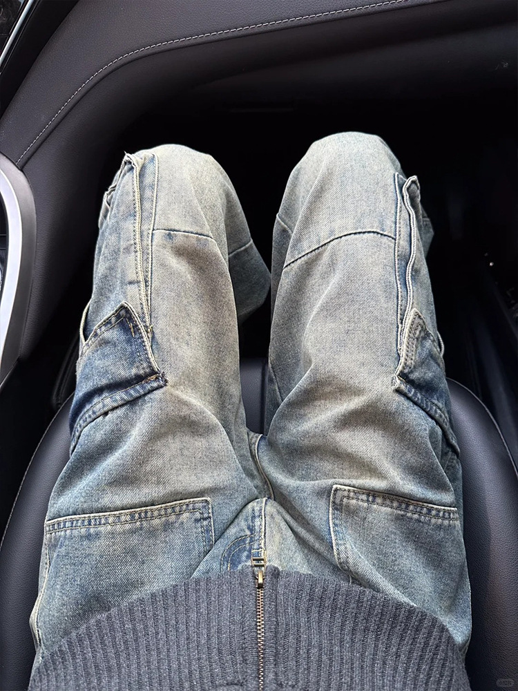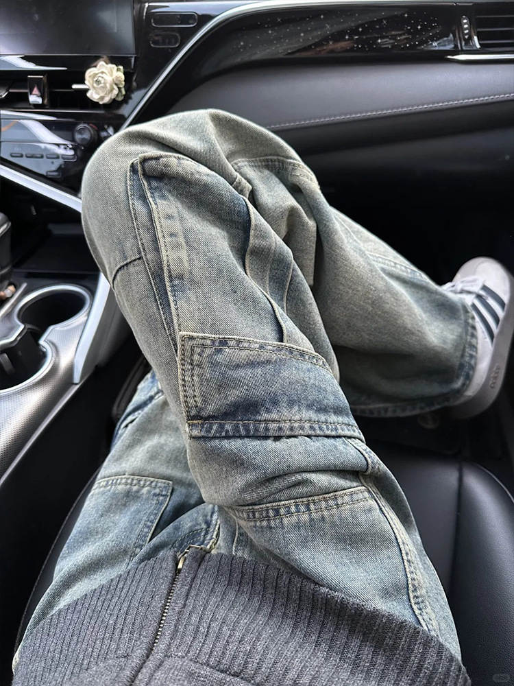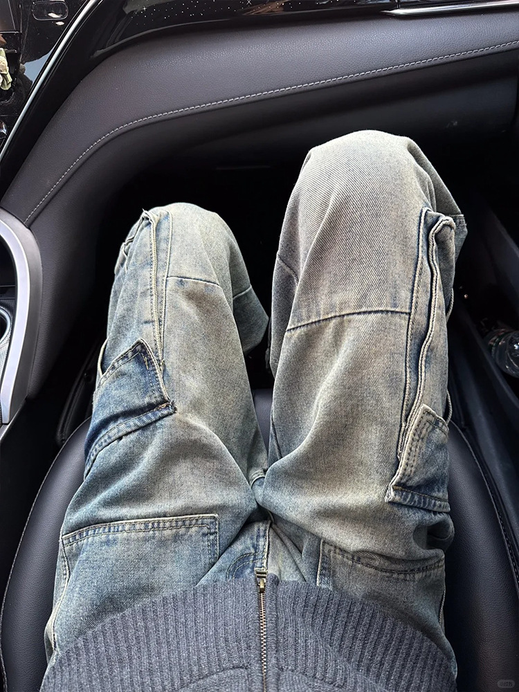 남성과 여성을 위한 미국 복고풍 하이 스트리트 워싱 향수 작업복 청바지 멀티 포켓 루즈 스트레이트 와이드 레그 캐주얼 바지