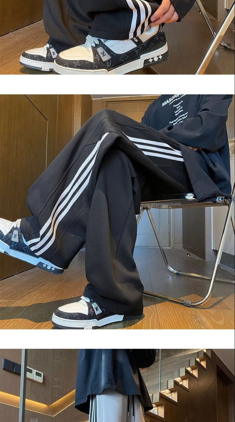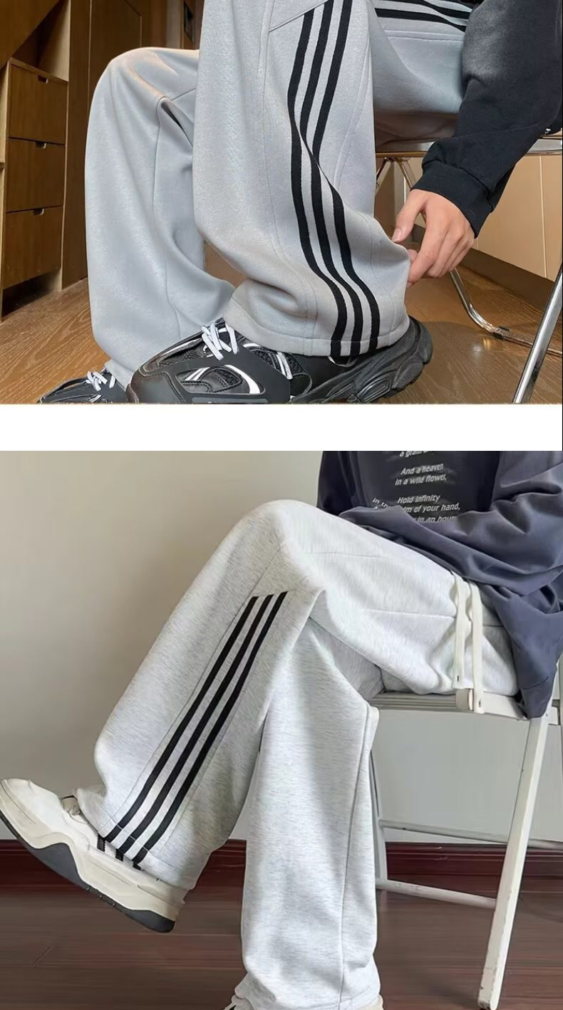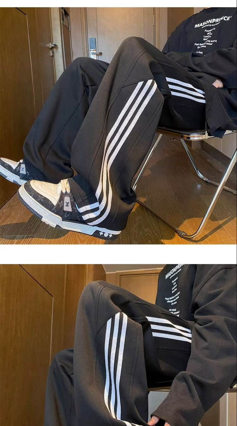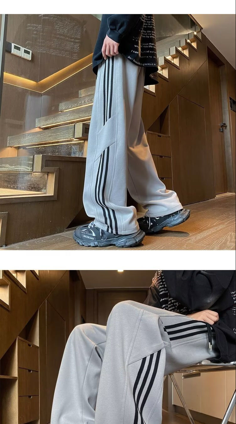 남성용 흰색 줄무늬 바지, 루즈핏 와이드 레그 스포츠 팬츠, 봄 가을용 대형 사이즈 바지, 통통한 남성용 다용도 캐주얼 팬츠