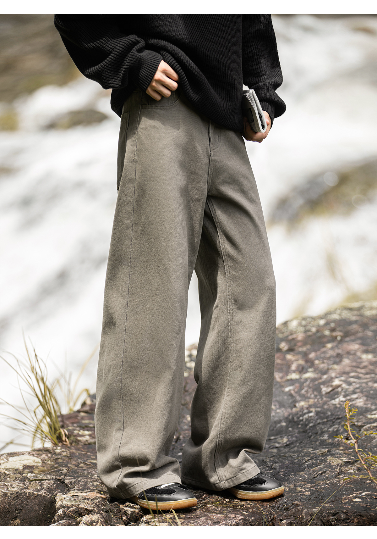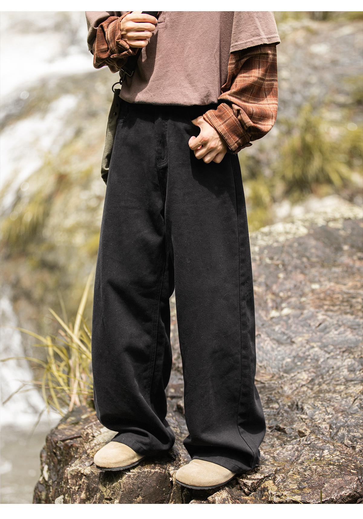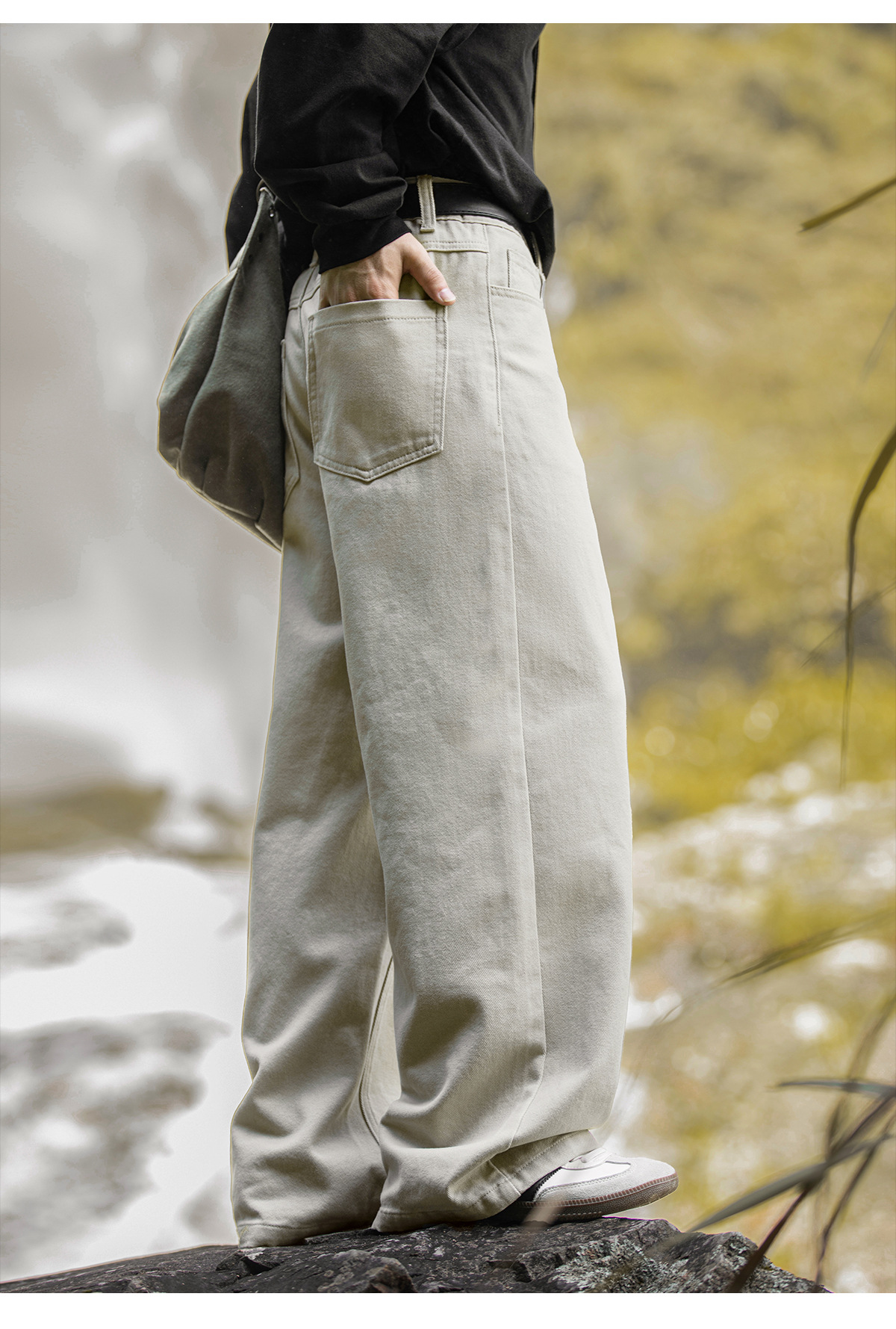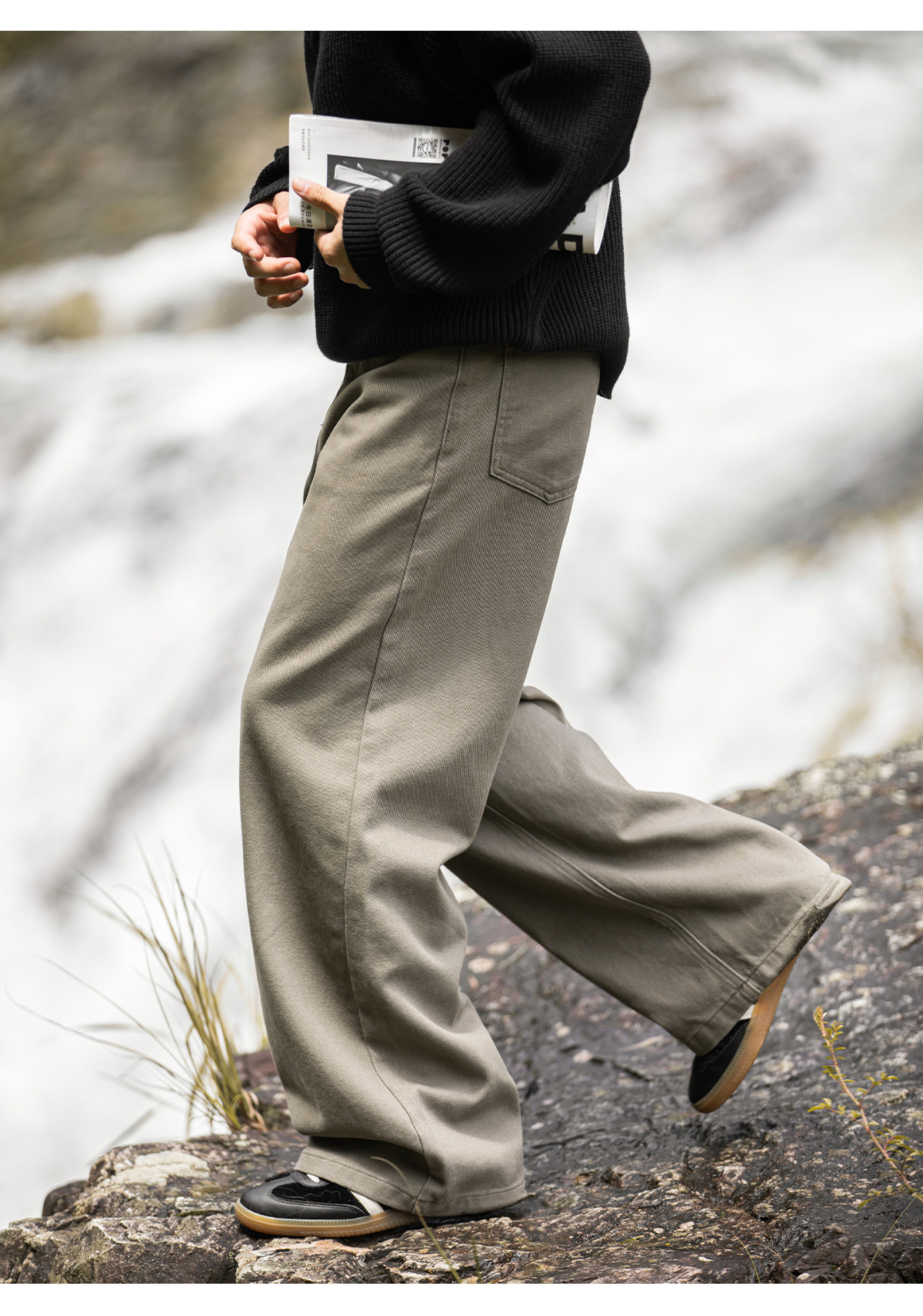 가을 스타일의 남성용 능직 마이크로 와이드 아웃도어 루즈 스트레이트 캐주얼 팬츠, 텍스처드 퓨어 코튼 트렌디 브랜드 레트로 반탄성 바지