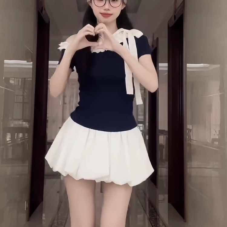 韩系木耳边绑带斜肩短袖T恤女夏季设计感修身显瘦露肩甜辣妹上衣