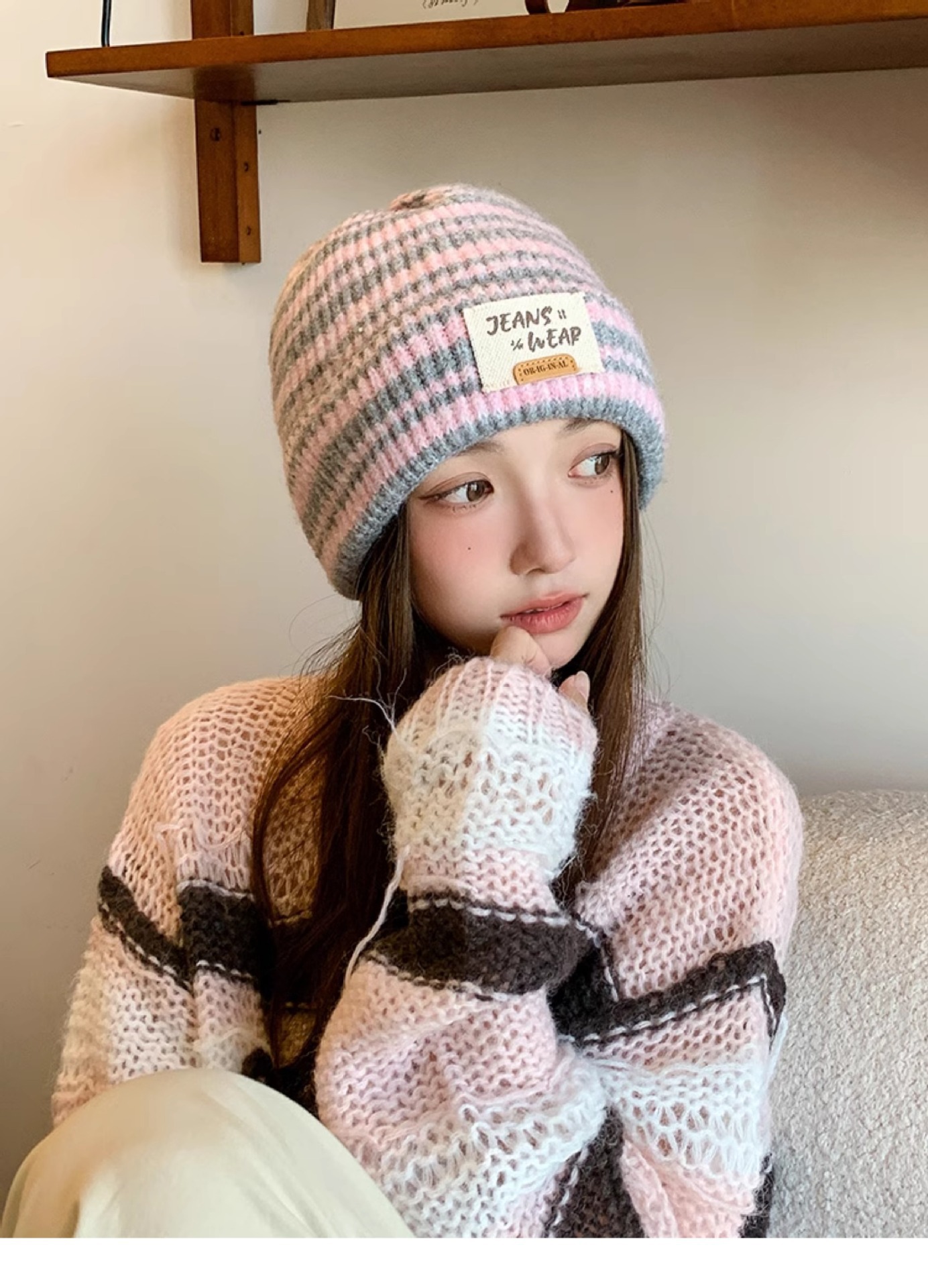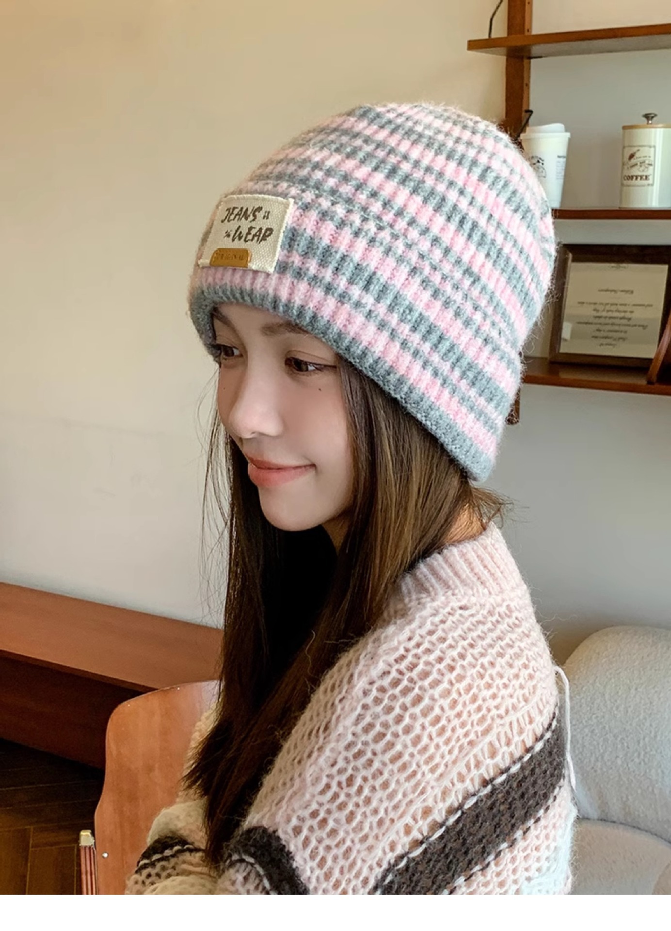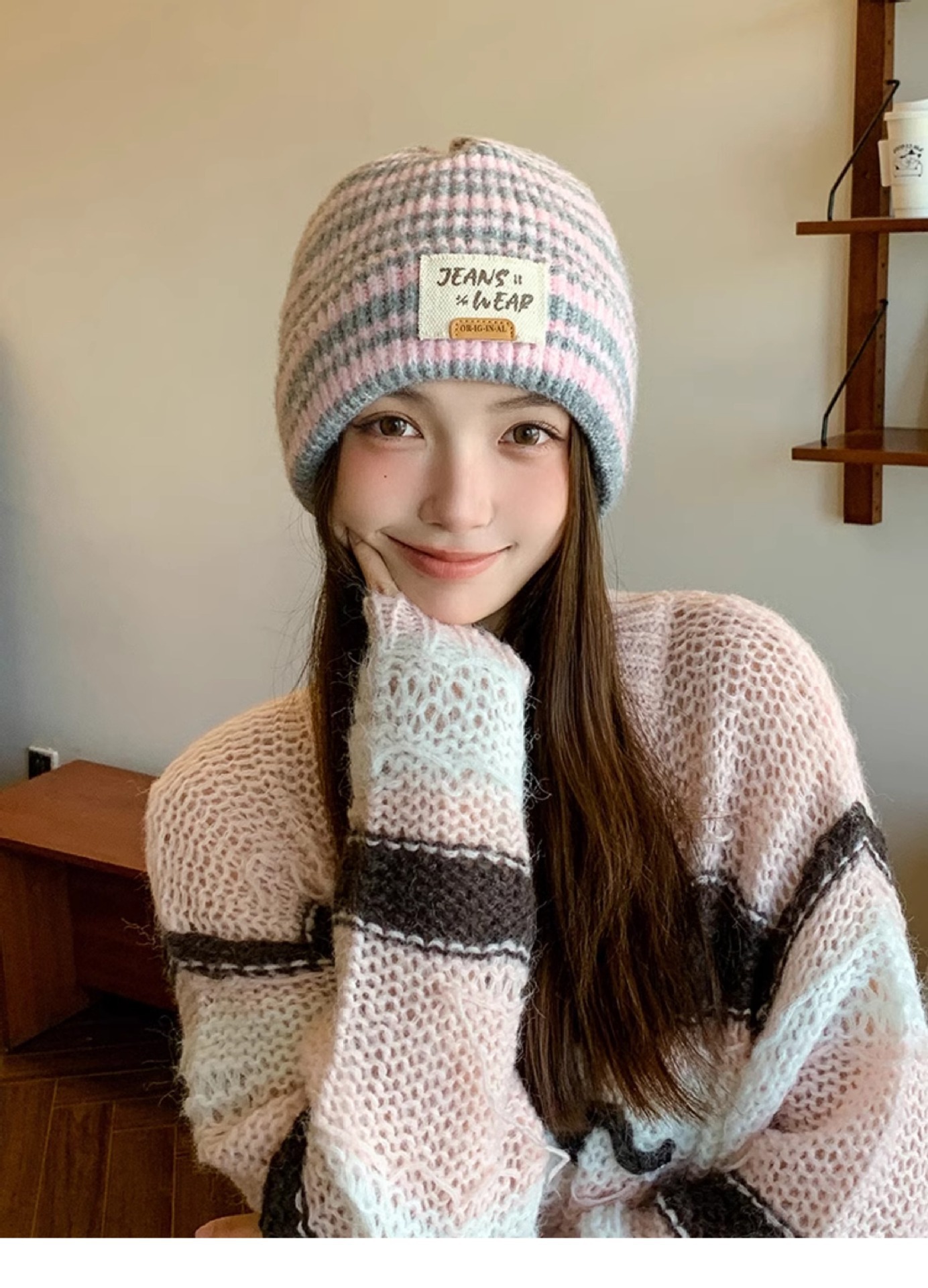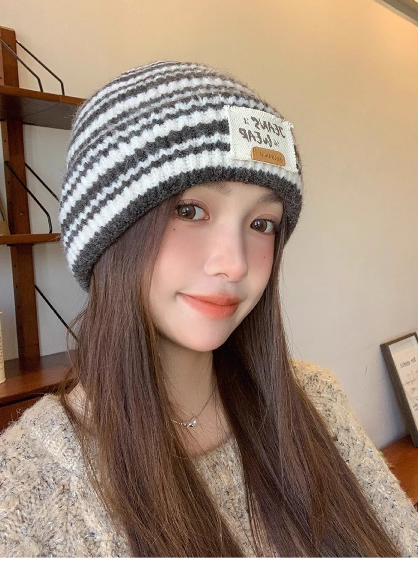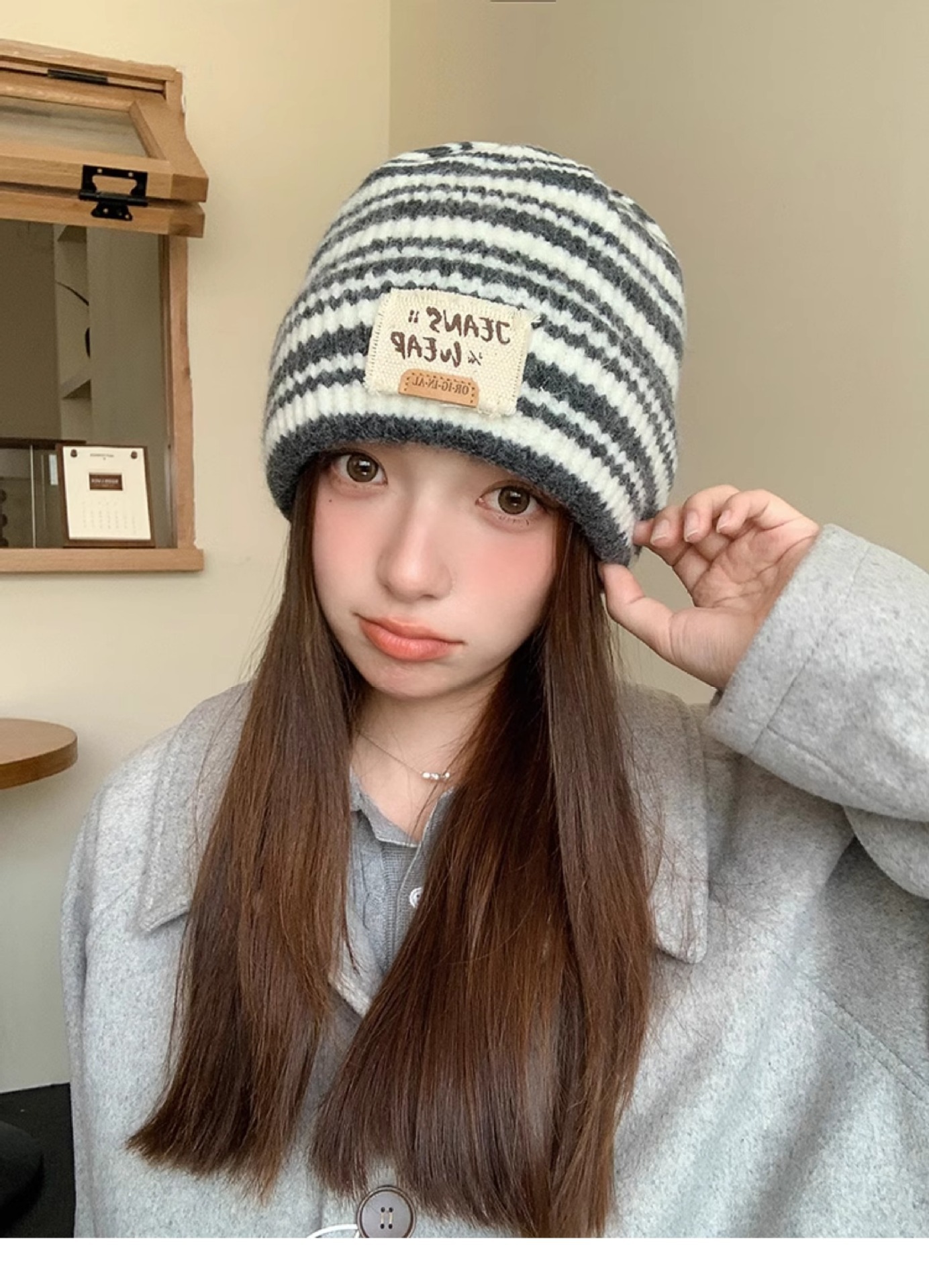 가을 겨울 새로운 줄무늬 한국 패션 격자 무늬 문자 패치 큰 머리 모직 모자 여성 니트 모자 유행 모자