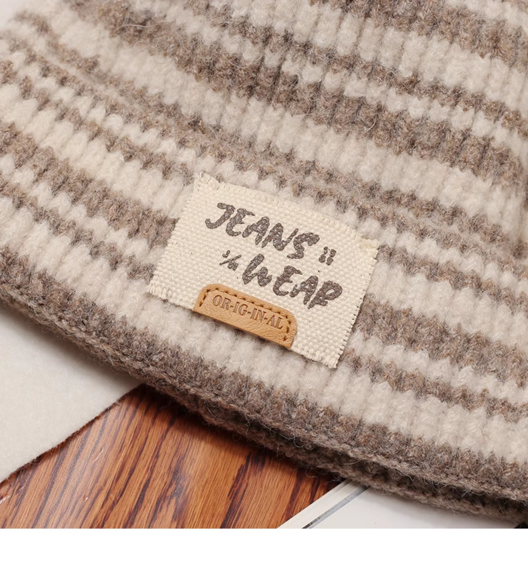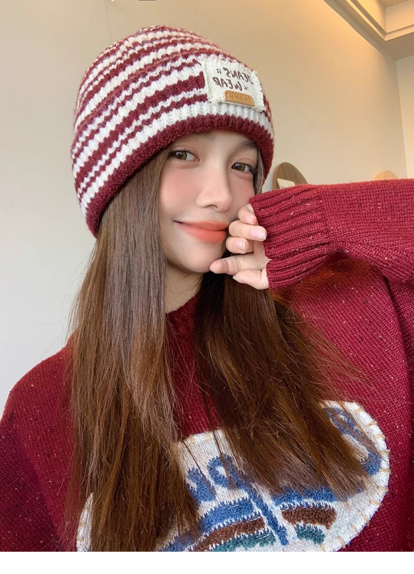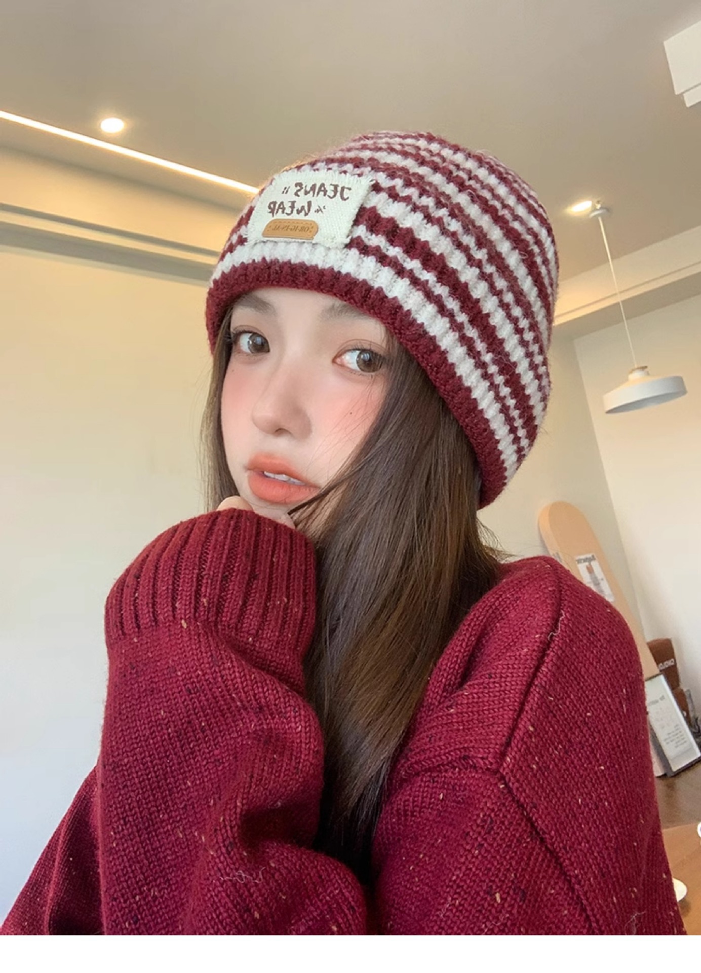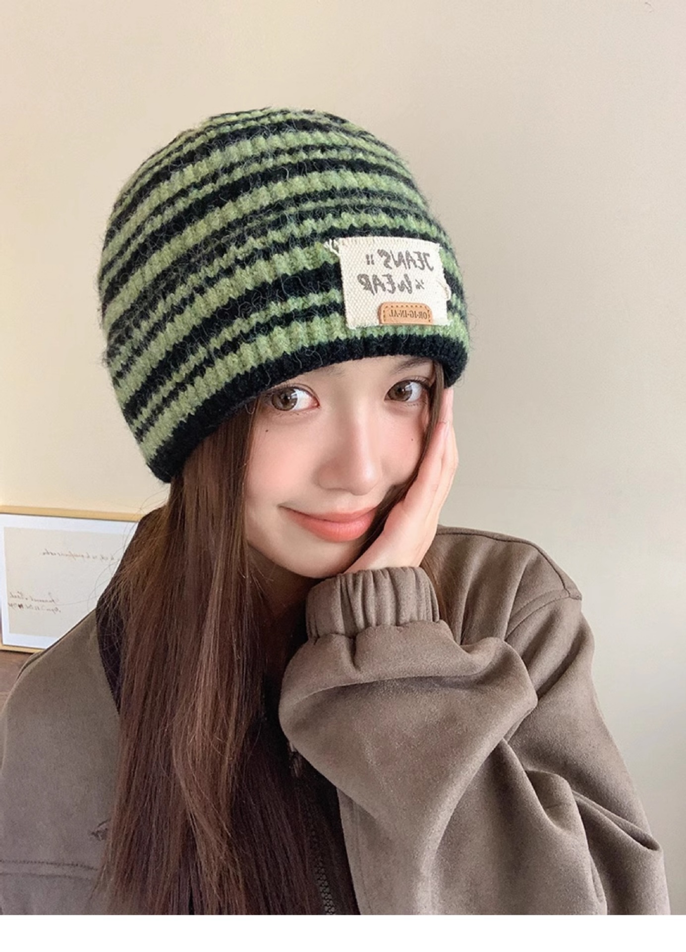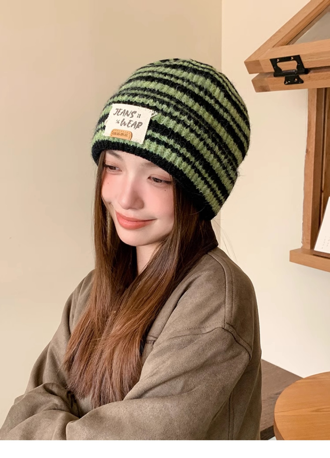 가을 겨울 새로운 줄무늬 한국 패션 격자 무늬 문자 패치 큰 머리 모직 모자 여성 니트 모자 유행 모자
