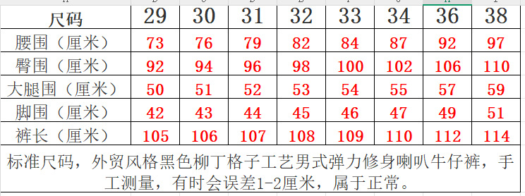 | 尺码 | 28, 29, 30, 31, 32, 33, 34, 36, 38 | 有无质检报告 | 否 |
