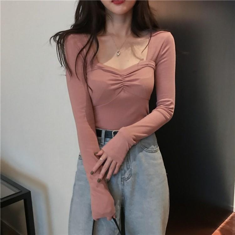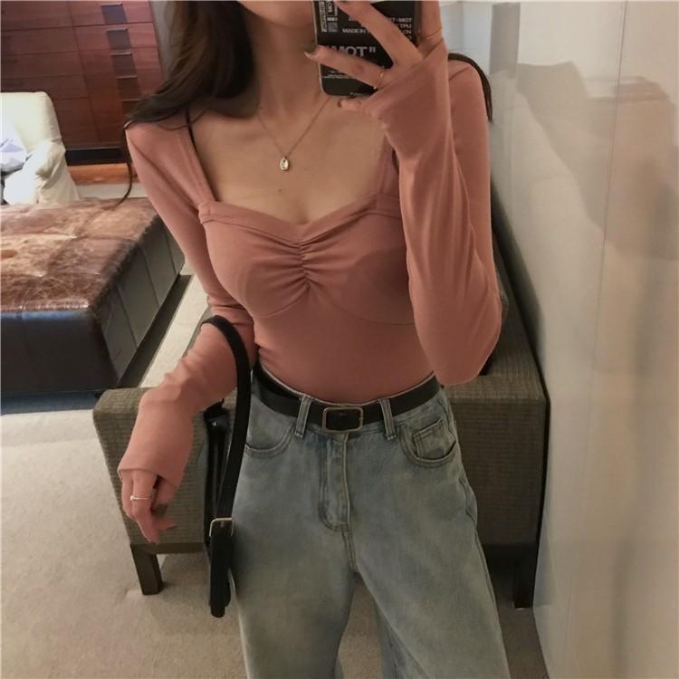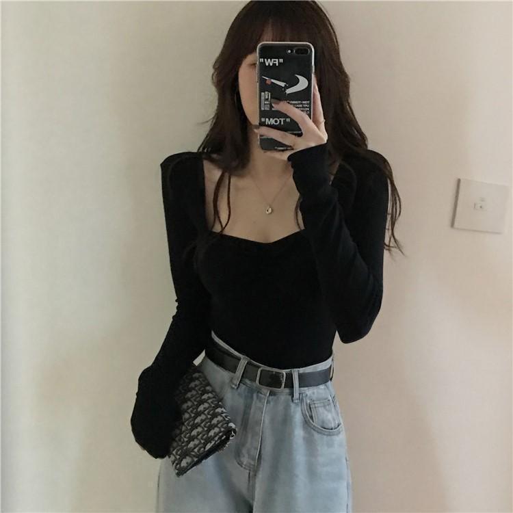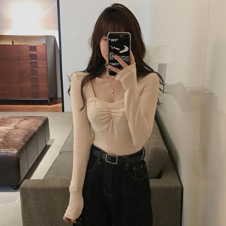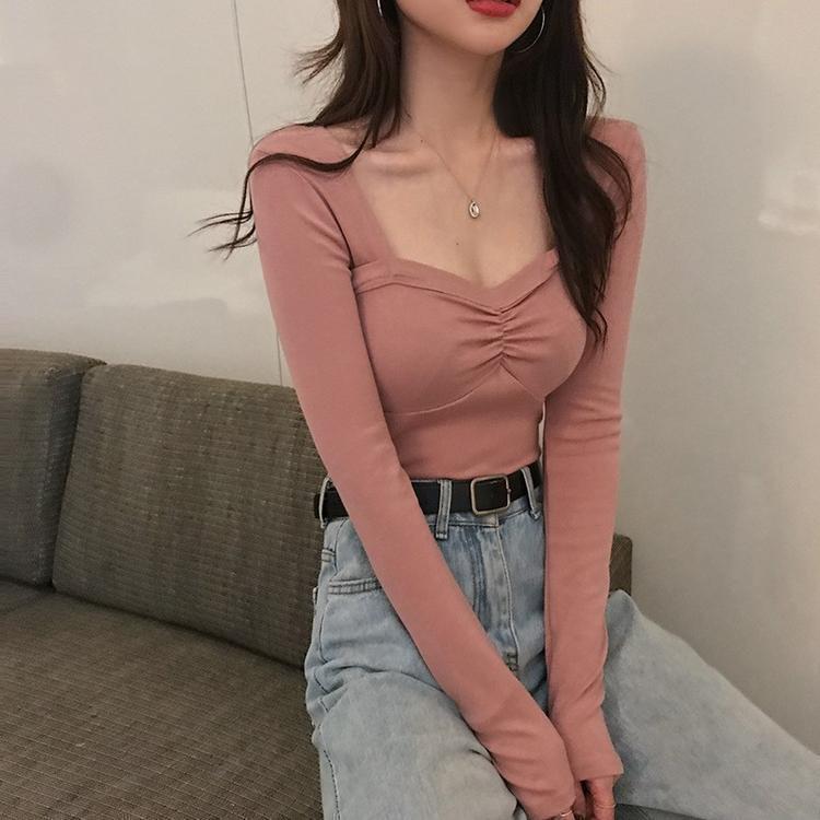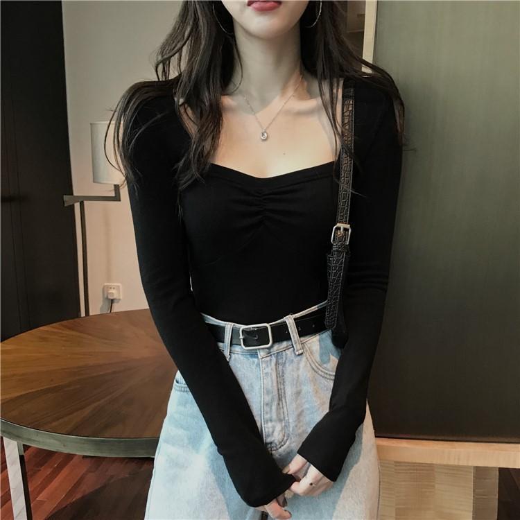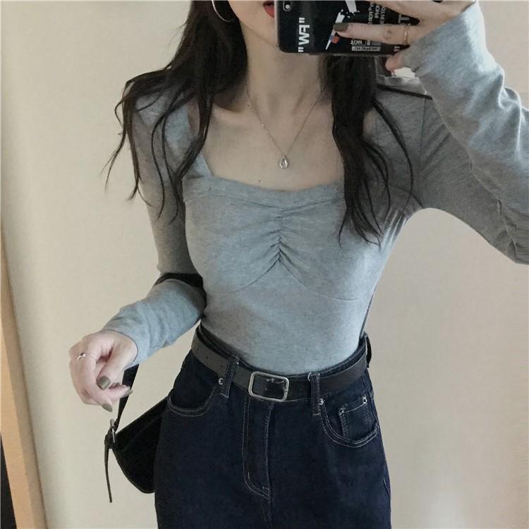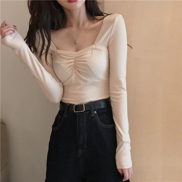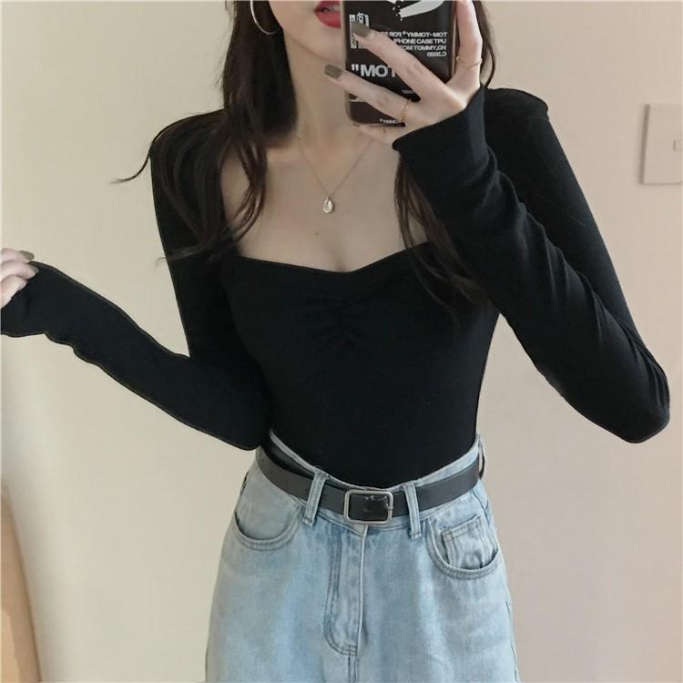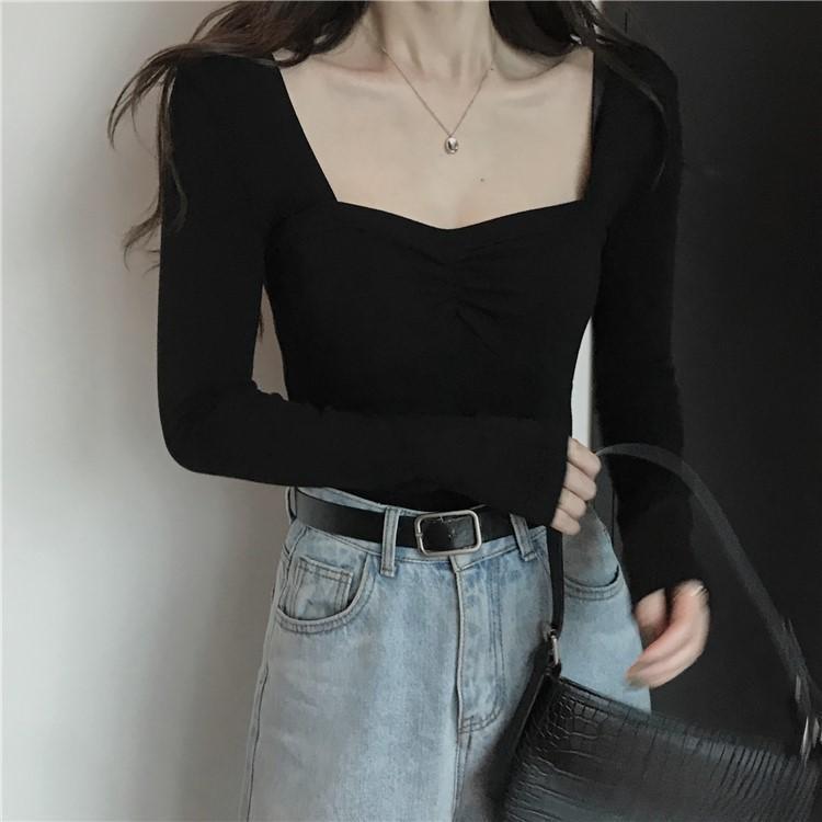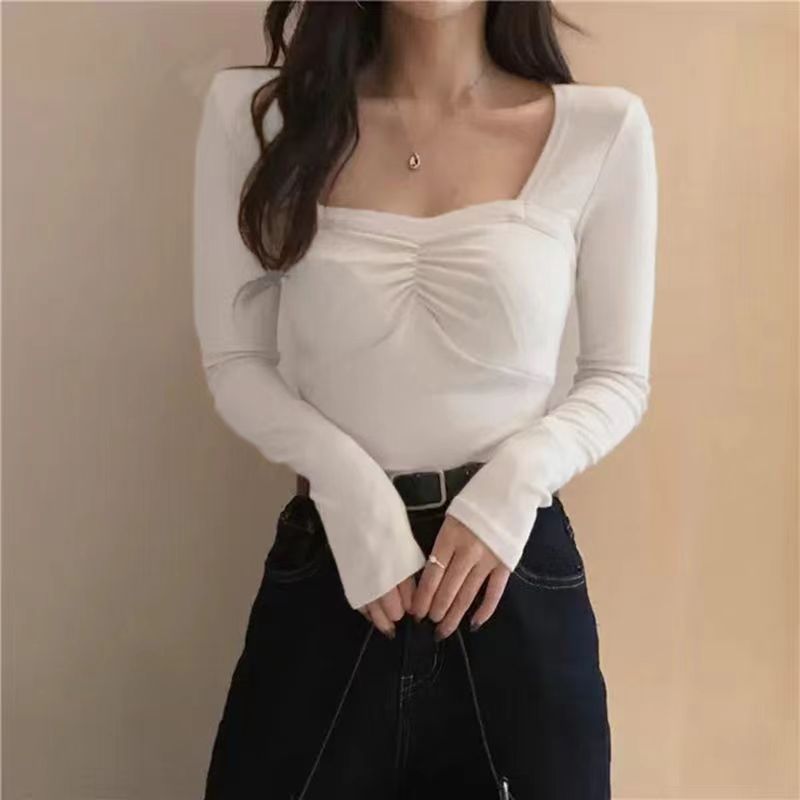 프렌치 스퀘어 넥 셔츠, 봄, 가을 플러스 사이즈 여성복, 아름다운 탑, 타이트한 순수한 욕망 스타일 이너 티셔츠, 여성용 탑