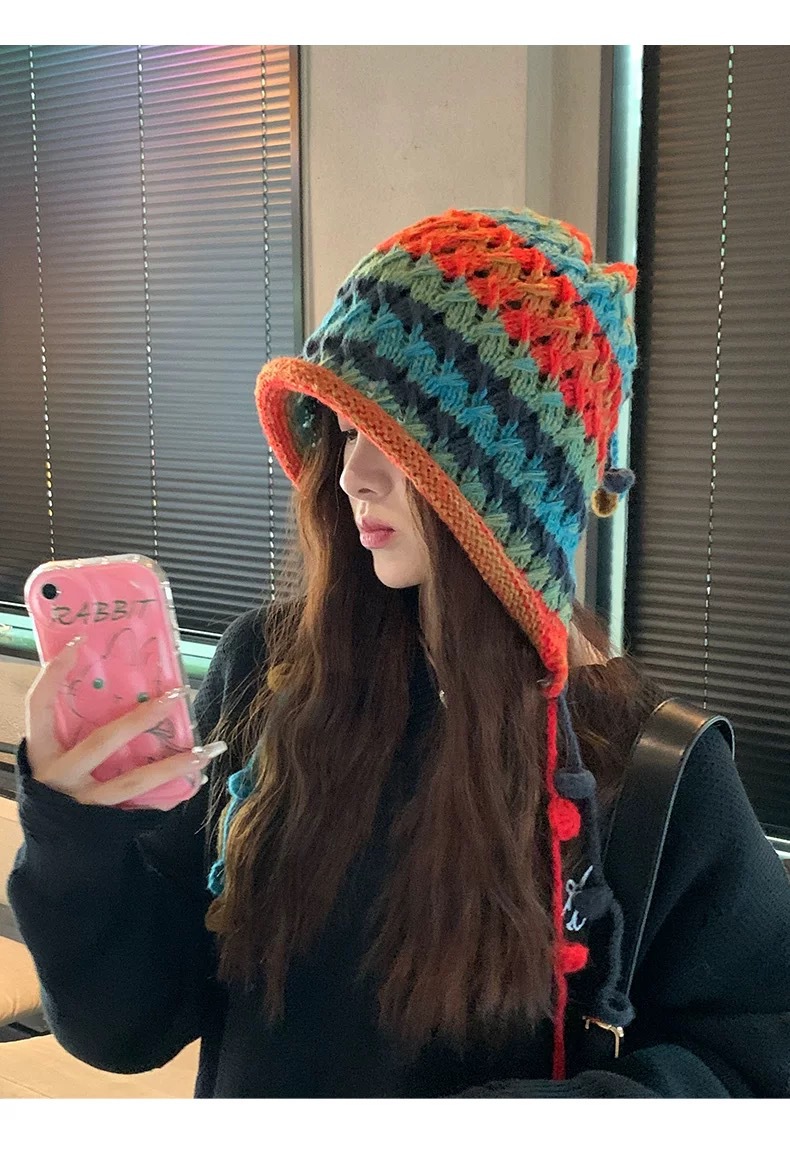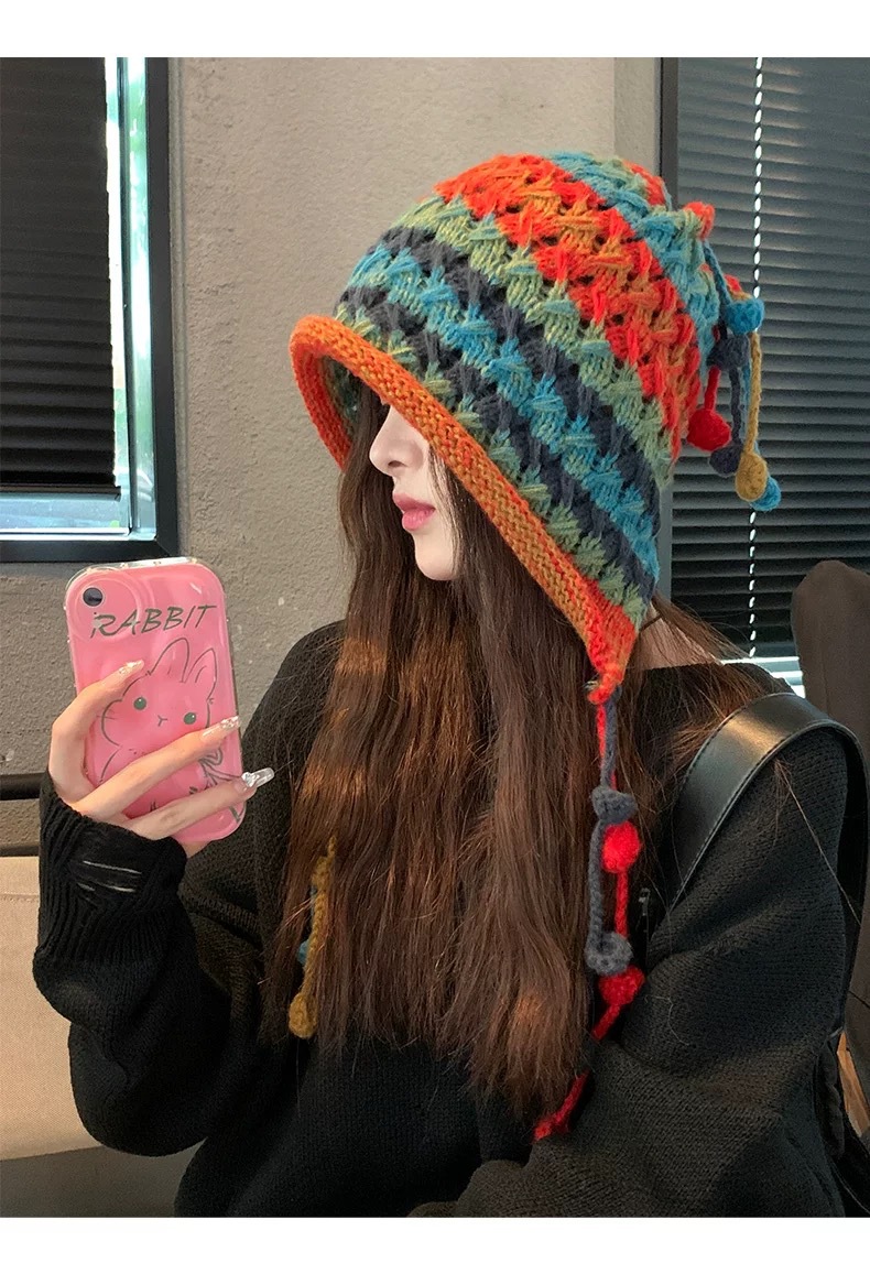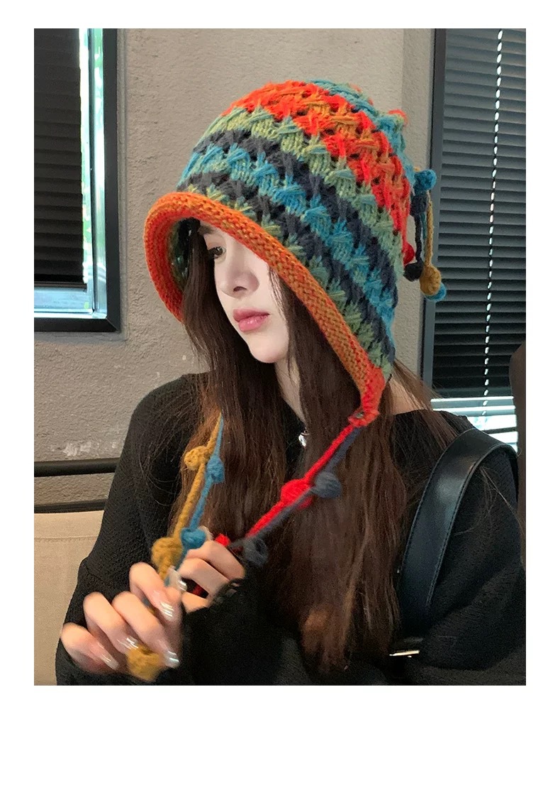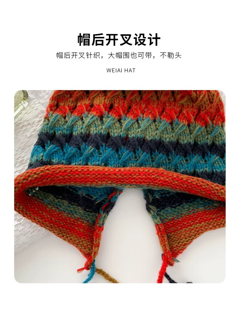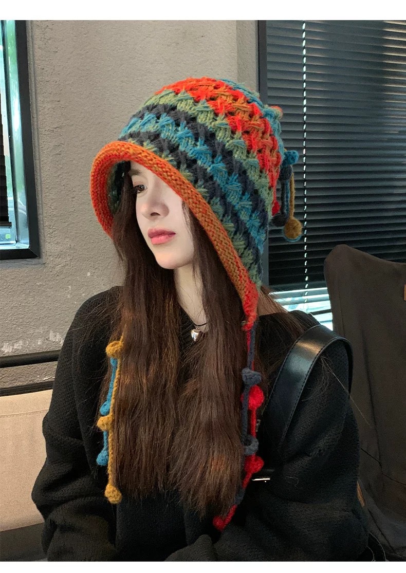여성용 에스닉 스타일 레인보우 모직 모자, 귀여운 따뜻한 니트 모자, 달콤한 가을 겨울 귀 보호 태슬 브레이드 토캡