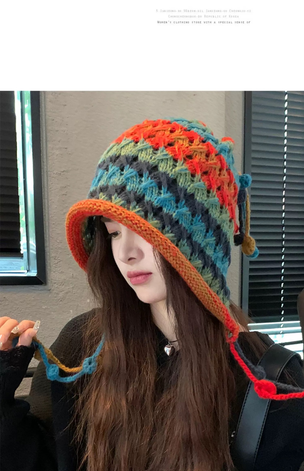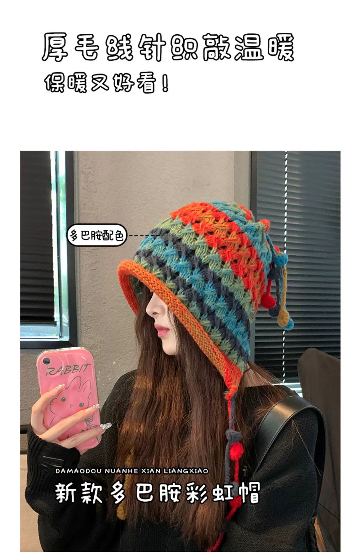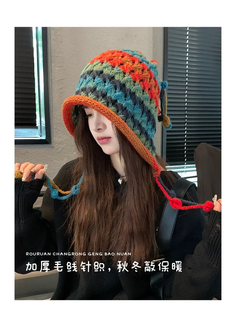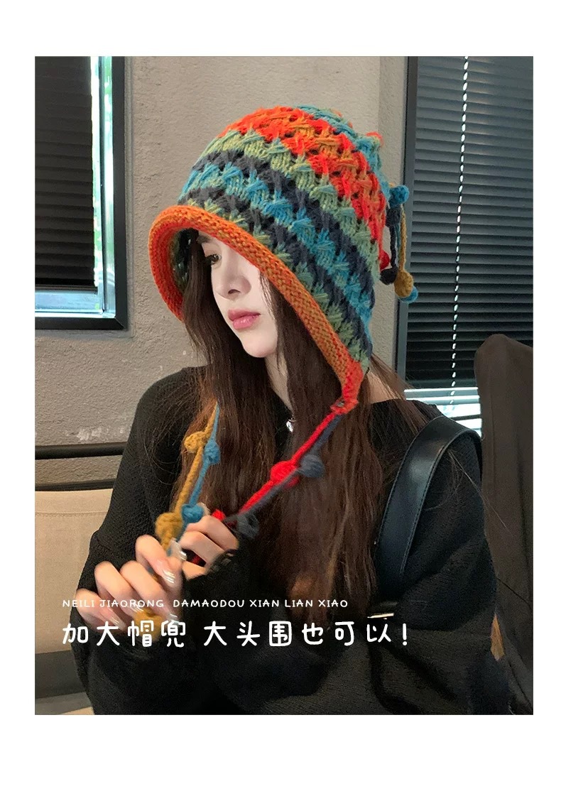 여성용 에스닉 스타일 레인보우 모직 모자, 귀여운 따뜻한 니트 모자, 달콤한 가을 겨울 귀 보호 태슬 브레이드 토캡