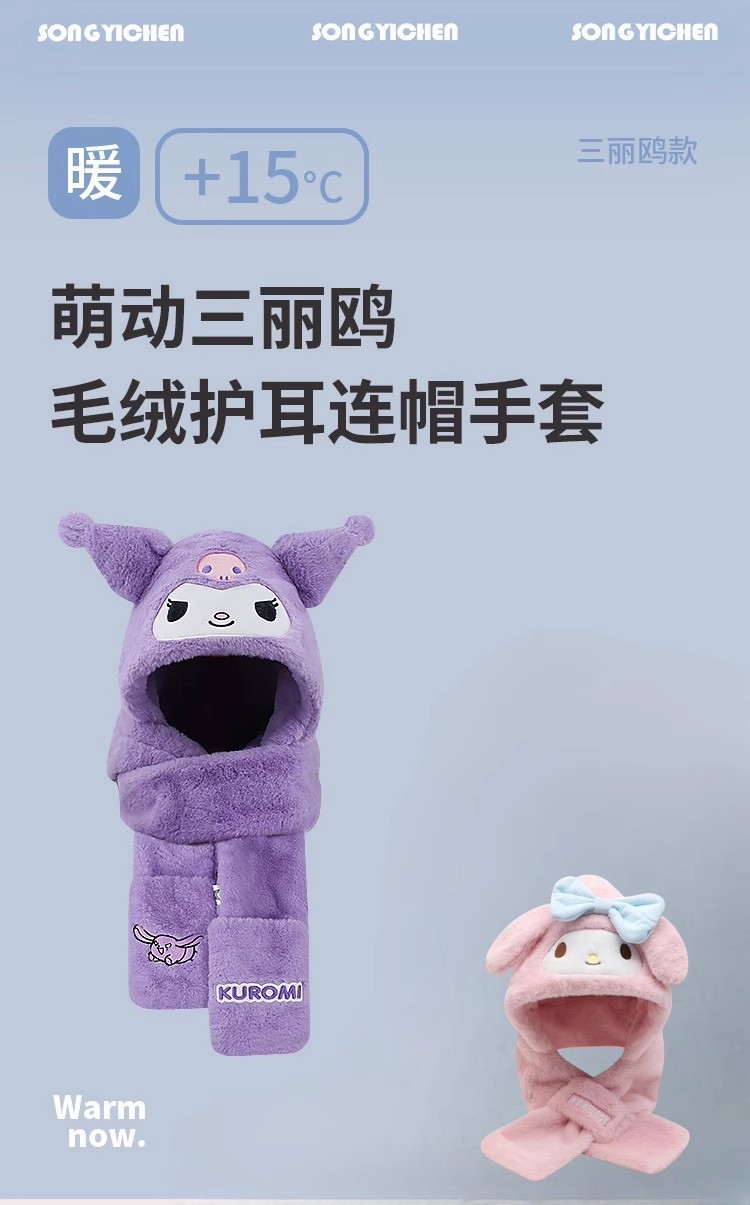 | 颜色 | 库洛米【帽子+围巾-毛绒保暖二件套】, 美乐蒂【帽子+围巾-毛绒保暖二件套】, 玉桂狗【帽子+围巾-毛绒保暖二件套】, 库洛米【帽子+围巾+手套-毛绒保暖三件套】, 美乐蒂【帽子+围巾+手套-毛绒保暖三件套】, 玉桂狗【帽子+围巾+手套-毛绒保暖三件套】 | 尺码 | S【适合3到12岁】 |