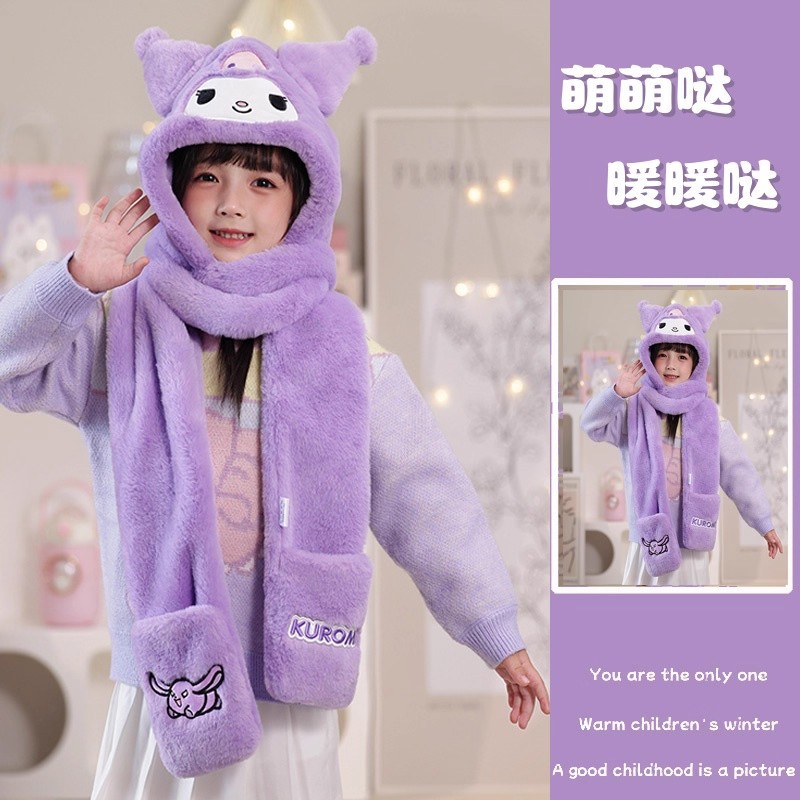 쿠로미 어린이 3피스 스카프와 모자 일체형 귀여운 겨울 따뜻한 귀 보호 시나몬 개 멜로디 플러시 모자