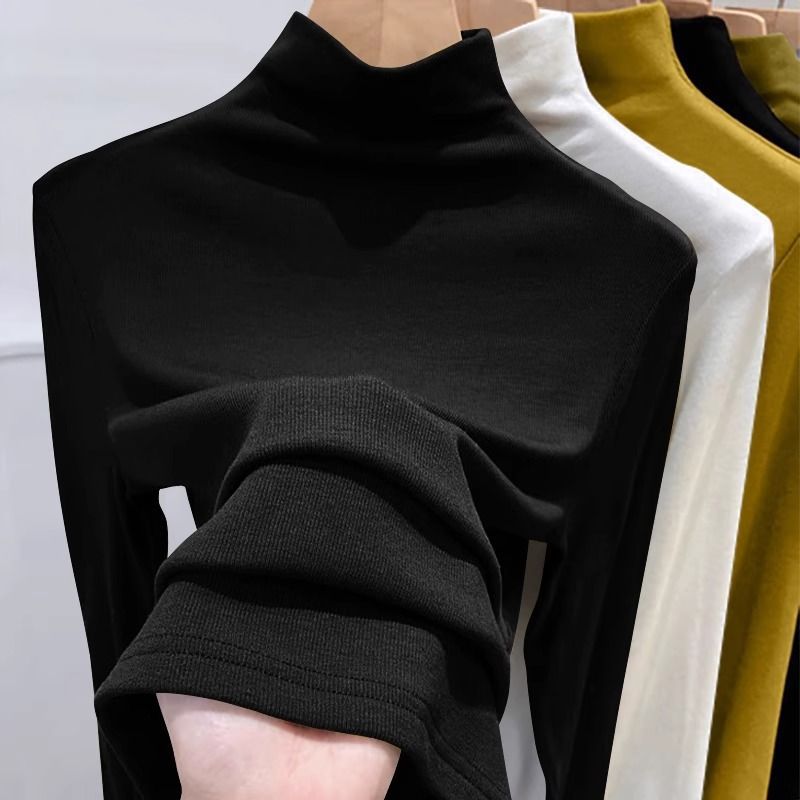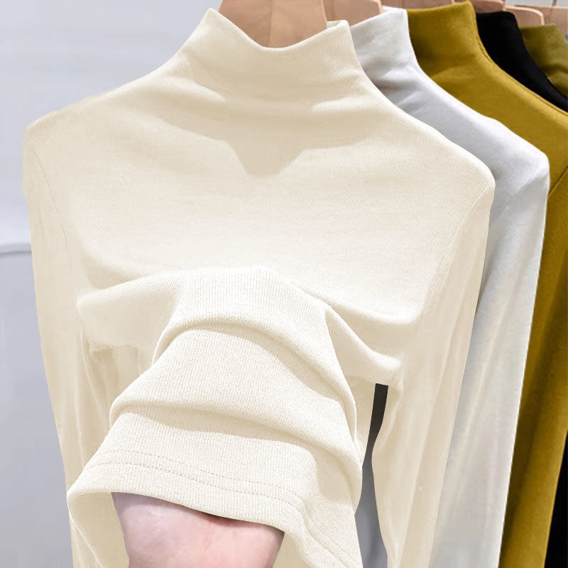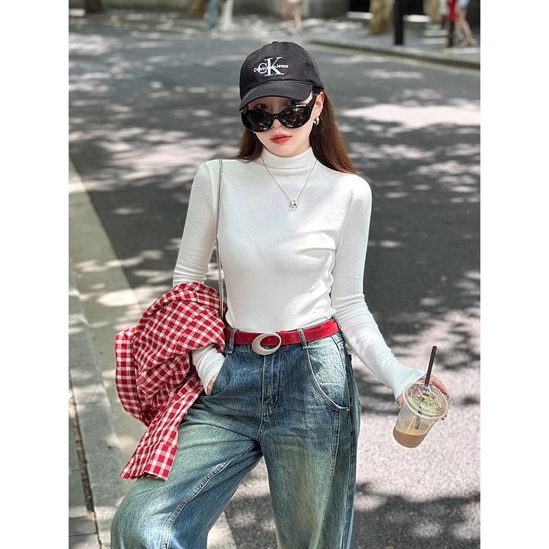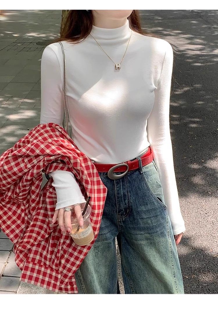 여성용 DeRong Ancora 레드 하프 터틀넥 셔츠, 가을 겨울 신상 슬림핏 따뜻한 티셔츠 긴팔 탑