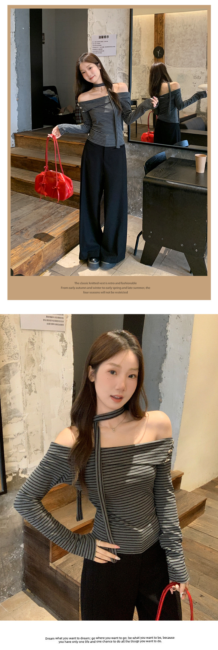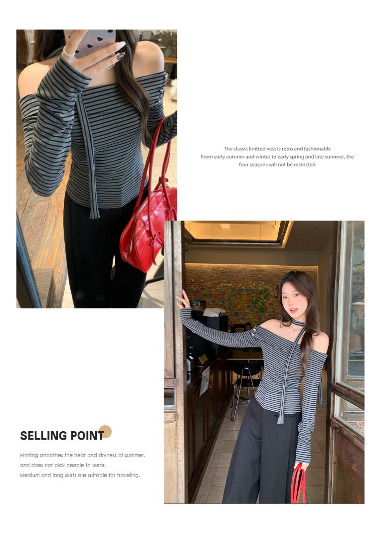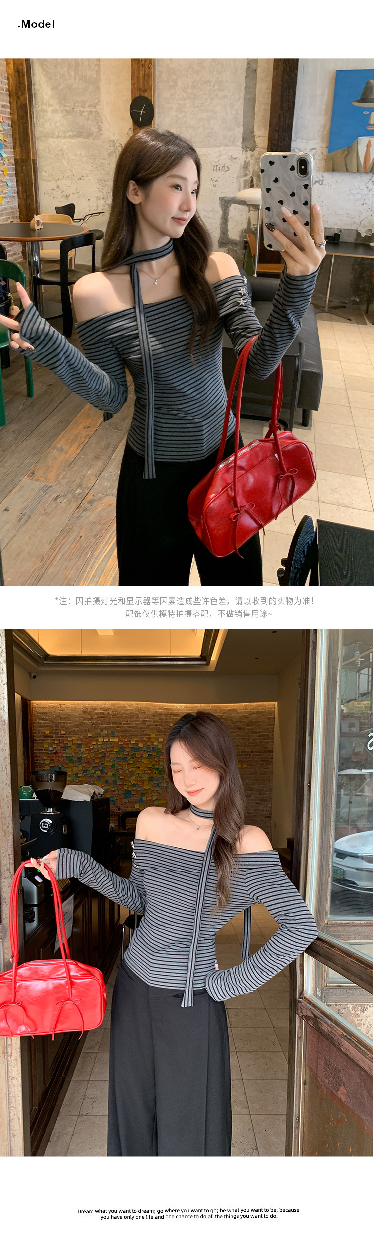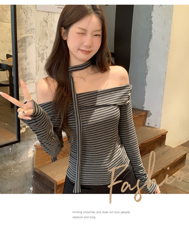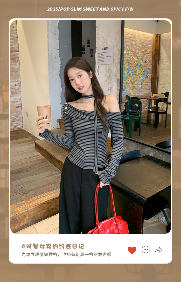 블랙 그레이 스트라이프 배색 원숄더 쇄골 노출 긴팔 티셔츠 여성용 2026년 초가을 불규칙 리본 장식 우아한 탑