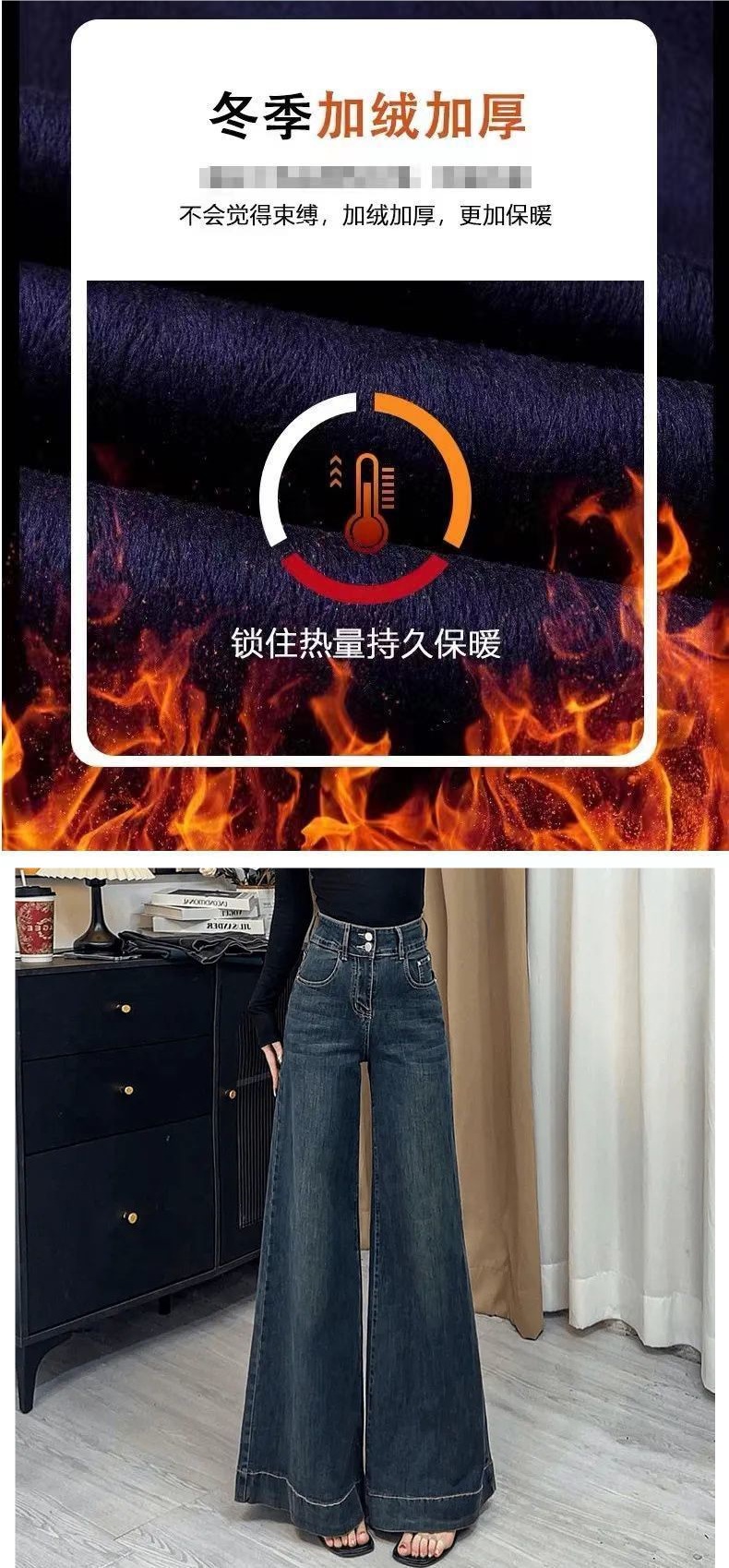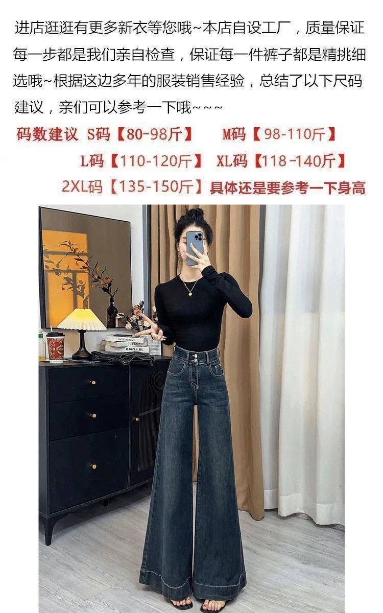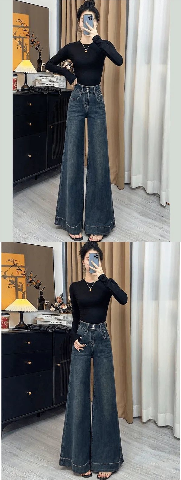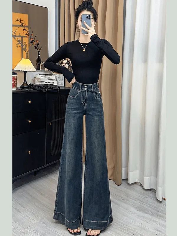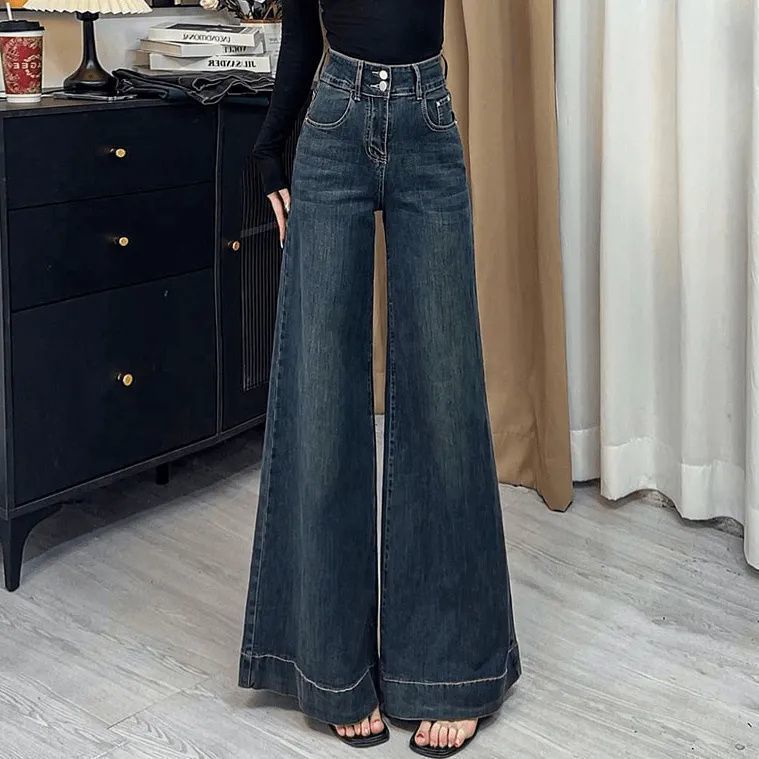 여성용 진한 파란색 마이크로 플레어 청바지 봄, 가을 새로운 스타일 복고풍 로우 웨이스트 기질 와이드 레그 슬리밍 스트레이트 레그 말굽 바지