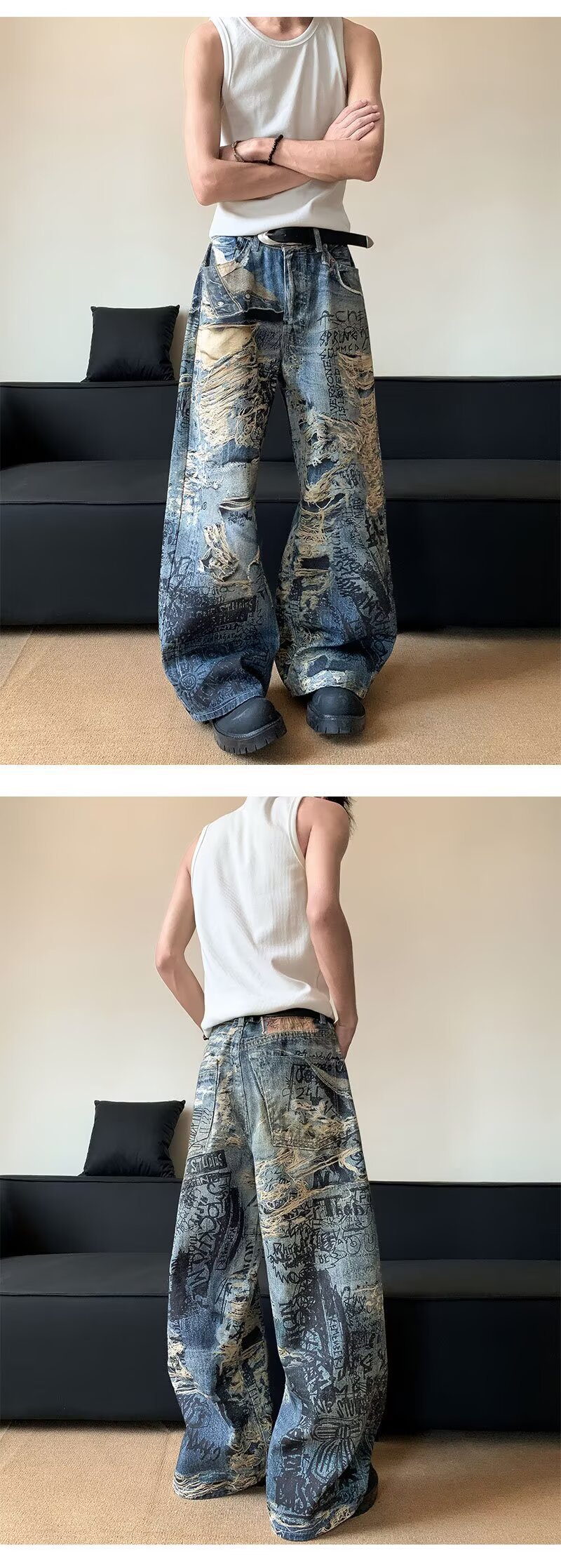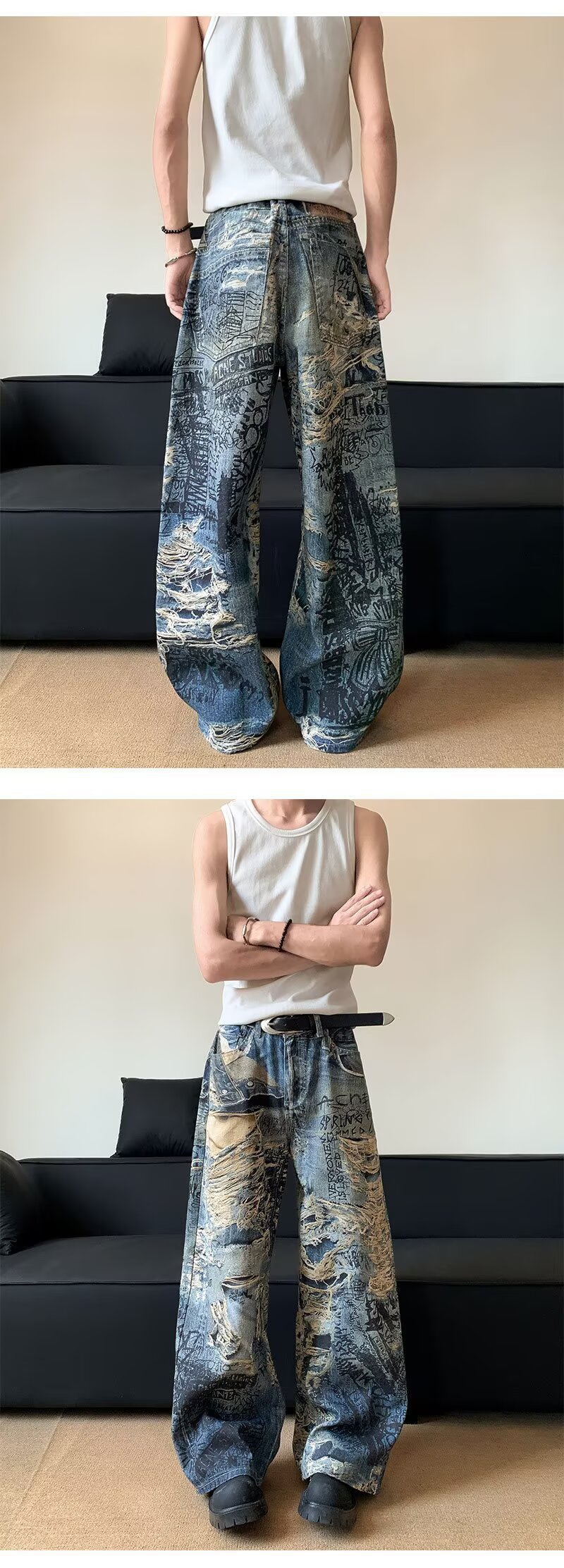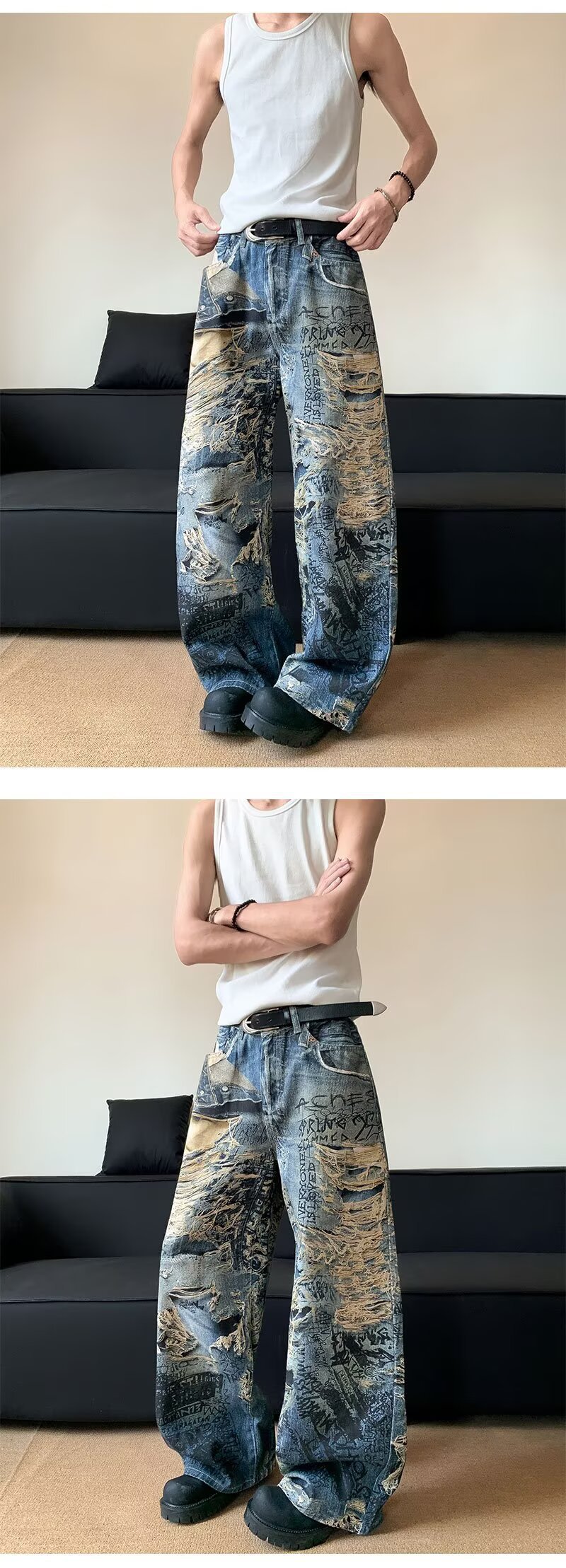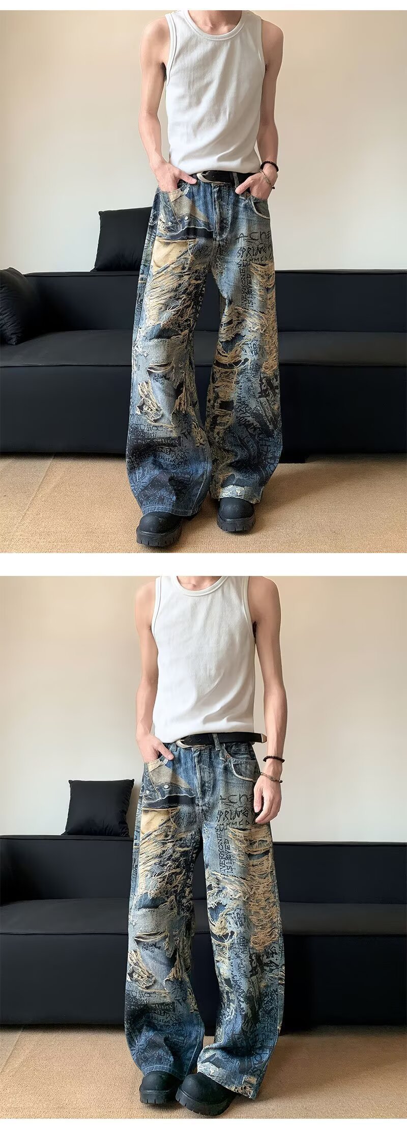남성용 및 여성용 워싱 및 디스트레스드 3D 디지털 프린트 세이버 청바지, 마이크로 플레어, 슬리밍, 루즈, 스트레이트, 와이드 레그, 바닥 길이 바지