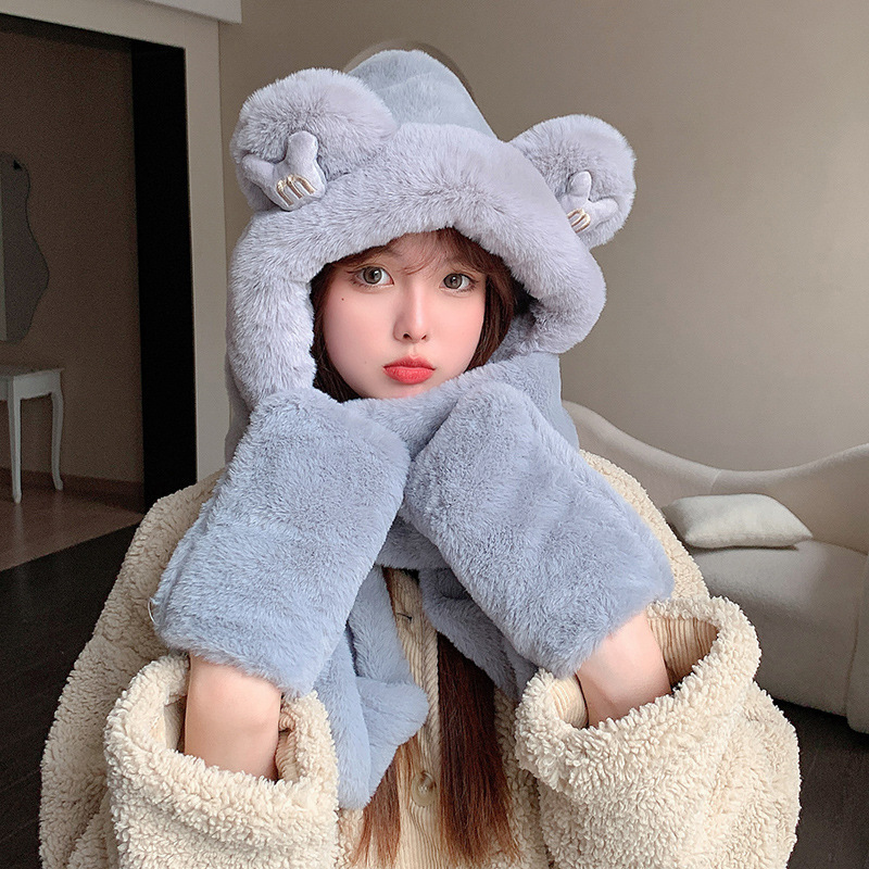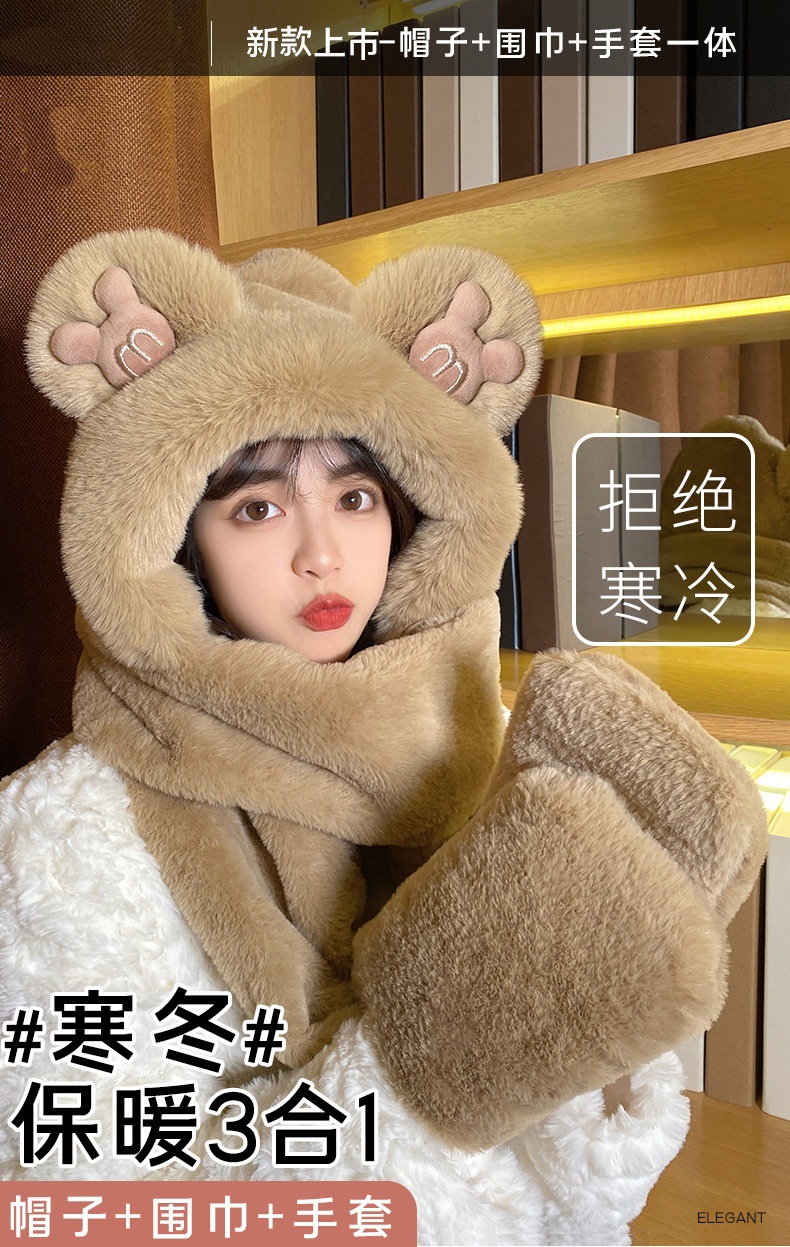곰 스카프 여성 겨울 한국어 버전 다용도 모자와 스카프 일체형 귀여운 귀 보호 따뜻한 후드 장갑 3 피스 세트