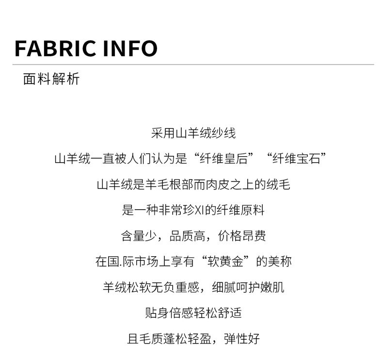 | 风格 | 百搭, 优雅, 极简, 休闲风, 简约, 轻奢风, 高级感 | 面料名称 | 山羊绒 |