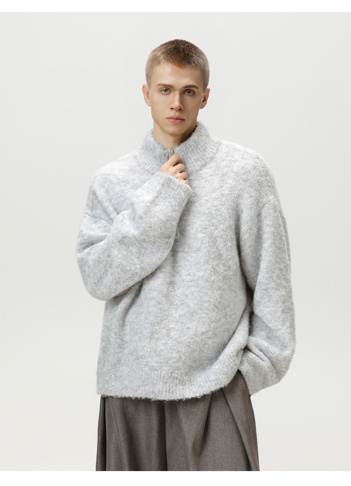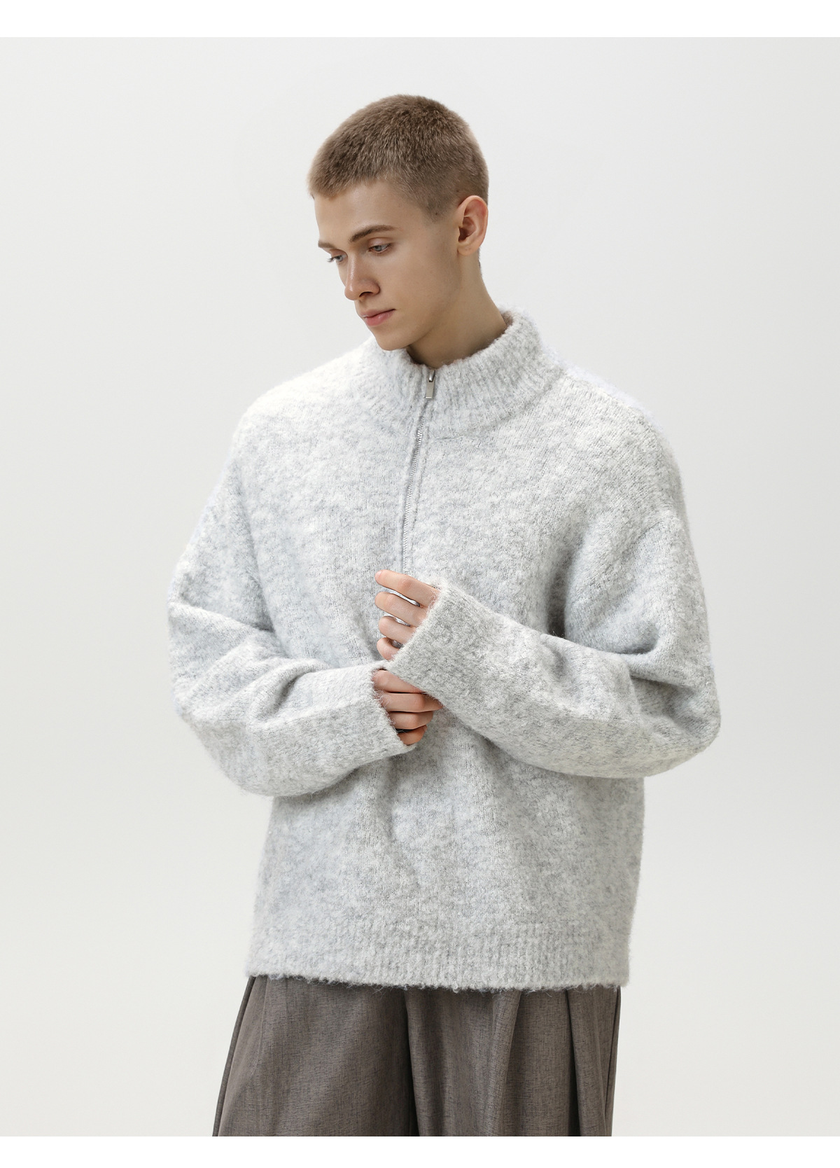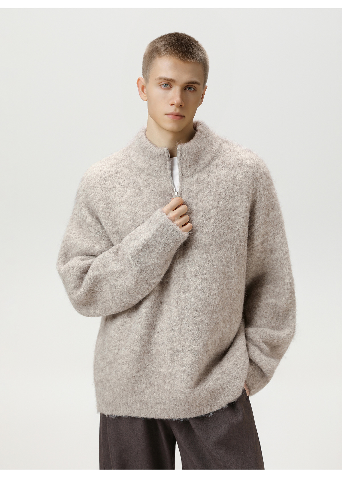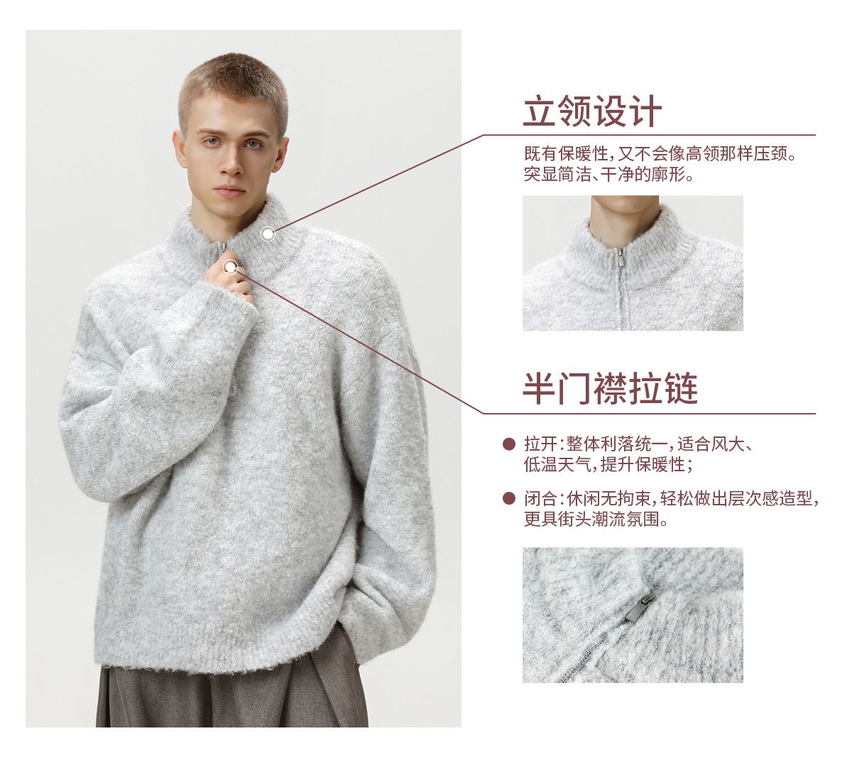 두꺼운 원사 소재의 풀오버 스웨터, 가을 겨울용 하프 지퍼 스탠드 칼라 니트, 루즈핏 레이지 스타일 상의/코트 q
