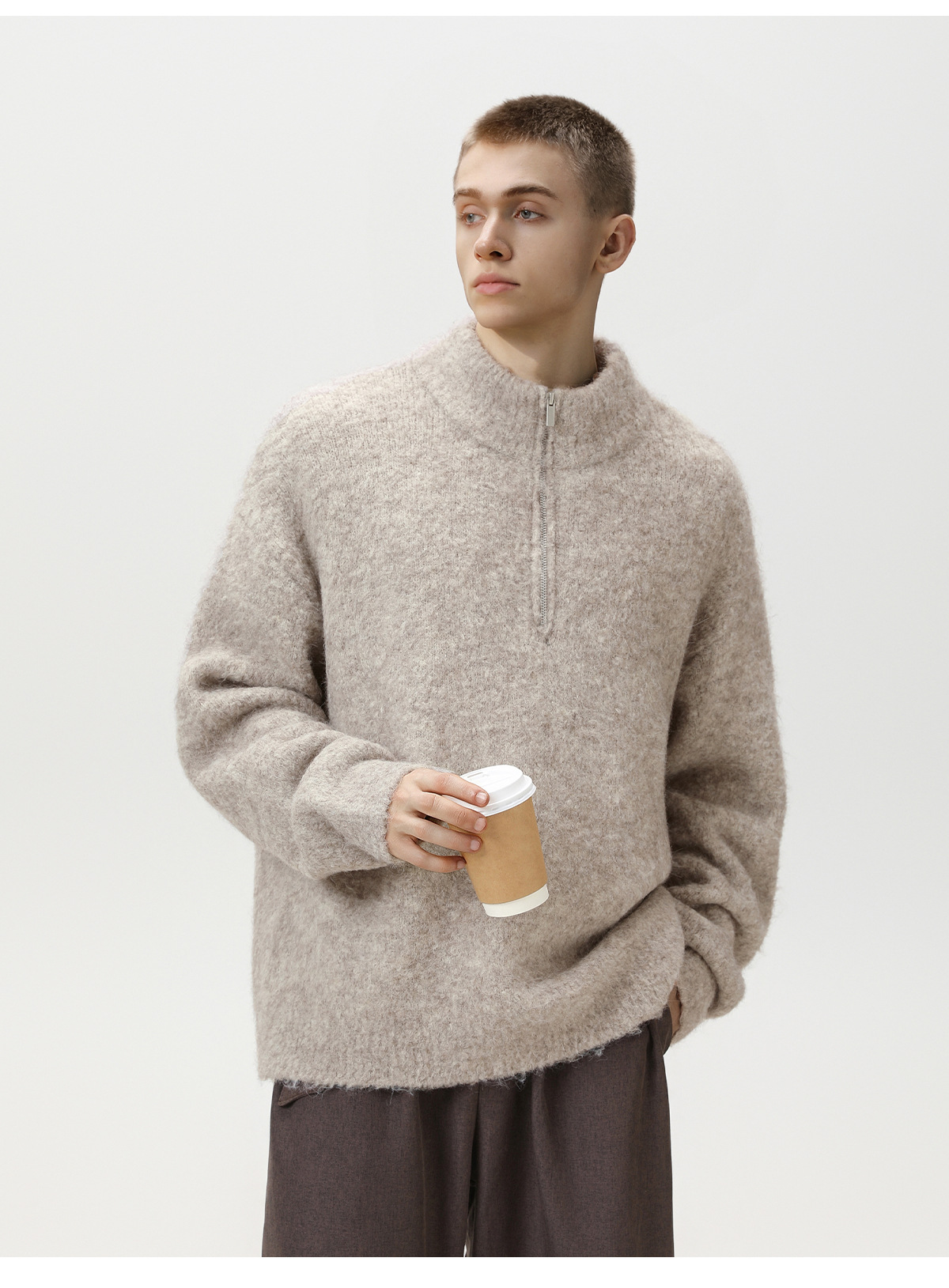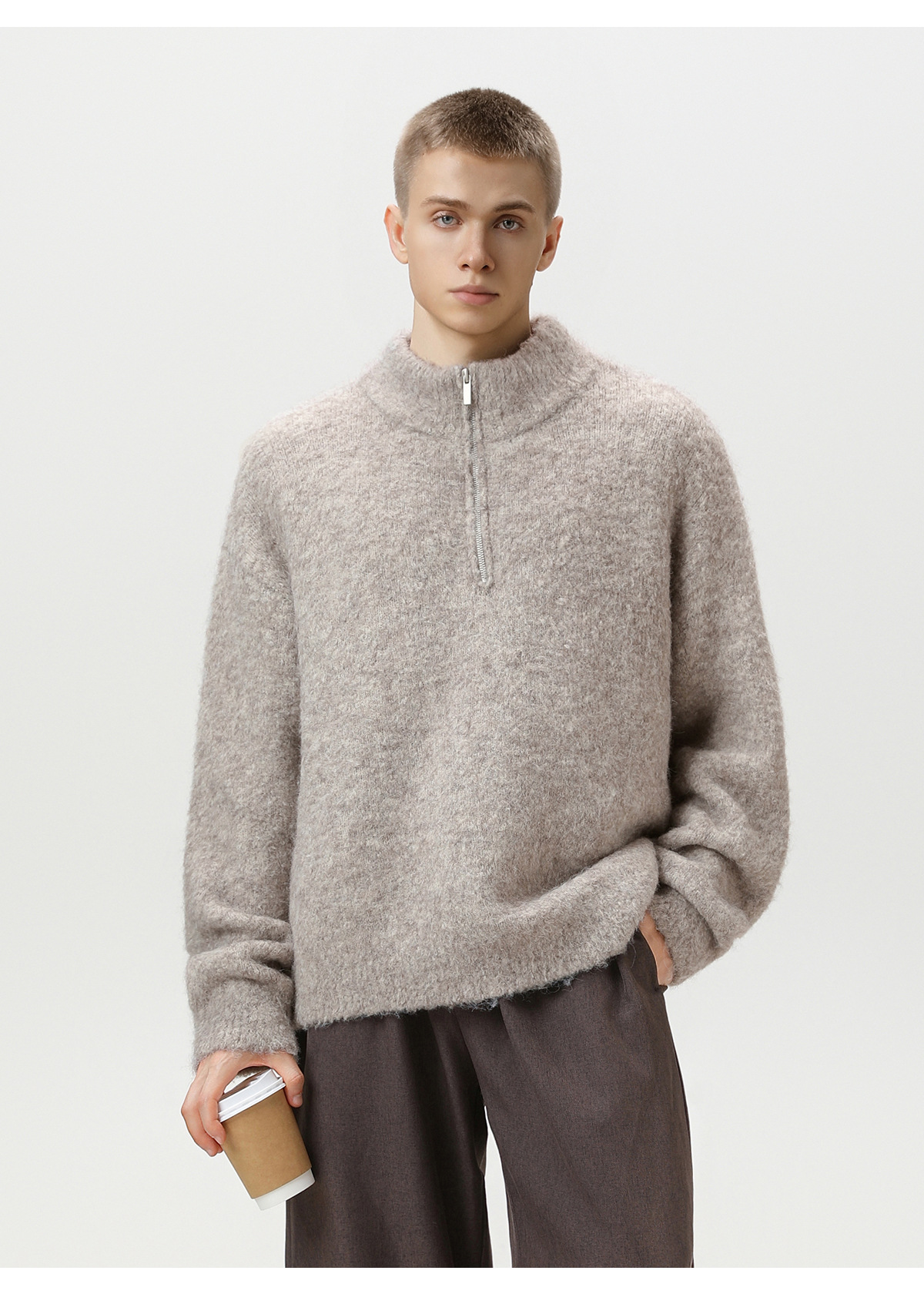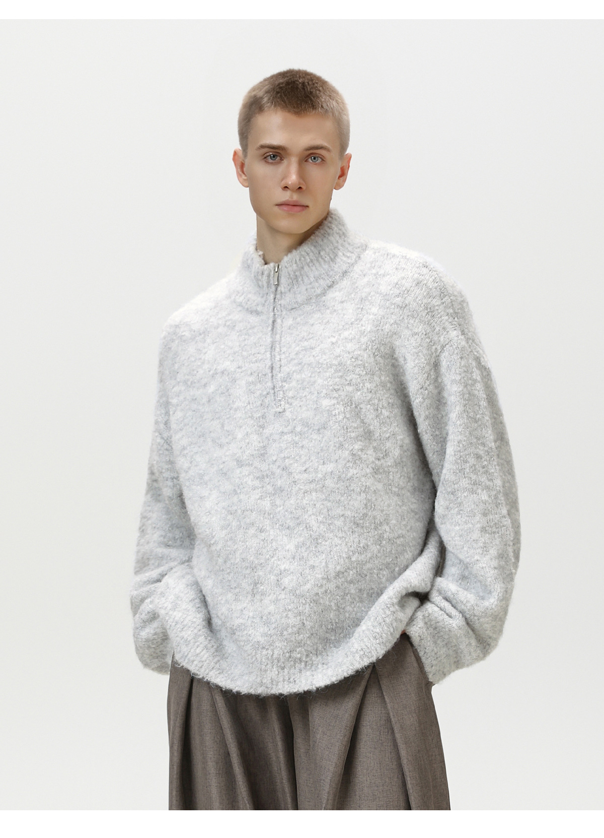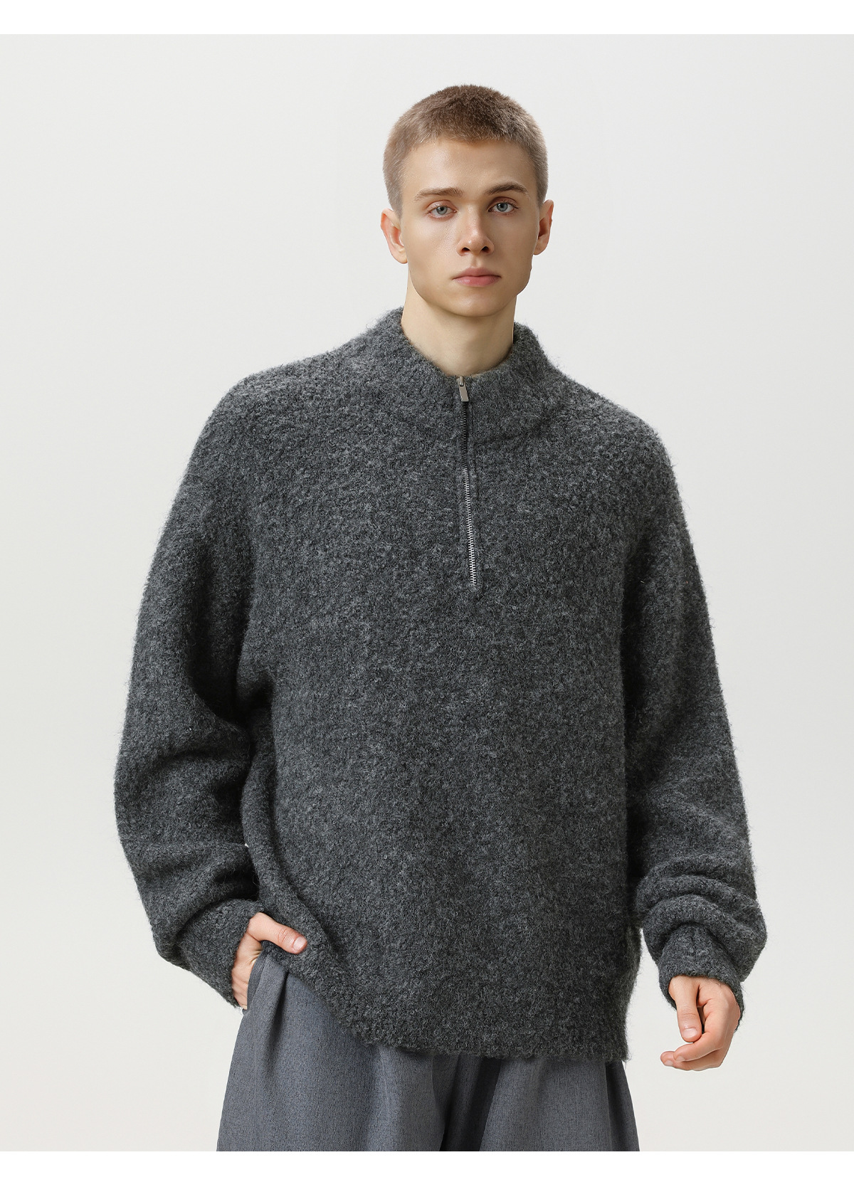 두꺼운 원사 소재의 풀오버 스웨터, 가을 겨울용 하프 지퍼 스탠드 칼라 니트, 루즈핏 레이지 스타일 상의/코트 q