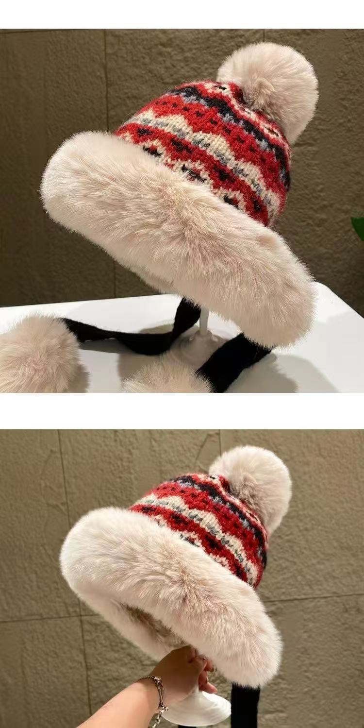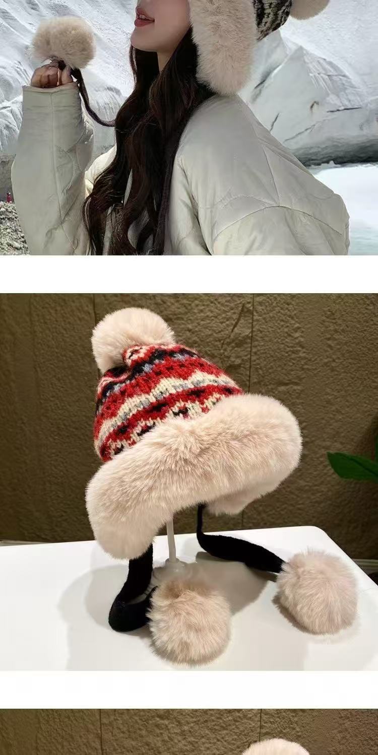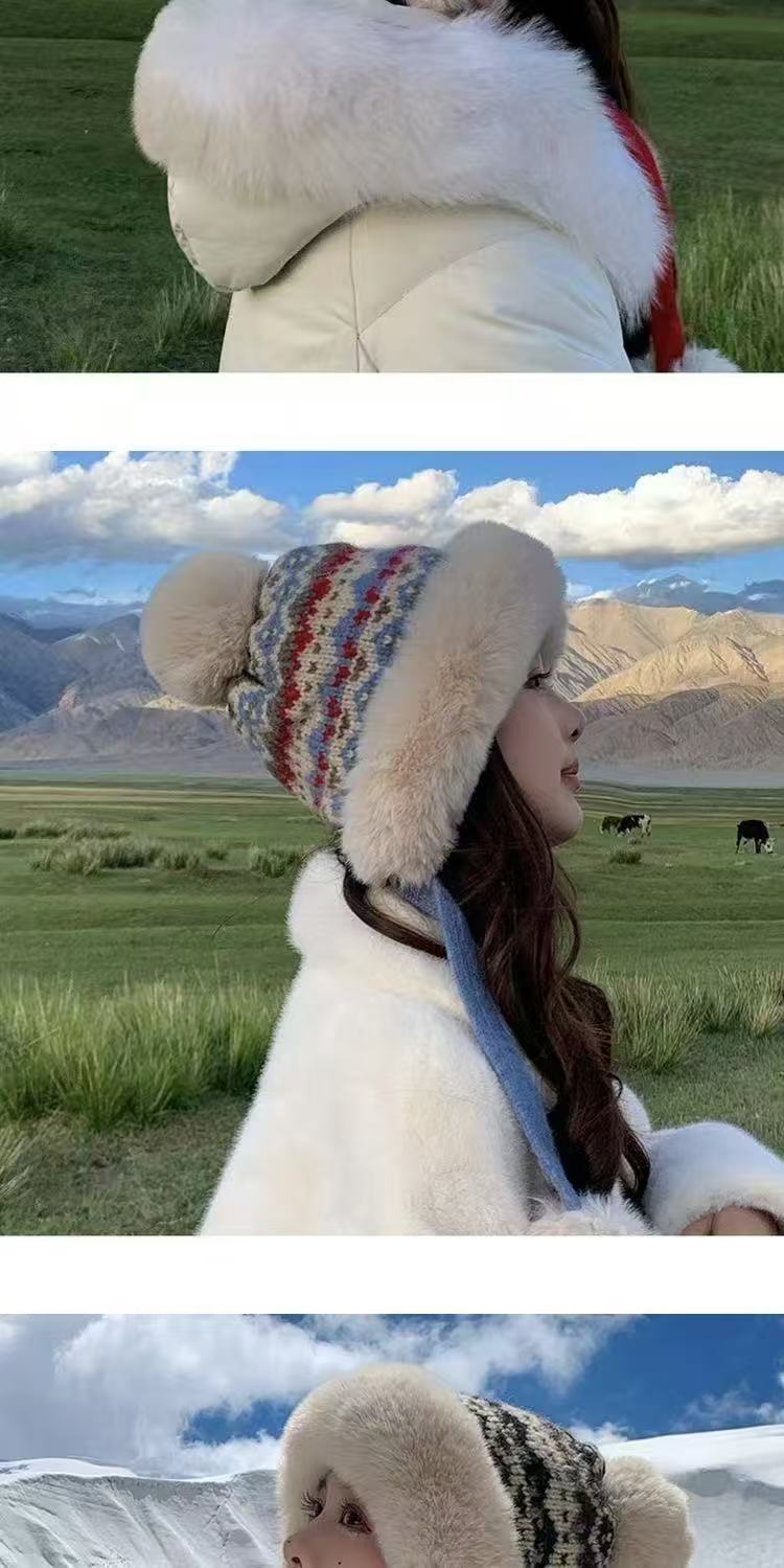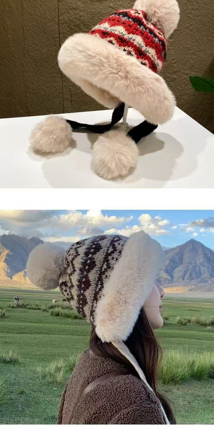 여성을 위한 겨울 두꺼운 민족 따뜻한 플러시 레이펑 니트 모자, 방한 및 귀 보호 기능이 있는 벨벳, 인기 있는 북동부 모직 모자