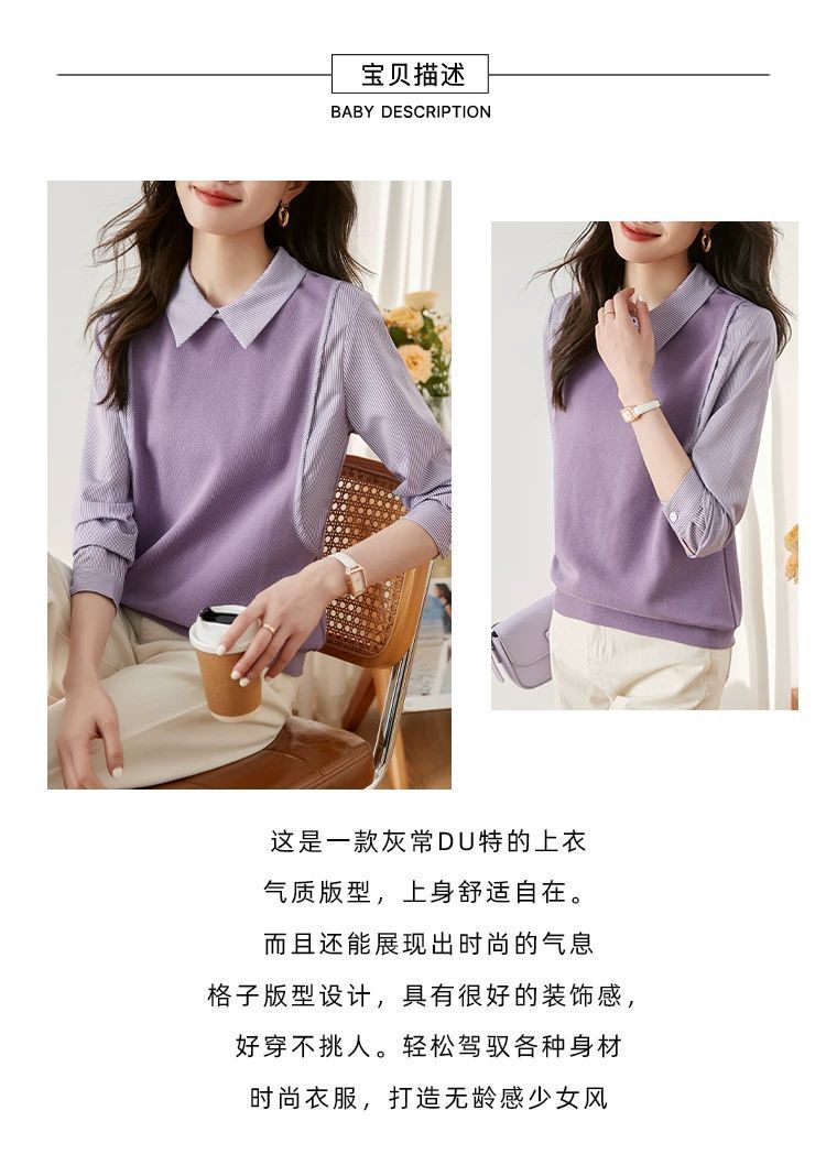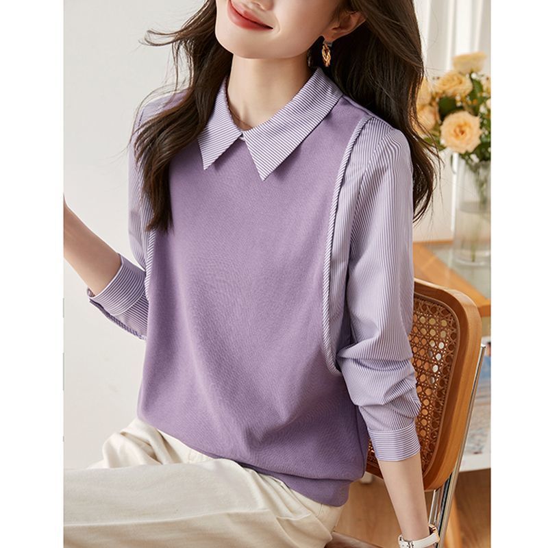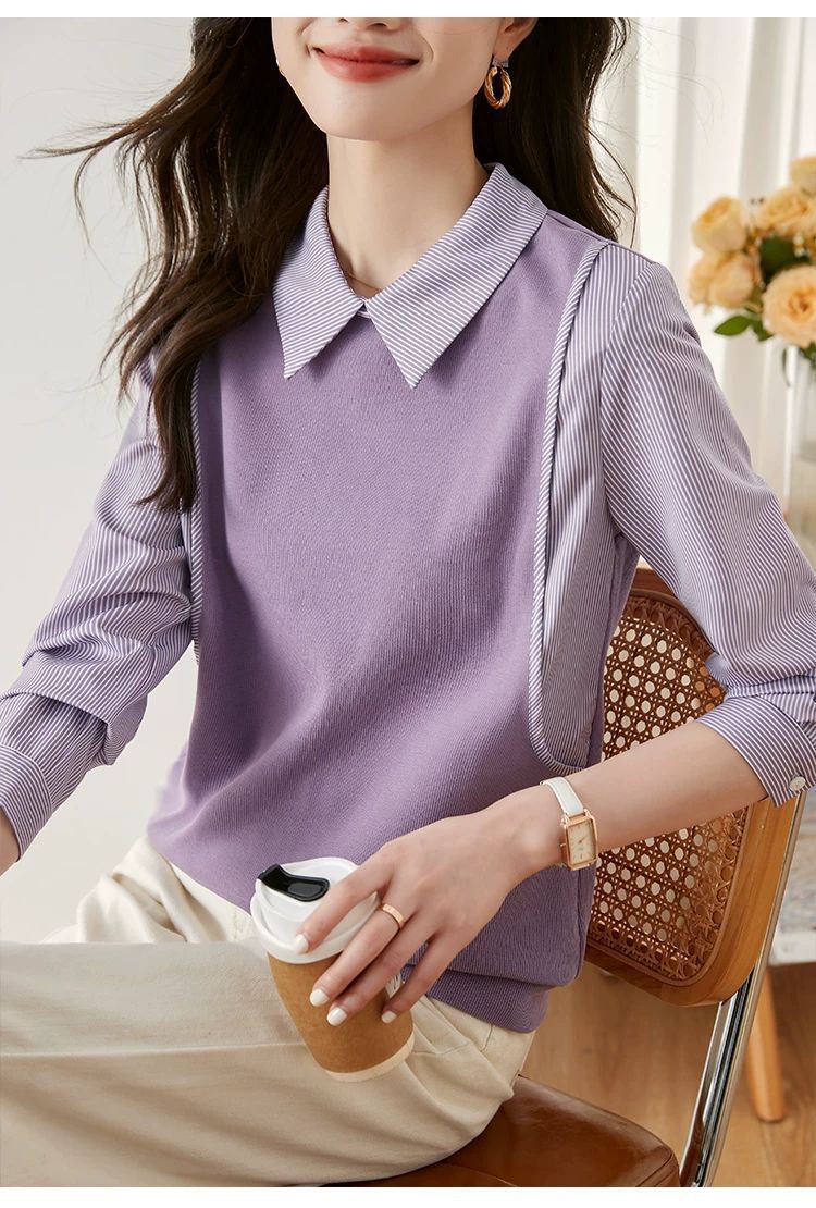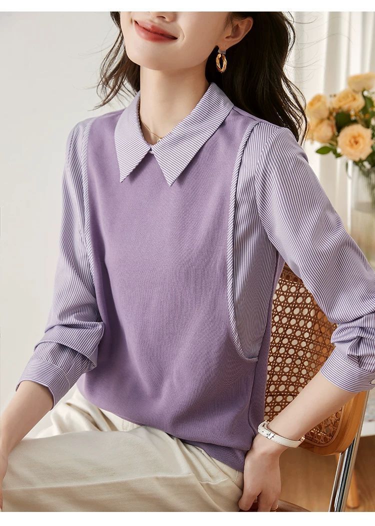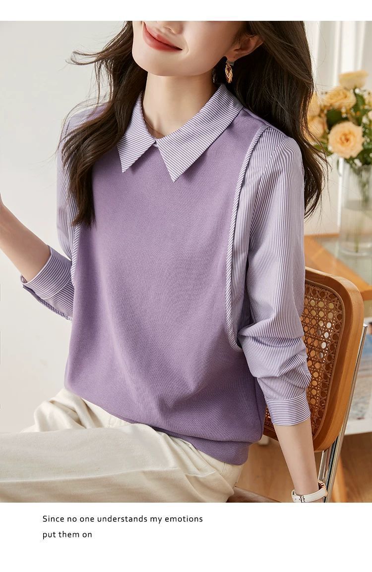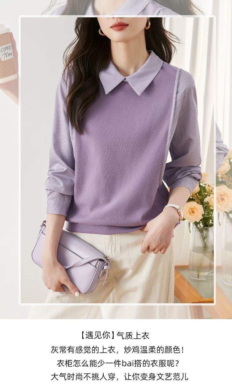 여성을위한 프랑스 줄무늬 가짜 투피스 긴팔 셔츠 가을 2025 새로운 가을 의류 세련된 니트 탑 셔츠