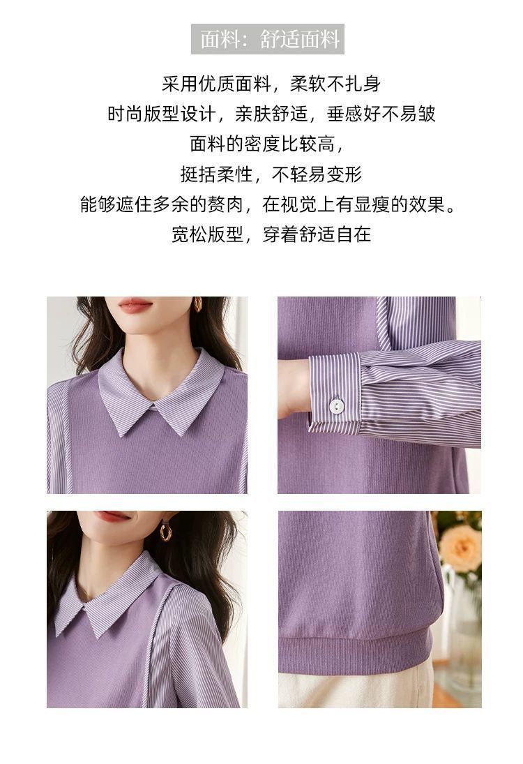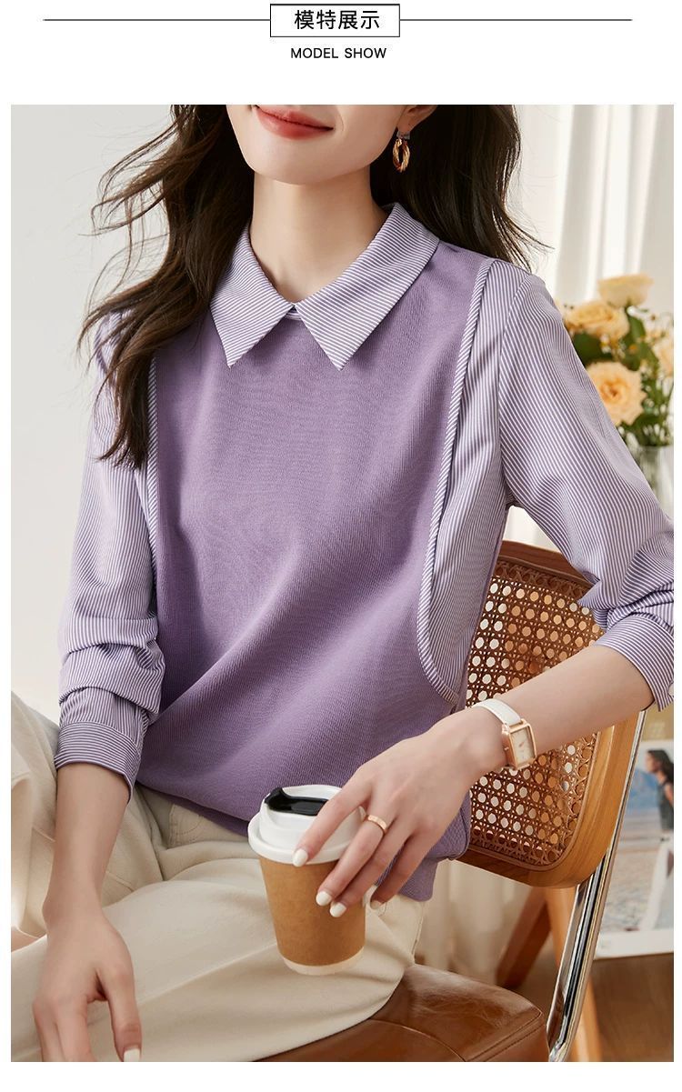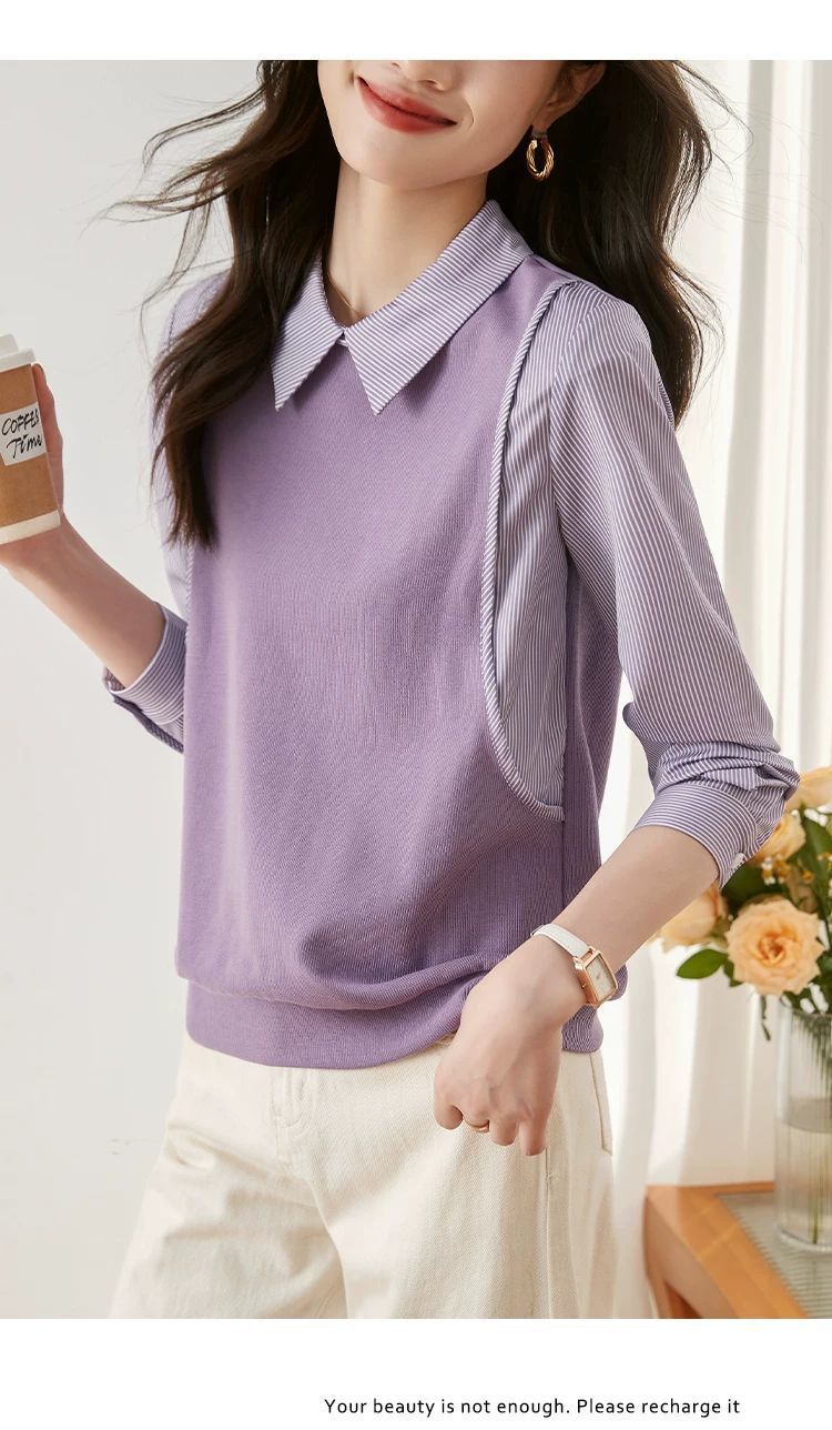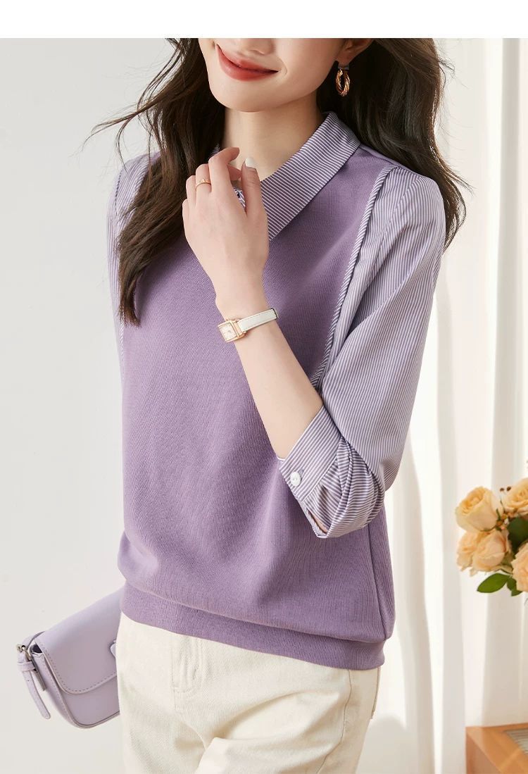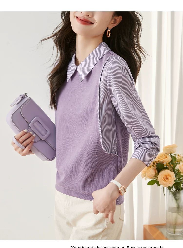 여성을위한 프랑스 줄무늬 가짜 투피스 긴팔 셔츠 가을 2025 새로운 가을 의류 세련된 니트 탑 셔츠