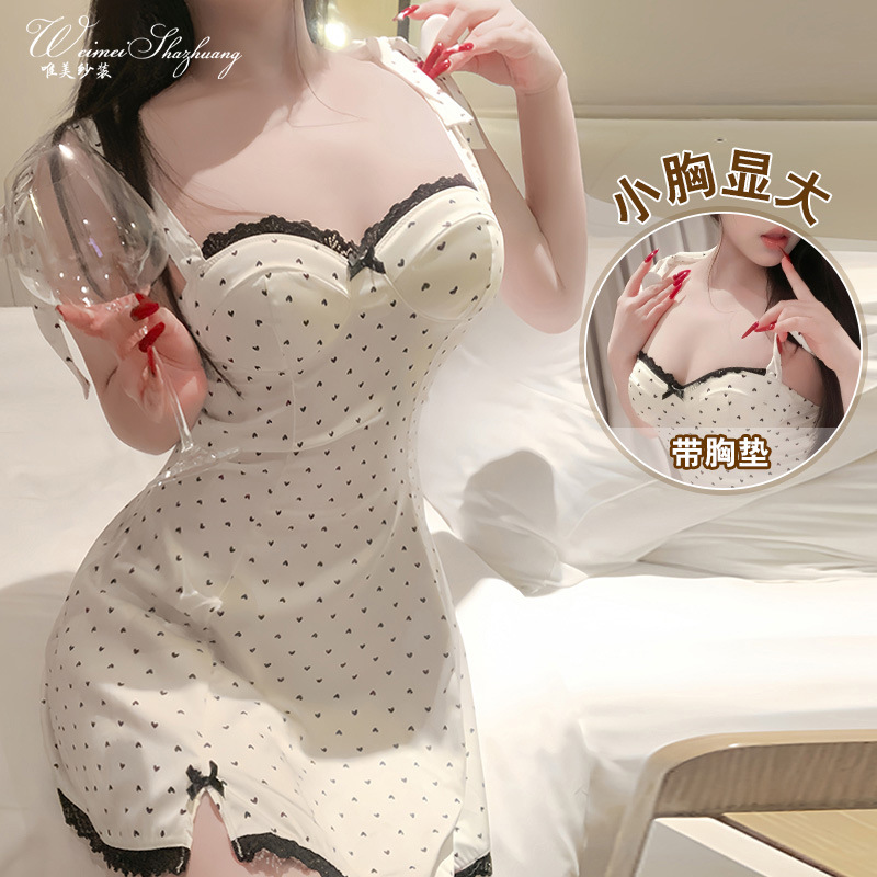 리본 도트무늬 슬림핏 프렌치 스위트 서스펜더 잠옷, 작은 가슴이 더 커 보이고 등이 없는 서스펜더 잠옷, 여성용 홈 잠옷