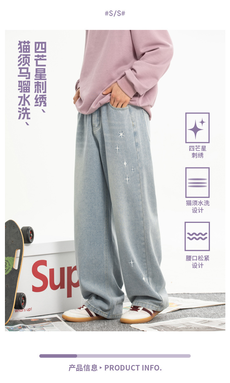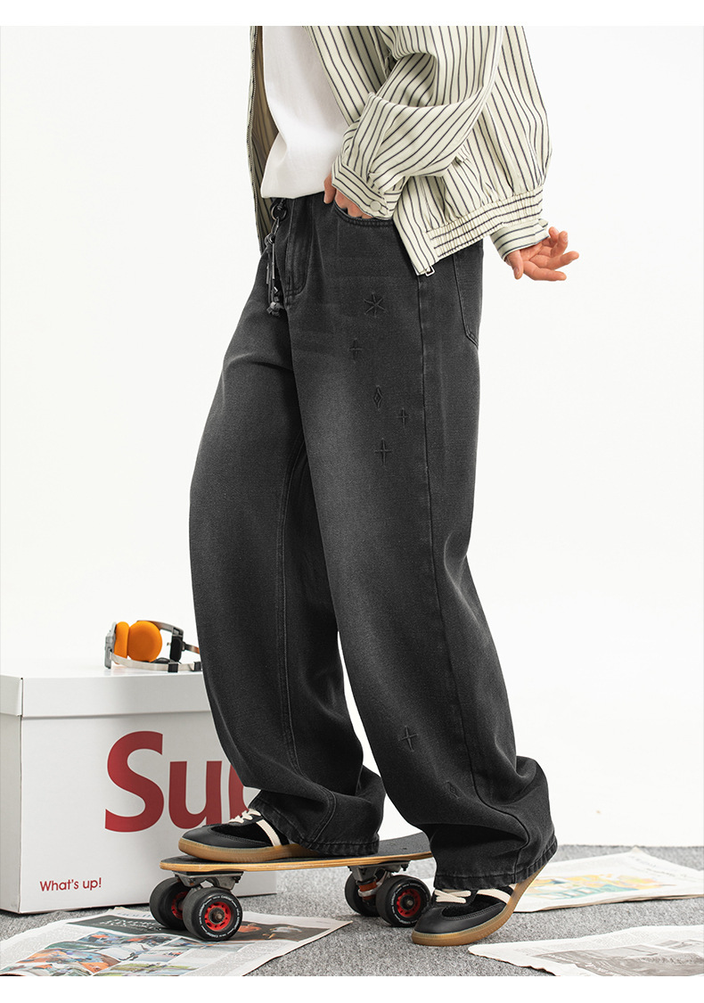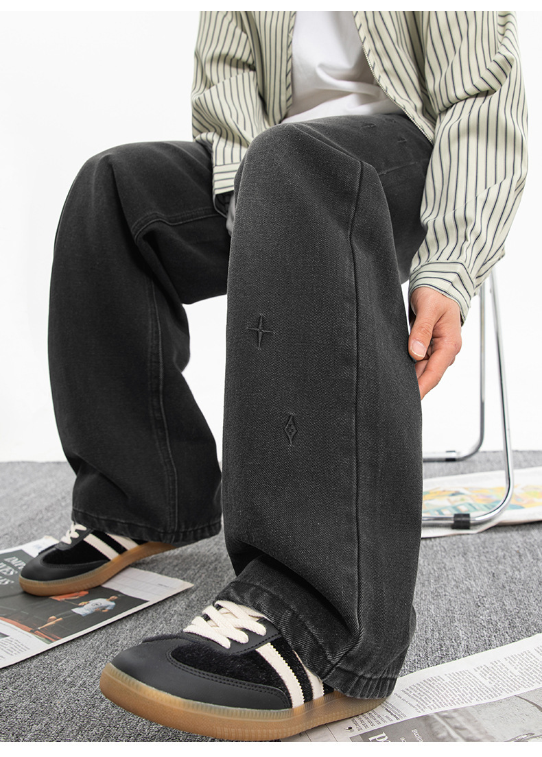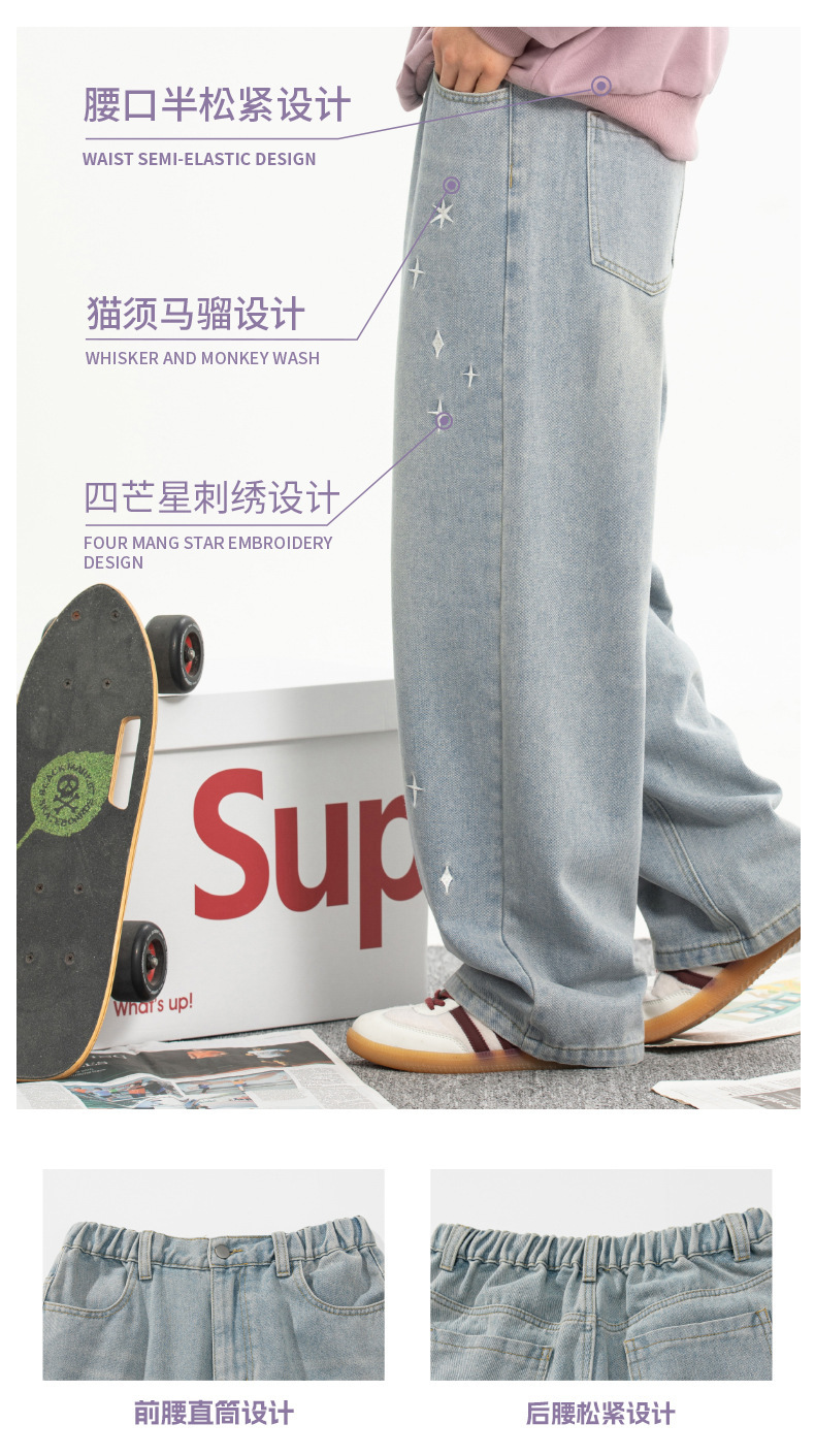 디스트레스드 워싱 스트레이트 청바지 2025 봄 신작 일본식 루즈 반탄성 허리 질감 자수 바지 q
