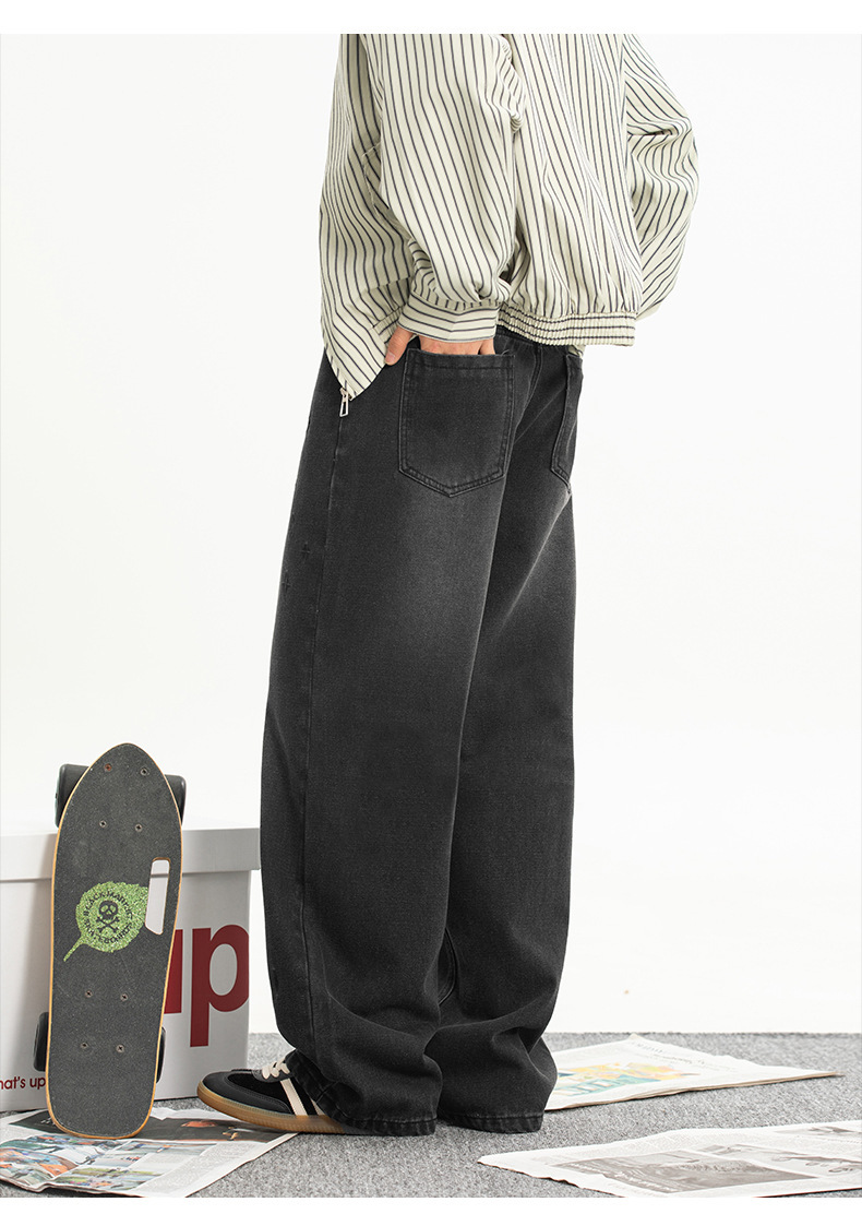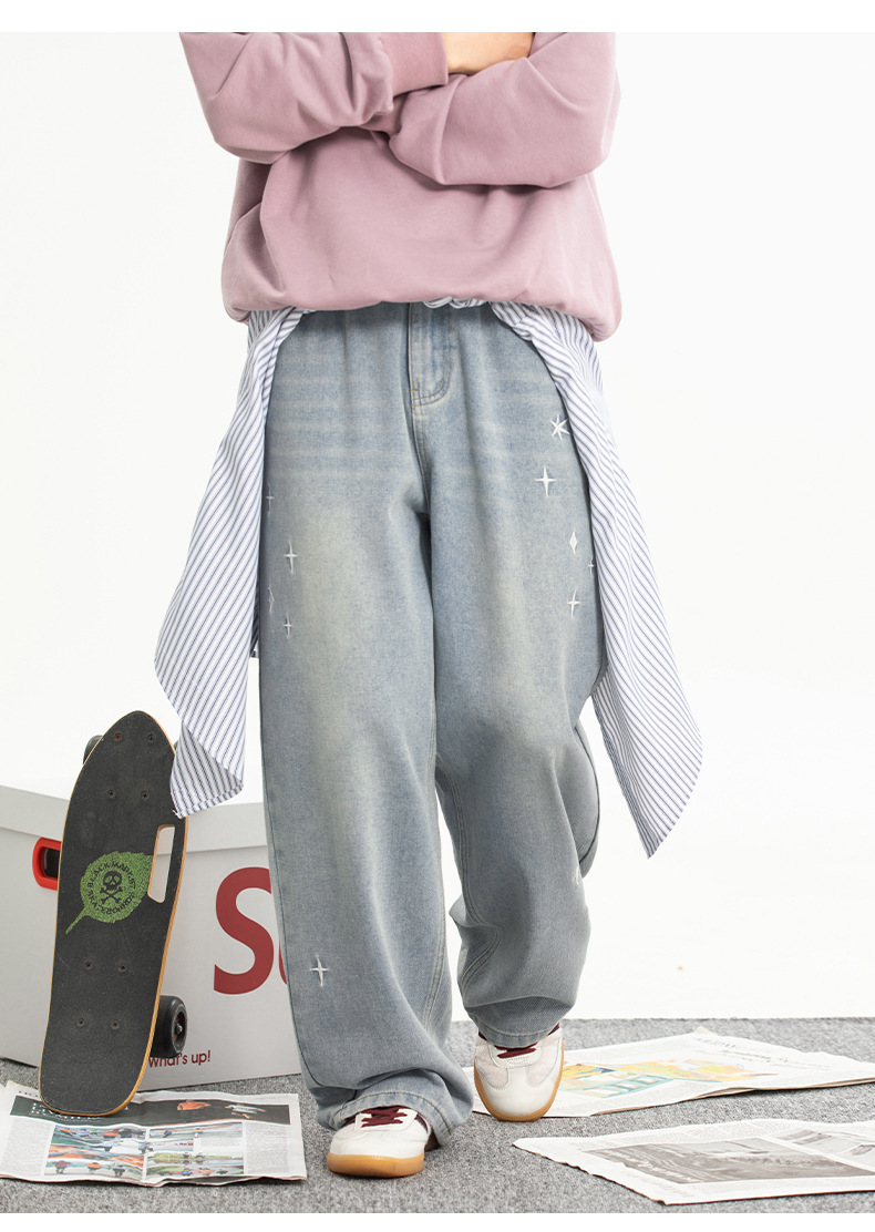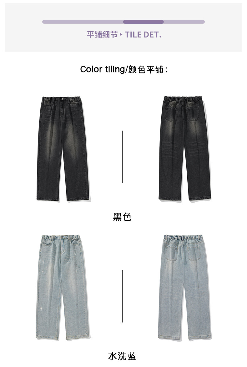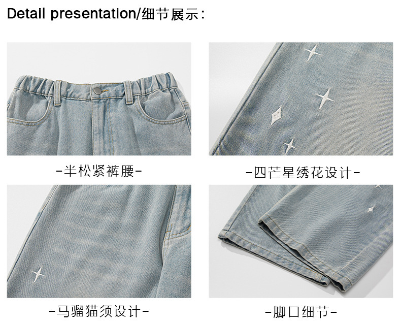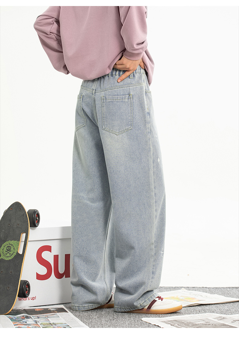 디스트레스드 워싱 스트레이트 청바지 2025 봄 신작 일본식 루즈 반탄성 허리 질감 자수 바지 q