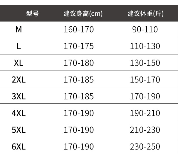 | 尺码 | M(建议90-110斤), L(建议110-130斤), XL(建议130-150斤), 2XL(建议150-170斤), 3XL(建议170-190斤), 4XL(建议190-210斤), 5XL(建议210-230斤), 6XL(建议230-250斤) | 是否跨境出口专供货源 | 否 |