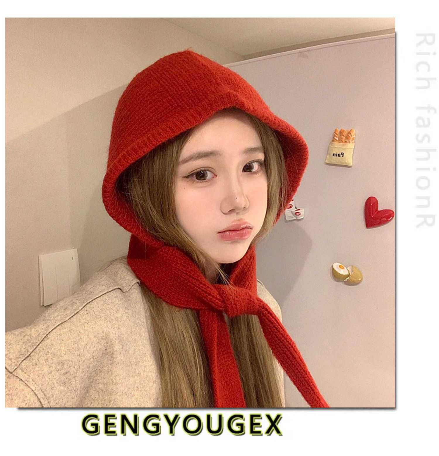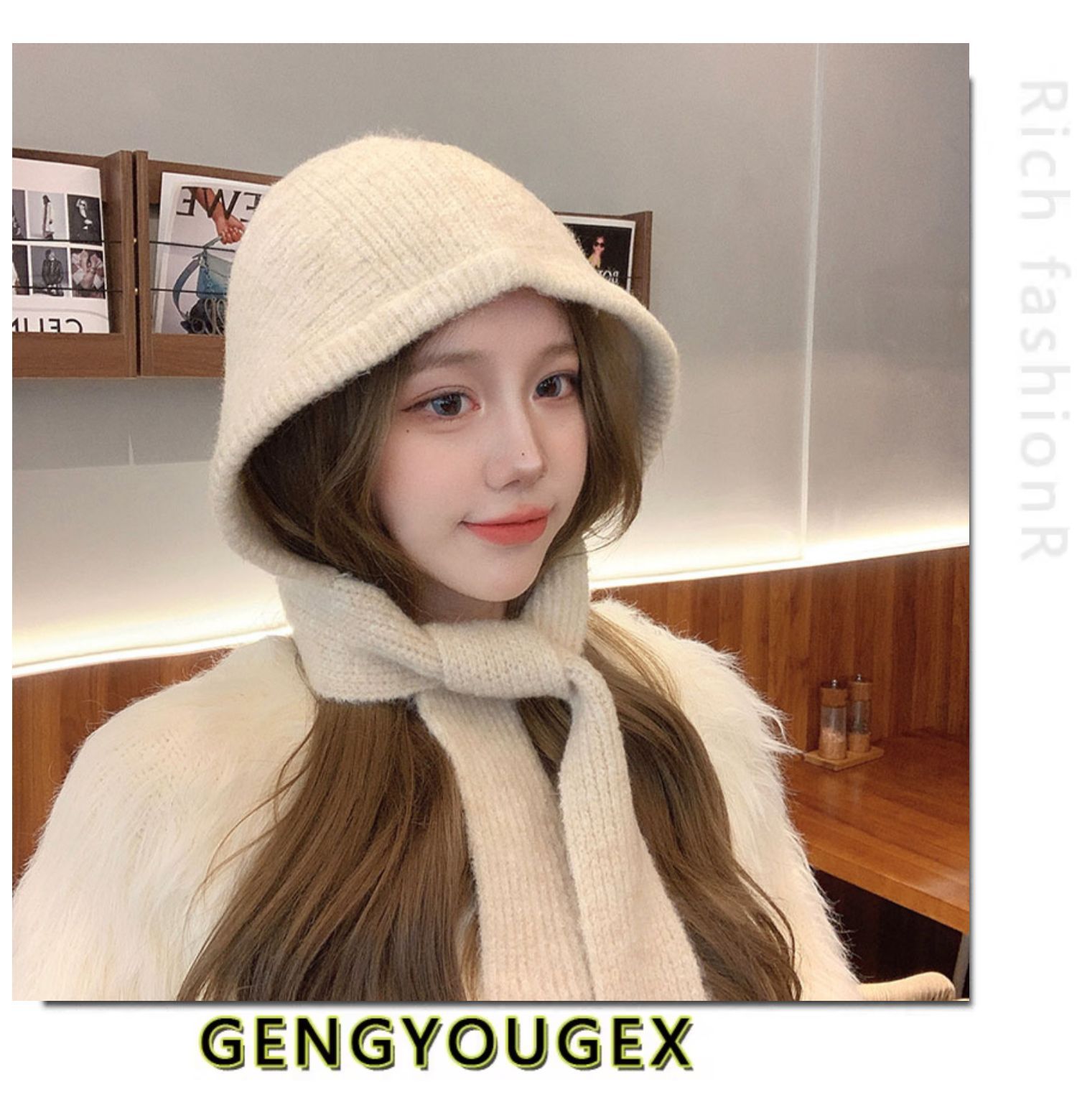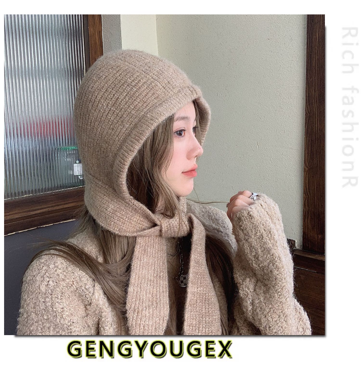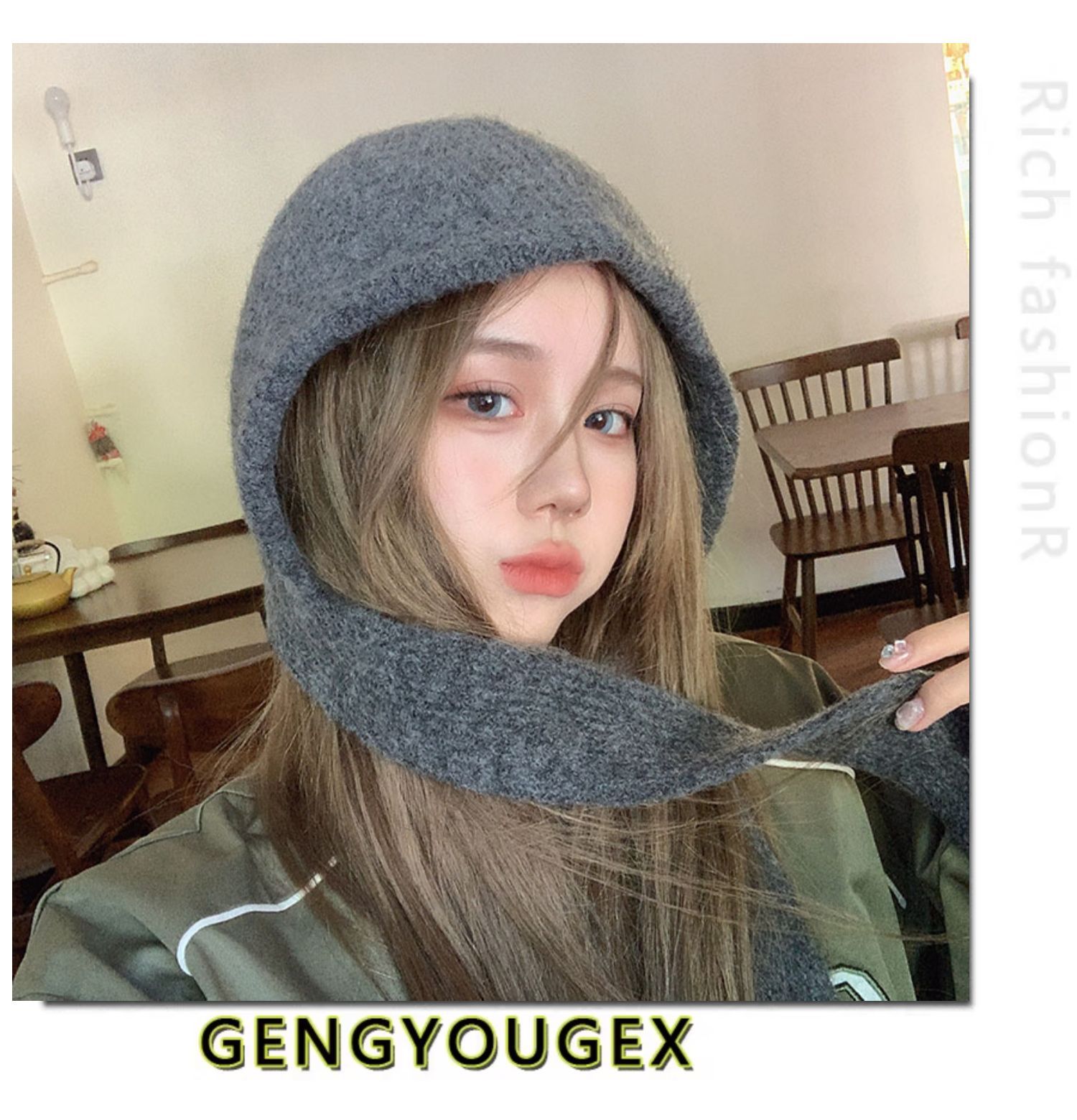 Balacon Raffia Hat 여성 가을, 겨울 한국어 버전 새로운 기능 따뜻한 귀 보호 모직 모자 스카프 올인원 다용도 트렌드