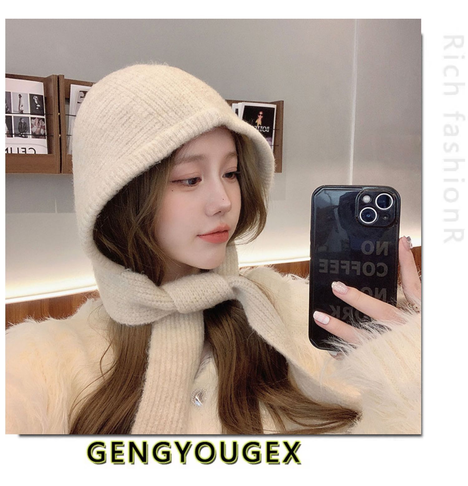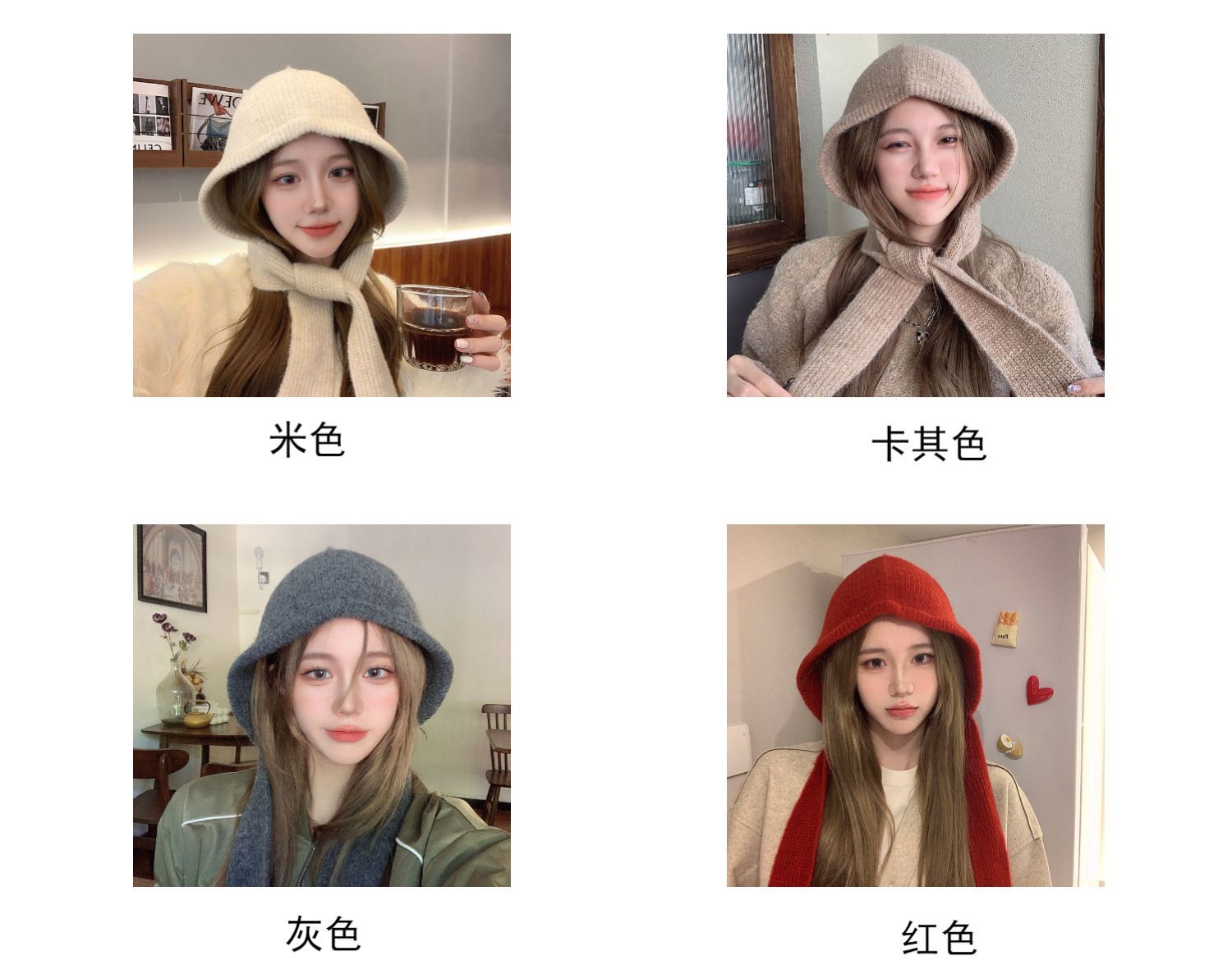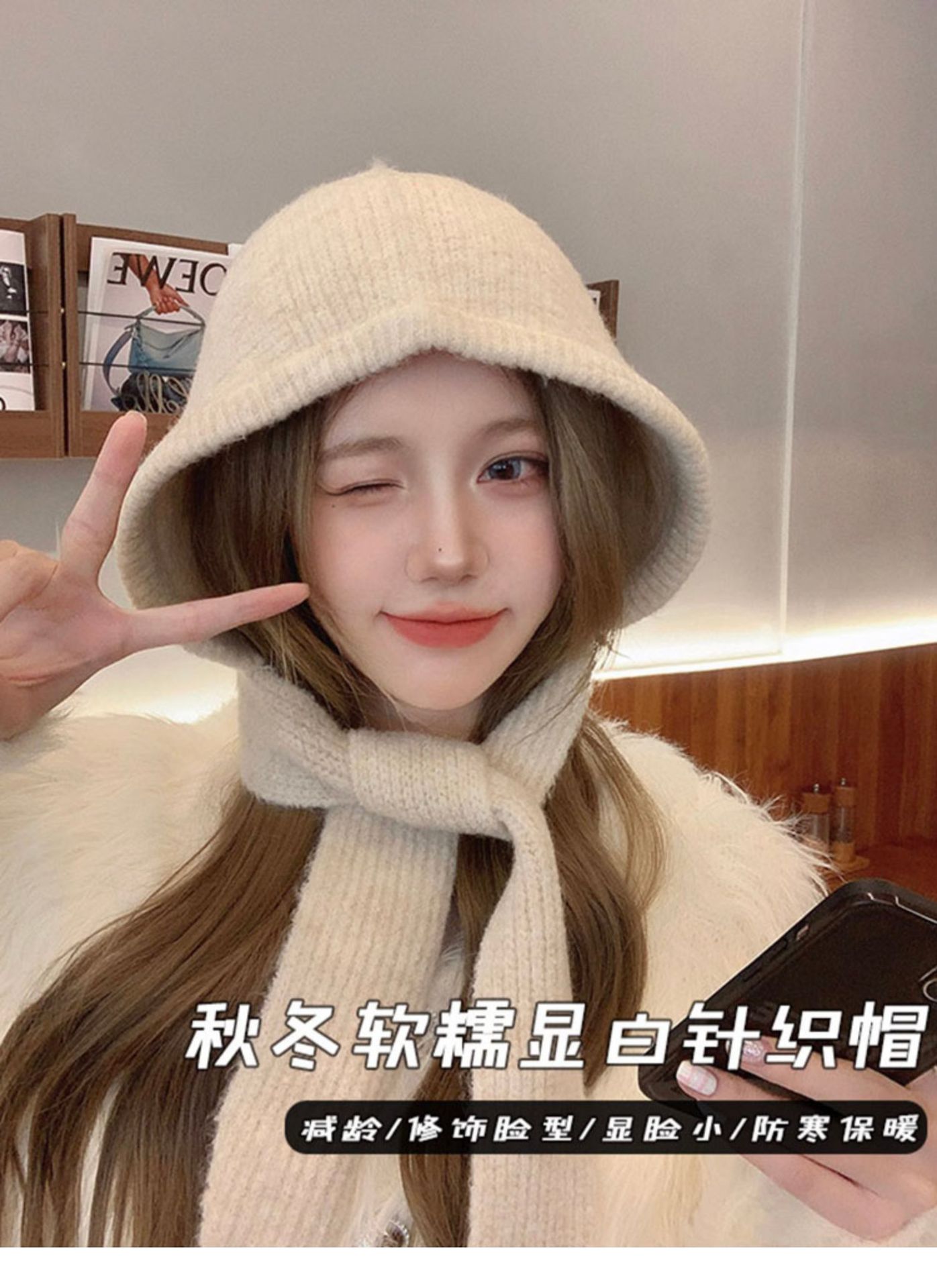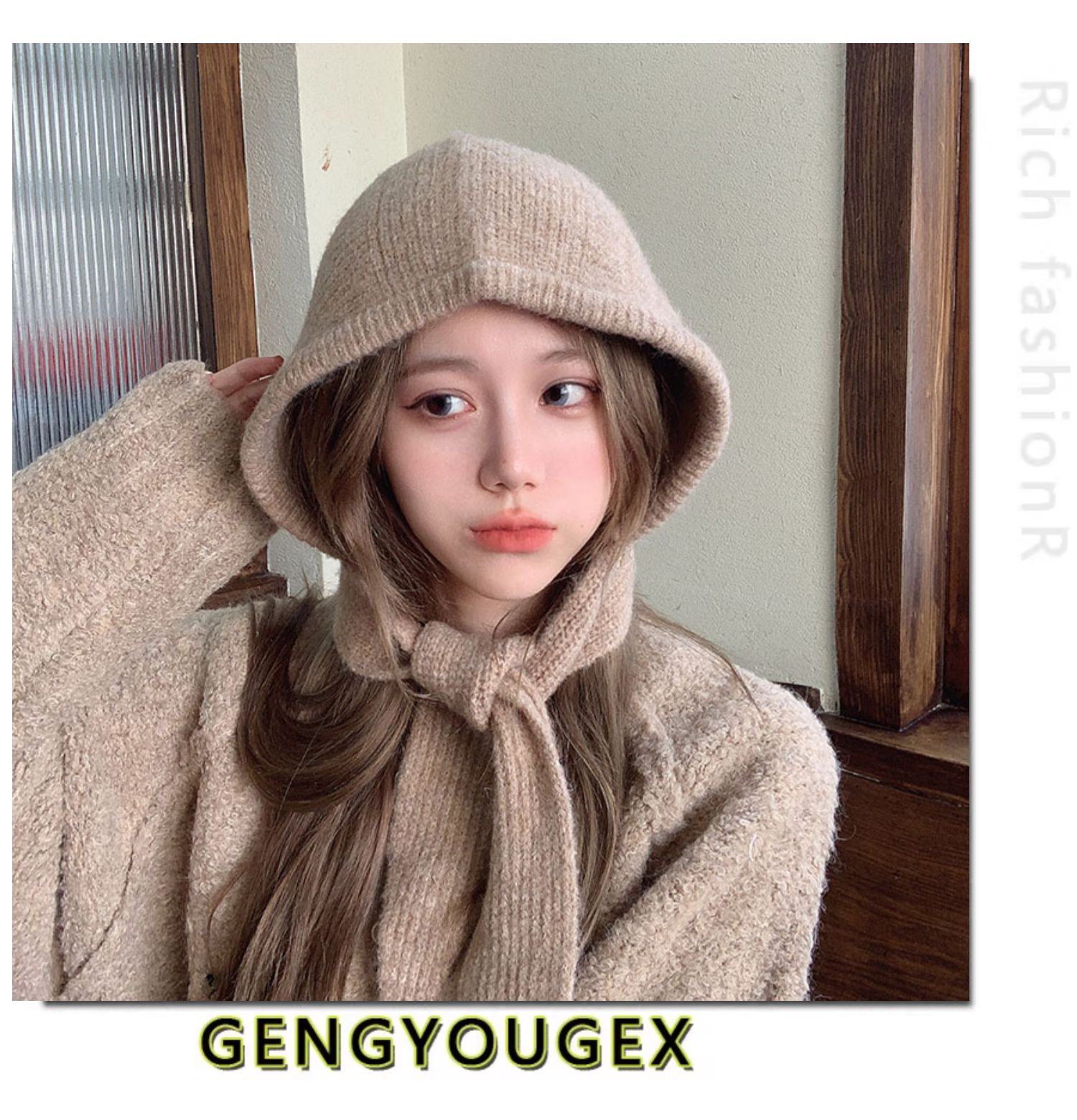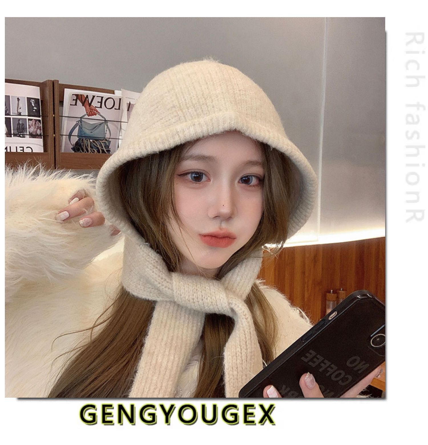 Balacon Raffia Hat 여성 가을, 겨울 한국어 버전 새로운 기능 따뜻한 귀 보호 모직 모자 스카프 올인원 다용도 트렌드
