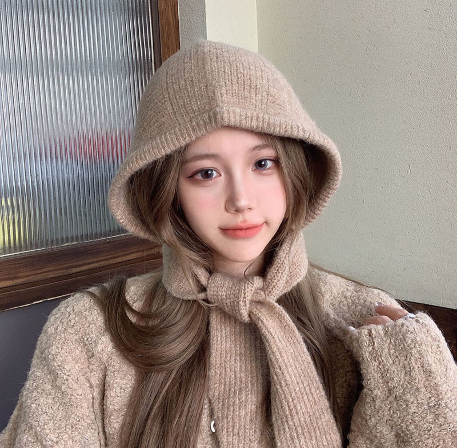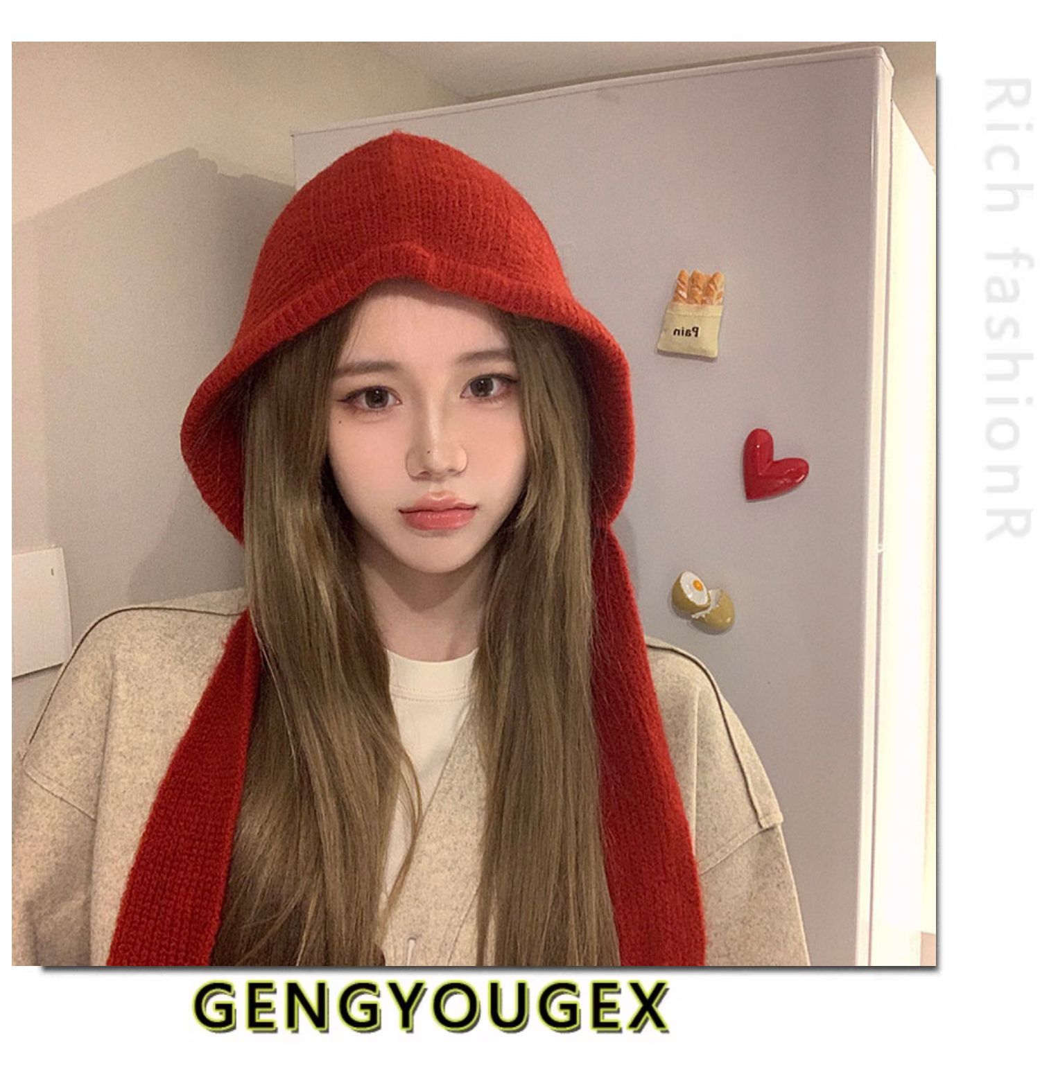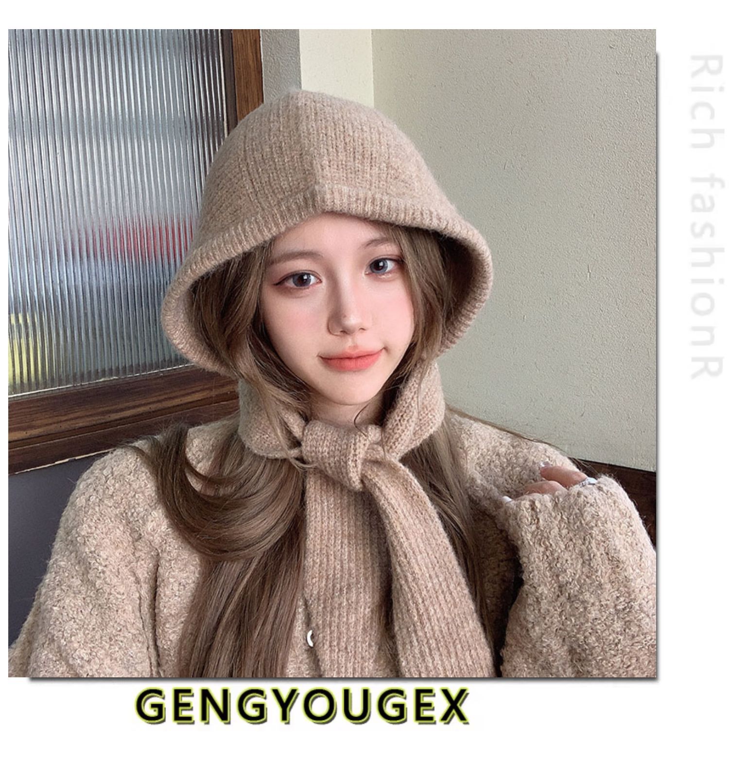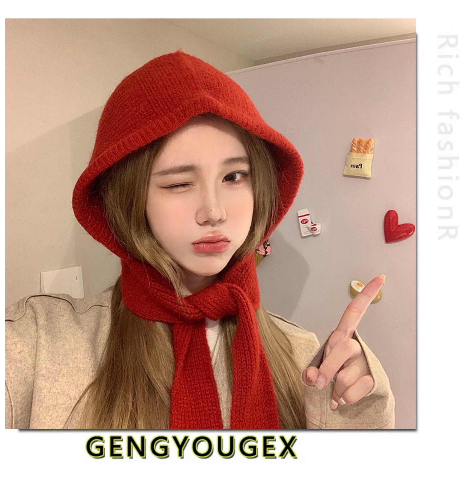 Balacon Raffia Hat 여성 가을, 겨울 한국어 버전 새로운 기능 따뜻한 귀 보호 모직 모자 스카프 올인원 다용도 트렌드