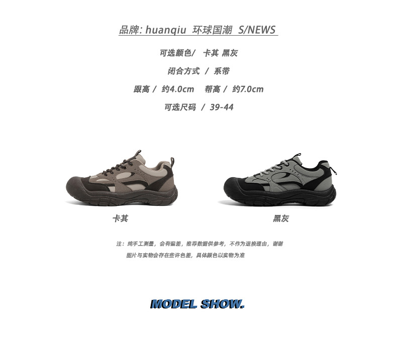 | 颜色 | 卡其, 黑灰 | 尺码 | 39, 40, 41, 42, 43, 44 |