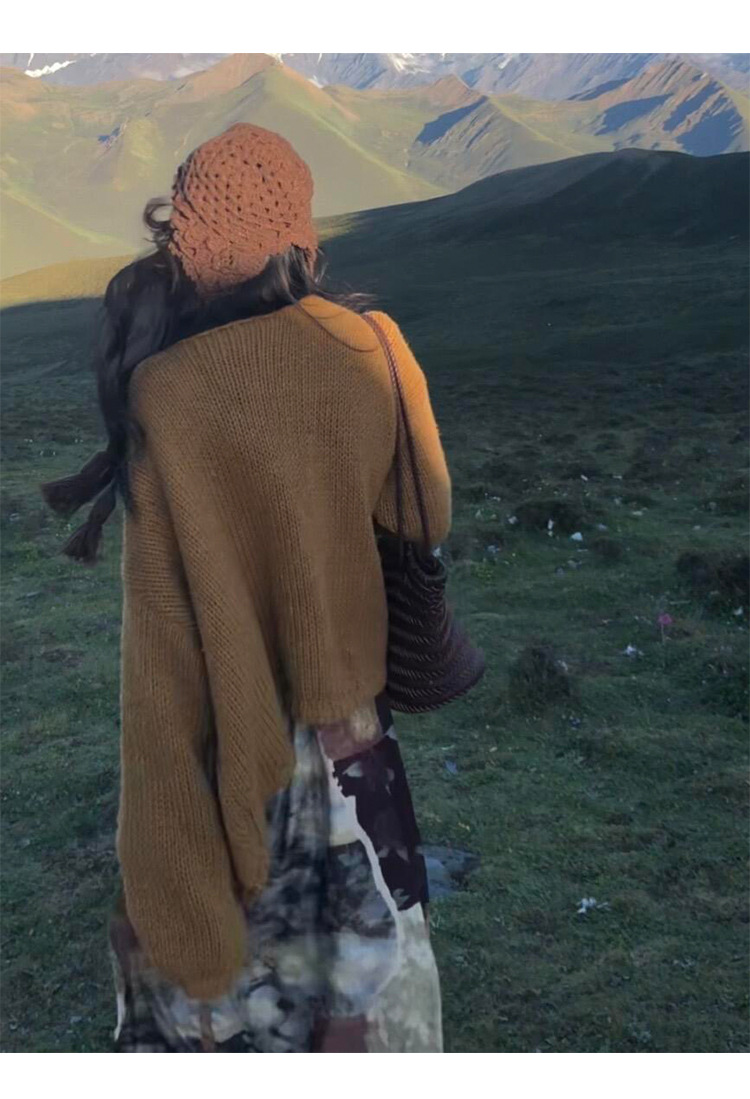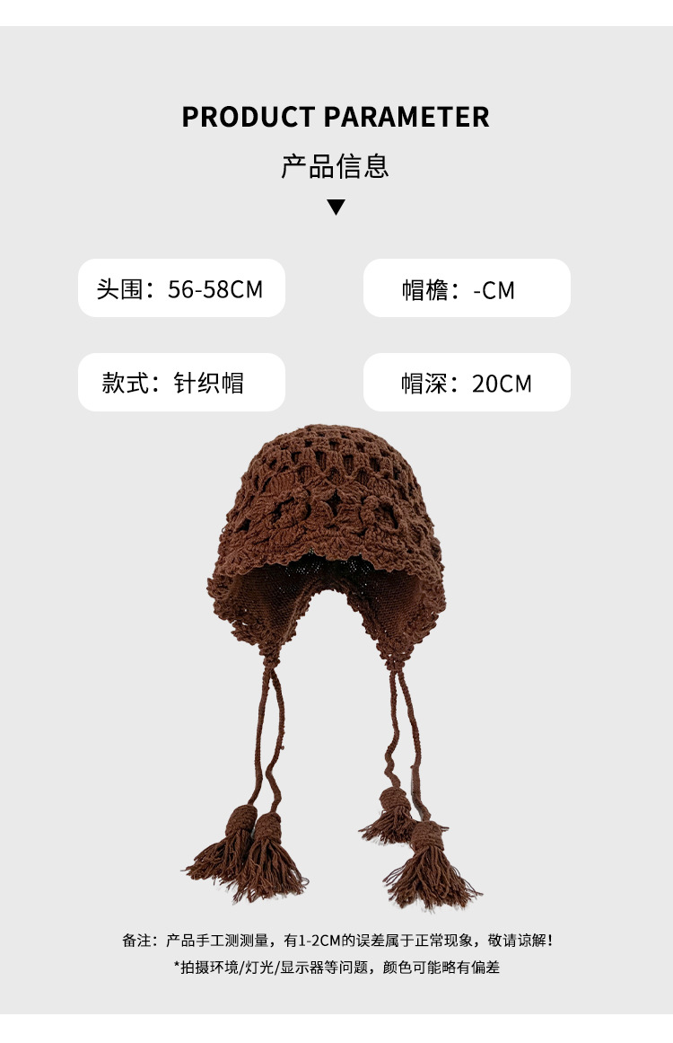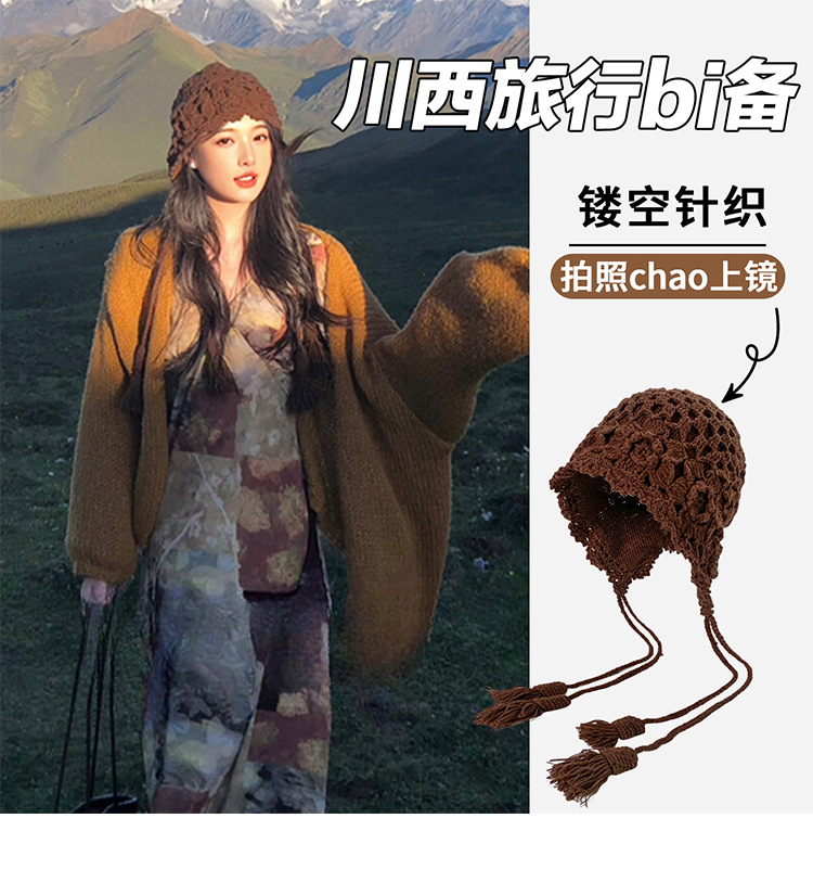 여성을 위한 Sichuan West 여행 꽃 태슬 중공 풀오버 모자, 손으로 뜨개질한 큰 머리 둘레, 얼굴이 보이는 작은 니트 토 모자