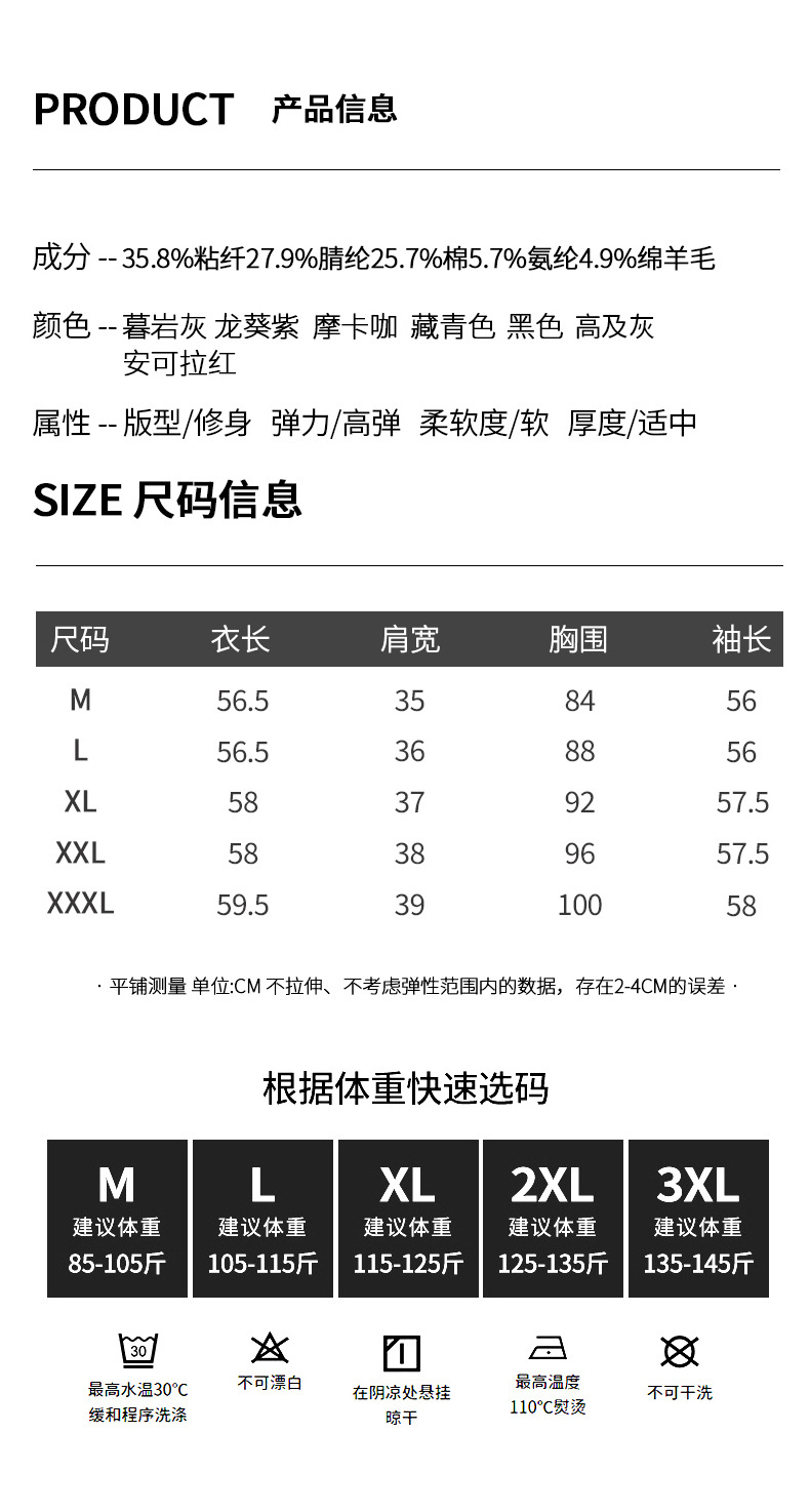 | 颜色 | 摩卡咖, 高级灰, 白色, 黑色, 藏青, 龙葵紫, 安可拉红, 暮岩灰, 摩卡, 奶盖紫, 天空蓝, 太妃灰 | 尺码 | M, L, XL, XXL, XXXL |