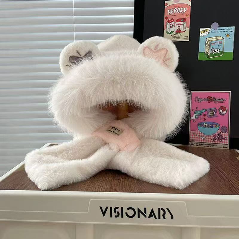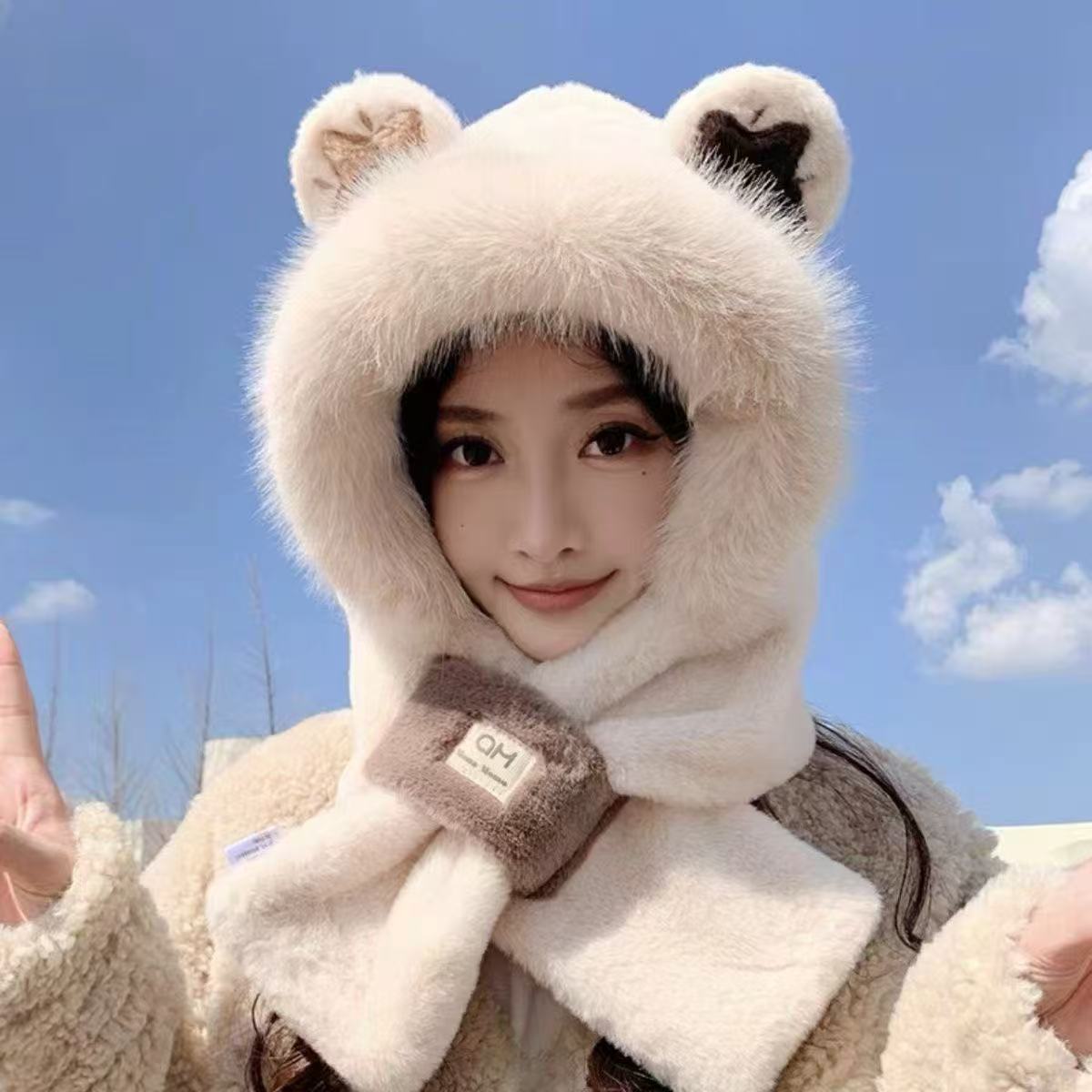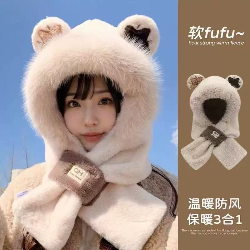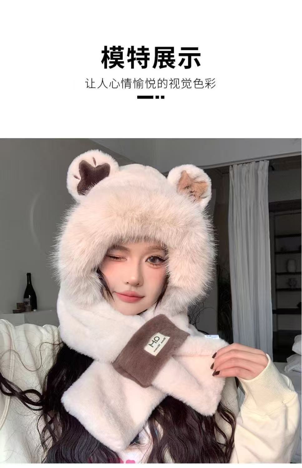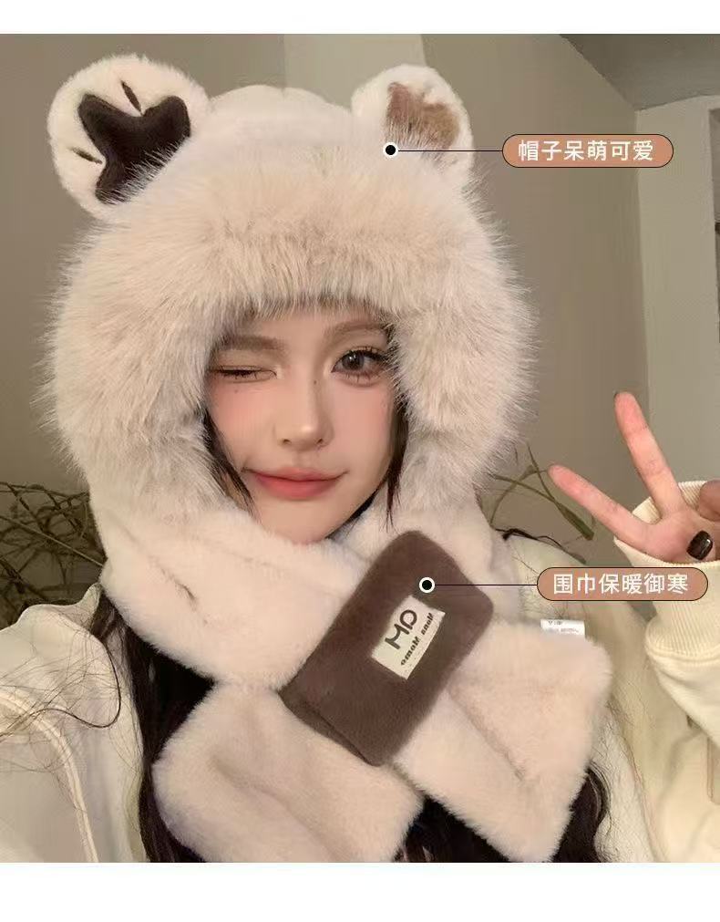 겨울 방한 귀여운 곰 모자와 스카프 여성용 투피스 세트 플러스 벨벳 두꺼운 따뜻한 플러시 모자 후드 스카프